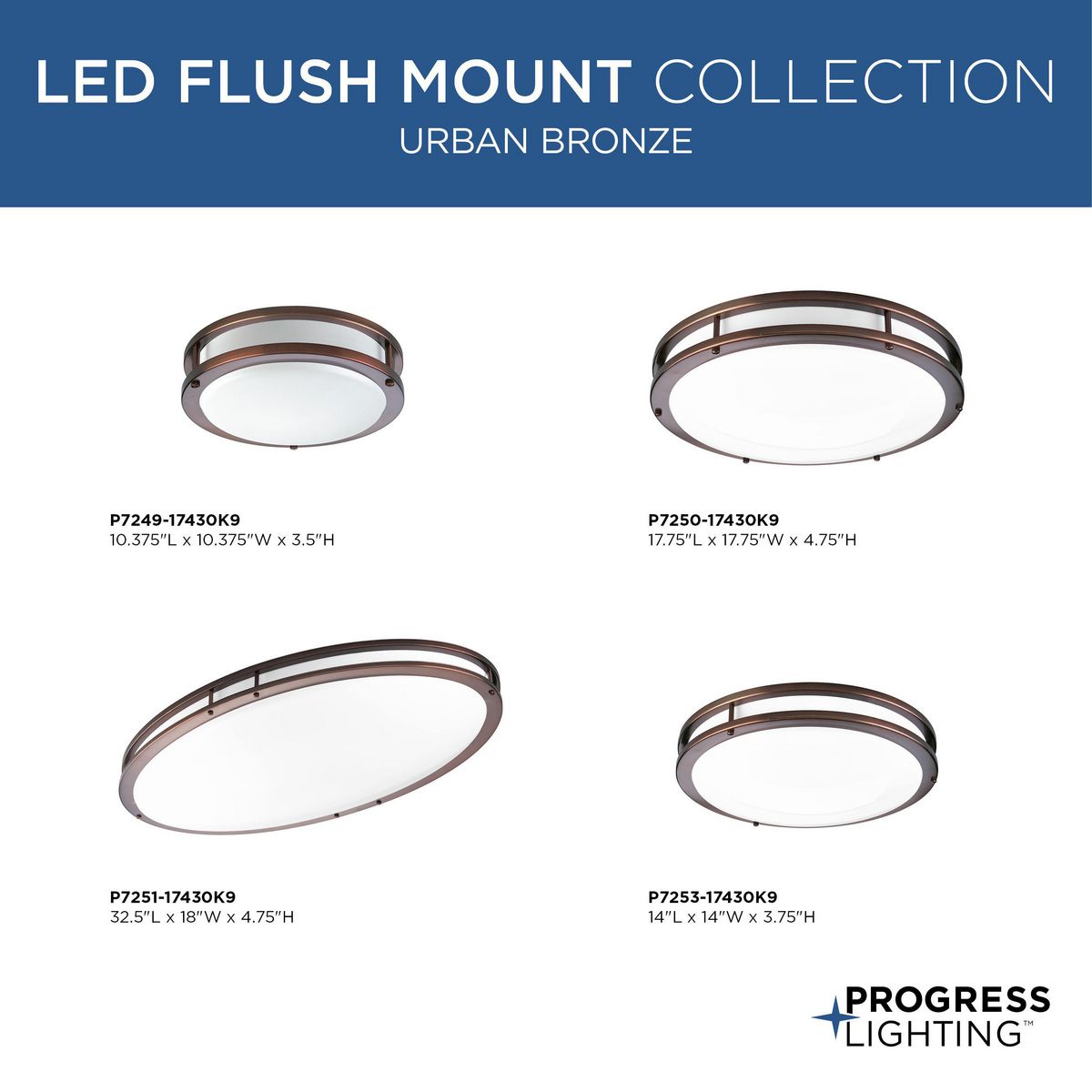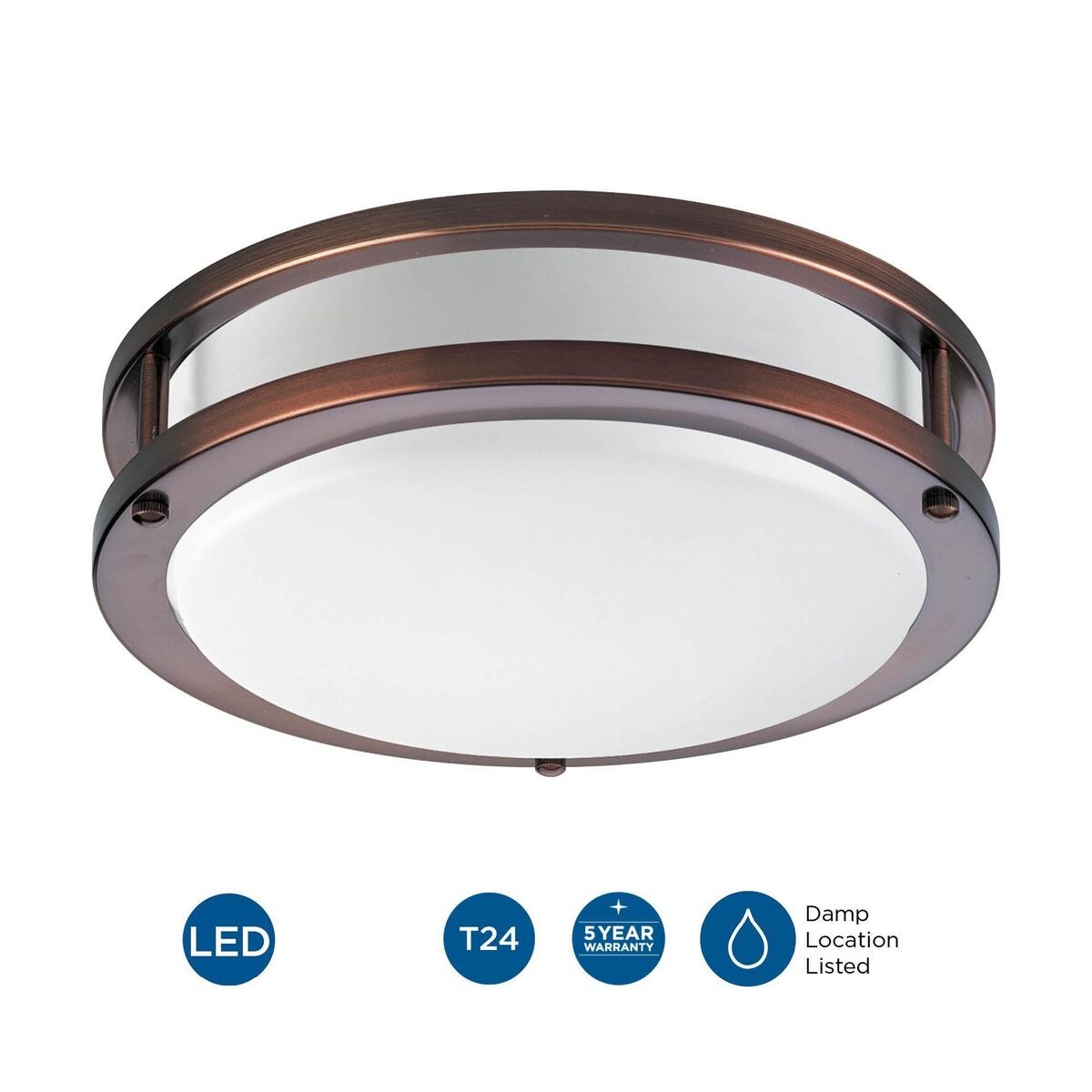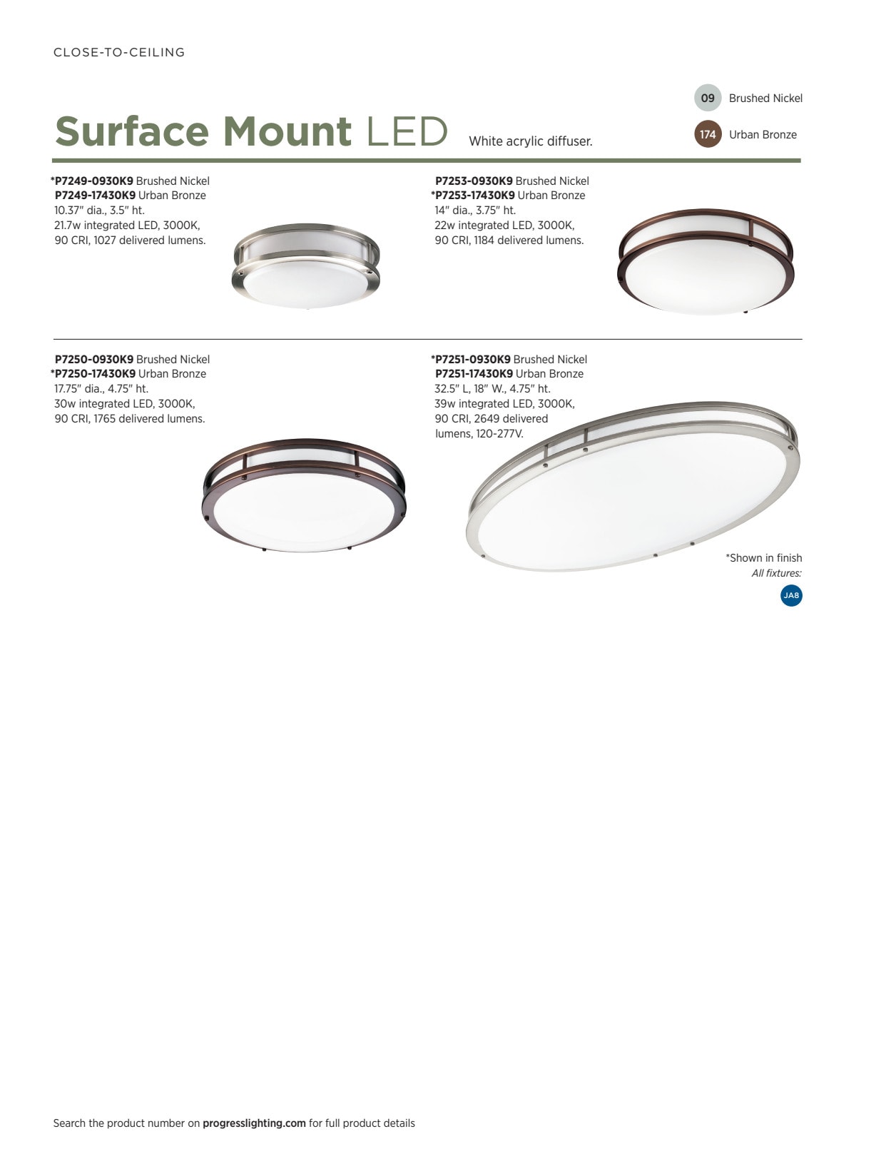 One-Light Urban Bronze LED close-to-ceiling. Surface mount round with clean modern lines and white acrylic diffuser. DC LED light engine with 1027 delivered lumens at 3000K and 90+ CRI.