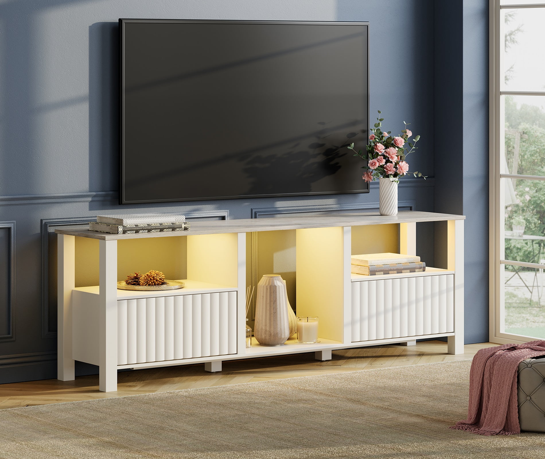 【LED Lights TV Stand】This fireplace televison stand with led features with led system. It will make your entertainment life more dynamic and can match atmosphere of your room. 【Suitable for 75 inch TV】The led media stand is made of premium-quality particle board material and extra thickened legs makes it more stable and sturdy. Last for years of use. The TV stand can hold a flat screen TV up to 75-80 inch. 【Electric Fireplace Insert】The black fireplace TV stand with 18” electric fireplace can be used WITH or WITHOUT heat. You can put the fire place to bring warmth to the cold winter. 【Premium Material】Crafted of selected P2 MDF material without any smell and no harm to human body, the fireplace entertainment center offer a long service life. 【Easy Assembly & 2 Packages】The television stands and fireplace insert are shipped separately, so you may receive 2 packages at different times.