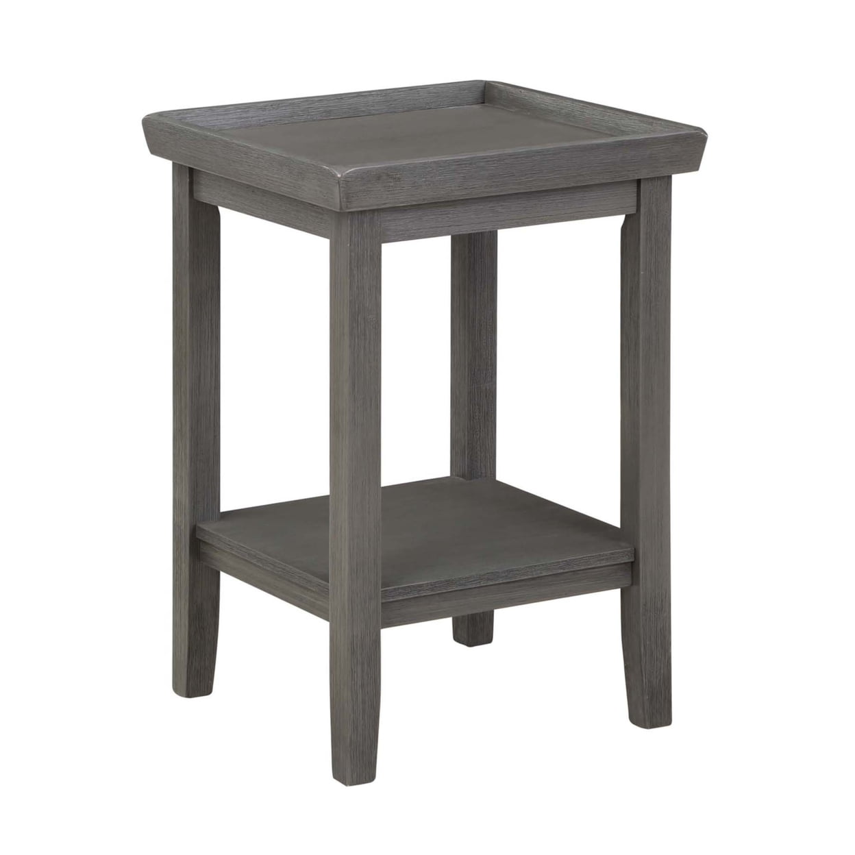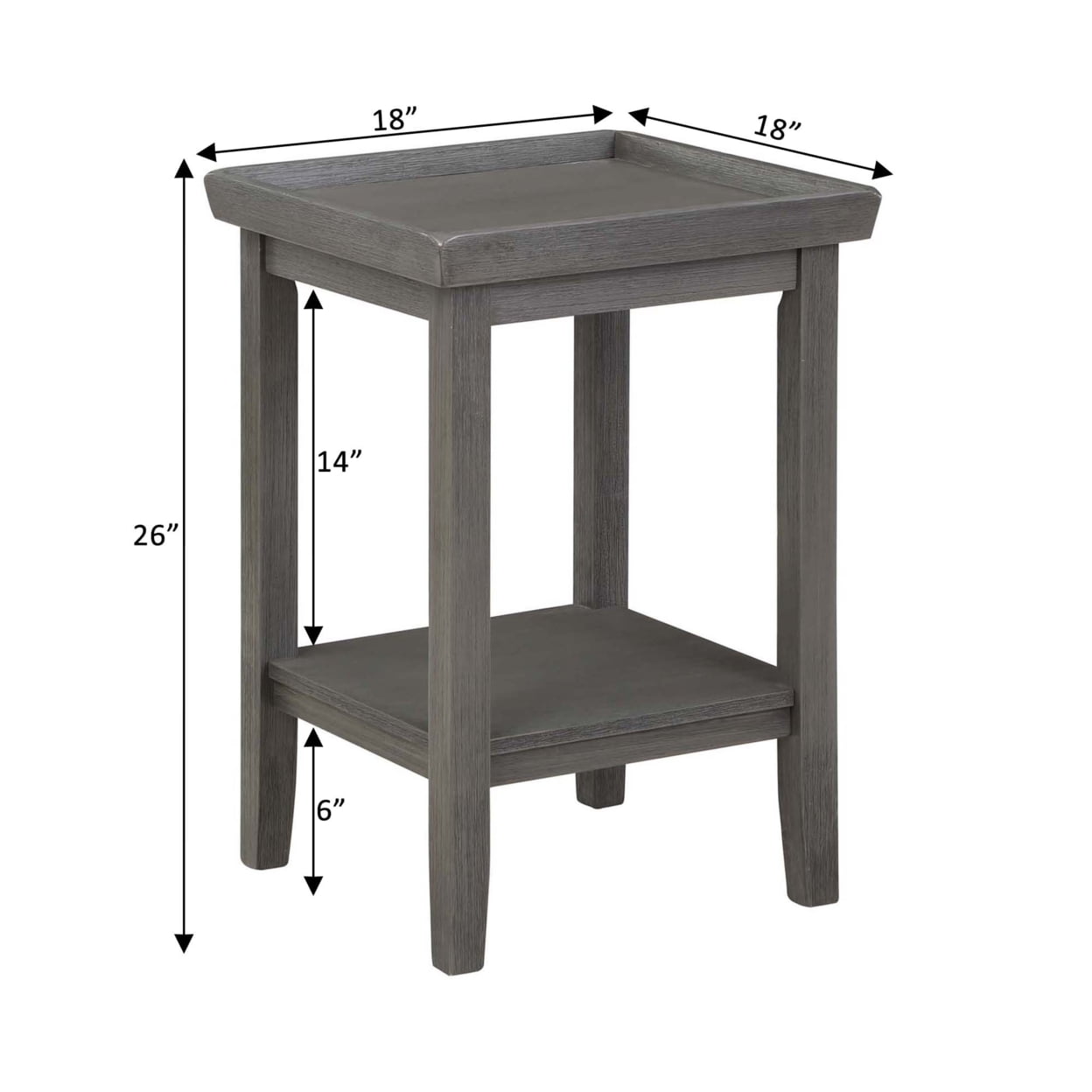 Ledgewood End Table with Shelf, Gray The simple look of the Ledgewood End Table with Shelf by Convenience Concepts will add charm to any room in your home. The traylike tabletop with raised edges will keep belongings safe and secure. Two additional tiers of shelving offer space for display, magazines, or storage. Clean lines paired with classic tapered legs gives this piece a traditional and timeless look. The legs of this table are crafted from solid rubberwood and support the finely crafted MDF shelves, all finished with a smooth rubberwood veneer. Match with coordinating pieces from the Ledgewood Collection by Convenience Concepts, each sold separately. Specifications: Part of the Ledgewood Collection Available in Multiple Finishes 2 Tiers of Spacious Shelving Built from Solid Rubberwood, Rubberwood Veneer, andamp; MDF (L) 18 in. x (W) 18 in. x (H) 26 in.