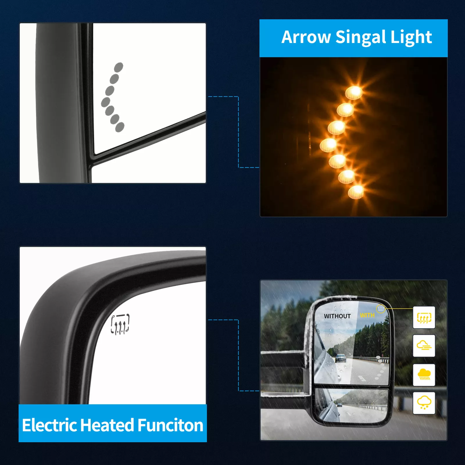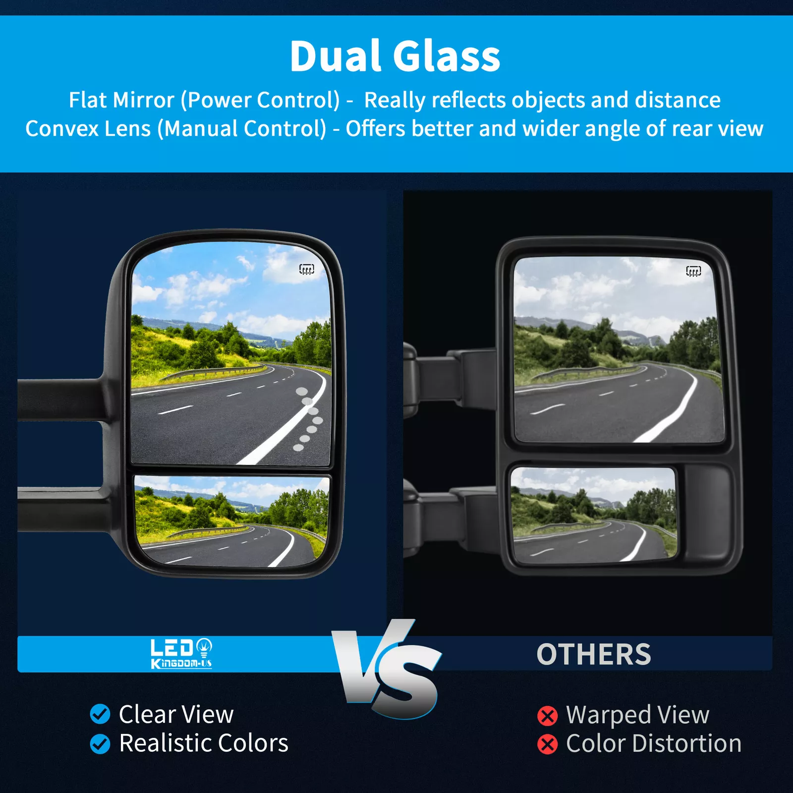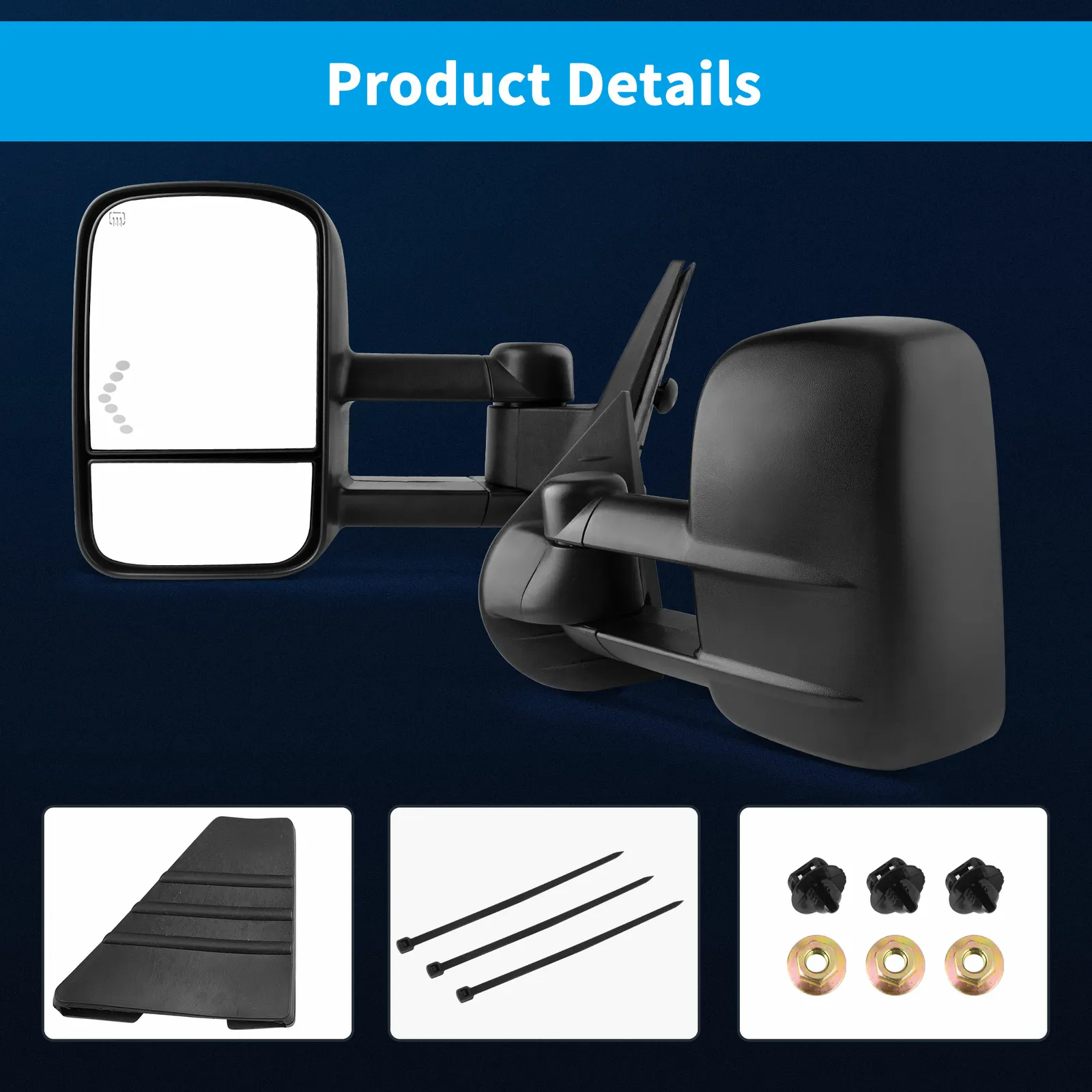 LEDKINGDOMUS’s Towing Mirrors were designed to fit a variety of popular Pickup and SUV models. The LEDKINGDOMUS Towing Mirror is durable, aerodynamic design, and is a perfect fit for your vehicle’s specifications. The LEDKINGDOMUS Towing Mirrors and installation knobs are made with durable ABS plastic known for their strength, rigidity, and unbreakable security. The mirror face is made with scratch-resistant glass for years of unobstructed towing use. LEDKINGDOMUS Power Heated LED Signals Towing Mirrors for 2007 – 2013 Chevrolet, GMC, Cadillac Silverado, Sierra, Pair Glass Size: 12 inches x 8 inches. Installation: support bracket and self-washer nut are included Come as a pair, fits both LH (Driver Side) and RH (Passenger Side) Power Operation- main mirror, Dual Arm Dual Glass – (Flat Glass, Convex Glass) Arrow Signal Light in Glass – as turn signal light Power Heated (works with the rear defrost like the original) and Telescoping, Aluminum Material Base Made by ultra-strong and lightweight black durable textured ABS plastic Convex glass Provides a better and wider angle of rear view. Top-quality reflective glass ensures less distortion. Built to strict quality control standards. Dramatically Improve styling and appearance. Professional installation is highly recommended.