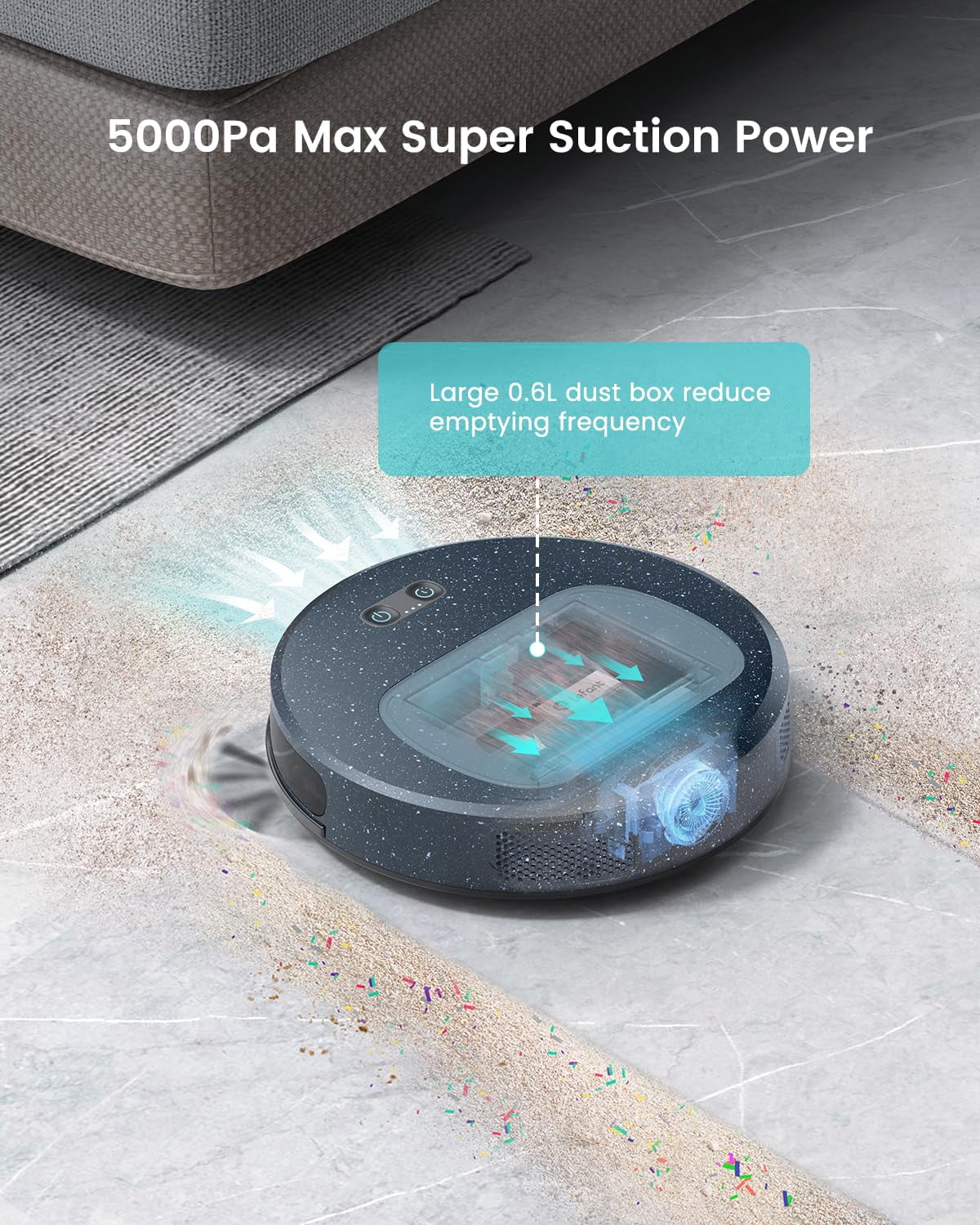 5000Pa Powerful Suction 2-in-1 Robot Vacuum & Mop Combo 4000mAh high-capacity battery 250mins Max Long Runtime Dual Side Brushes & Brushless Motor PSD Obstacle Avoidance & 190° Field of View 9 Built-In Position-Sensitive Sensors FreeMove 3.0 technology Durable Dual-layer Filter Alexa/APP/Vioce Control (2.4G Wi-Fi Only) 55 dB Low Noise Ultra-thin Design Cover 2200+ ft² 600ml Large Dustbin 3 Adjustable Modes 12 Month Warranty Randonm Mode/Zigzag Mode/Spot Mode/Edge Mode Remote Smart Control/Scheduled Cleaning Real-Time Path Tracking/Cleaning History