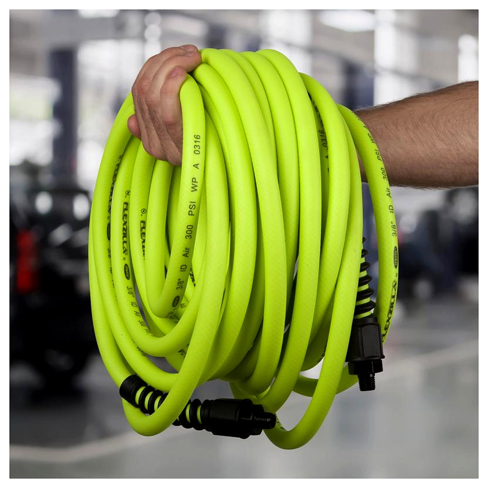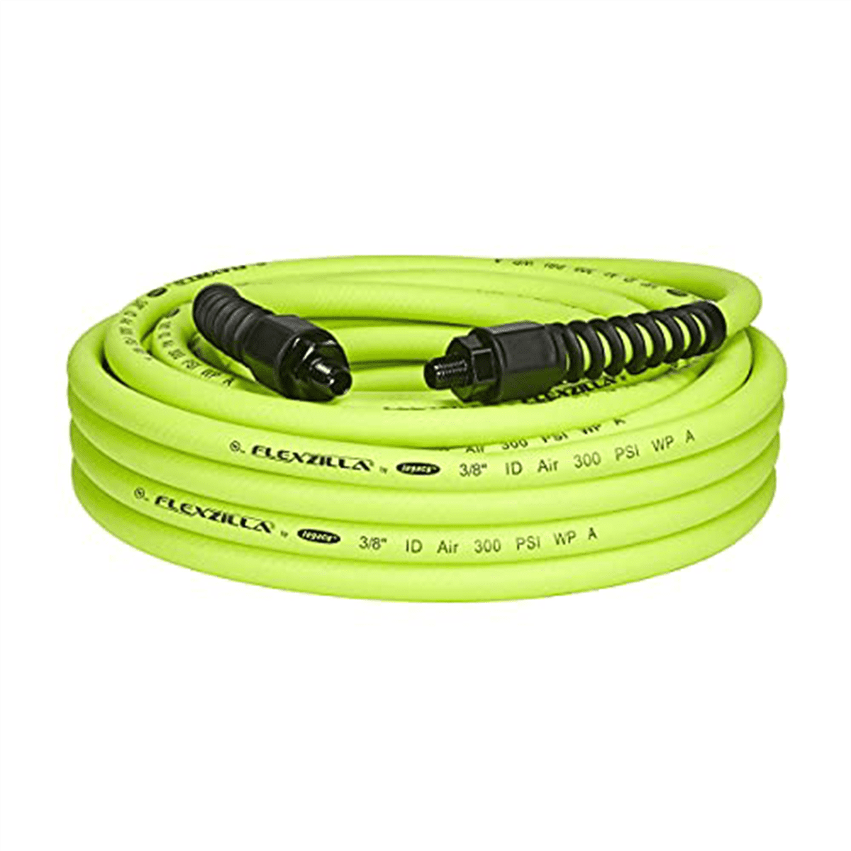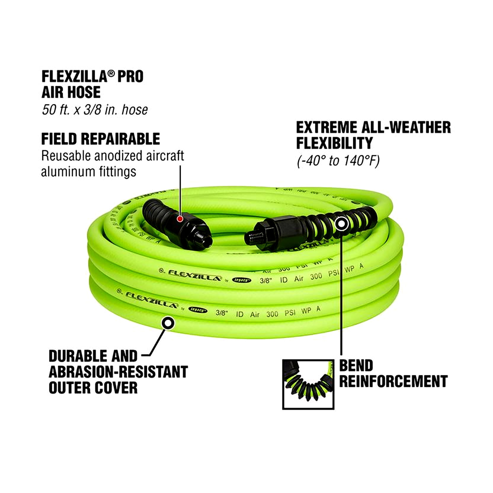 Field repairable with reusable anodized aircraft aluminum fittings Extreme all weather flexibility, even in subzero temperatures ( 40 degrees to 140 degrees Fahrenheit) Excellent bend radius Won’t kink under pressure Lays flat no memory Durable and abrasion resistant outer cover Includes spiral bend restrictors for increased flexibility Specifications: Material: 1/4 inch MNPT Temperature range: 11 degrees Fahrenheit Reel inlet: 11 Hose outlet: 3.5 Color: ZillaGreen Maximum working pressure at 70 degrees: 300 PSI Product/Item Type: Air Hose Color: ZillaGreen Dimensions (L x W x H): 3/8 inches wide, 50 feet long Weight: 5 lbs Warranty: 2-year warranty