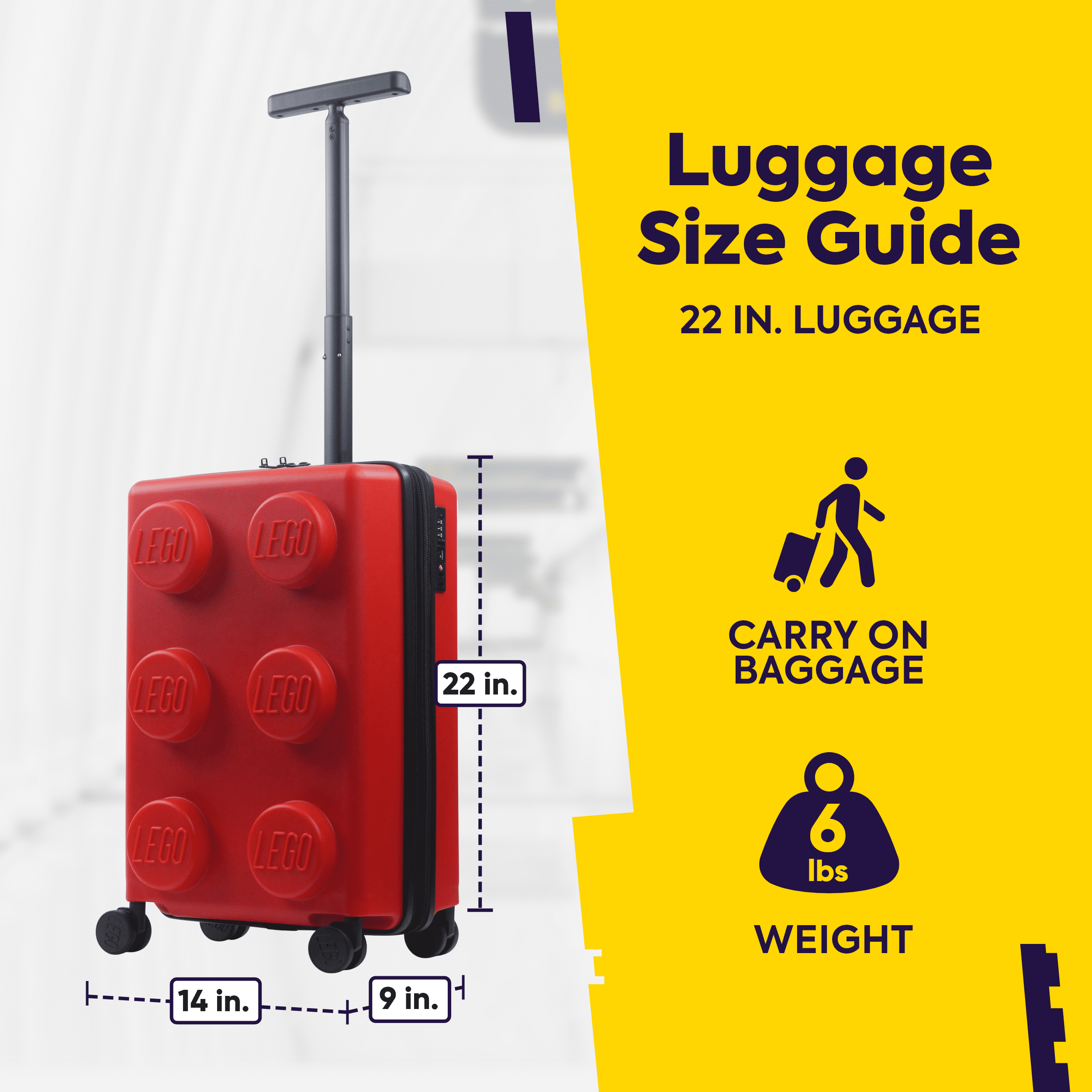 This cute and stylish hardshell luggage features a distinctive LEGO brick design, making this a perfect gift for the LEGO fan in your life, and is perfect for all of your travel needs, with dual zippers to keep your valuables safe and secure inside; this hardshell luggage carrier meets most airline requirements for carry-on luggage and fits into most overhead bins, and features a TSA combination lock to keep your valuables secure inside Hard luggage features a sizable polyester-lined main zip compartment divided for easy packing of your belongings, a small mesh compartment for small accessories, and an clothing compression strap to keep clothing from wrinkling; expandable for more space with a 2 inch zipper gusset Wheeled luggage features a lightweight upright design with eight 360-degree silent-glide spinner wheels, and features a top carry handle for easy loading into trunks, cars and overhead bins; features a top retractable handle which allows for effortless movement during travel Travel luggage bags feature a hard shell polypropylene plastic case which protects your luggage and are easy to spot clean; officially licensed LEGO product ensures that you are receiving quality LEGO hardside luggage Lightweight luggage spinner suitcases measure 22 H x 14 W x 9 D in inches, and weighs 6 lbs