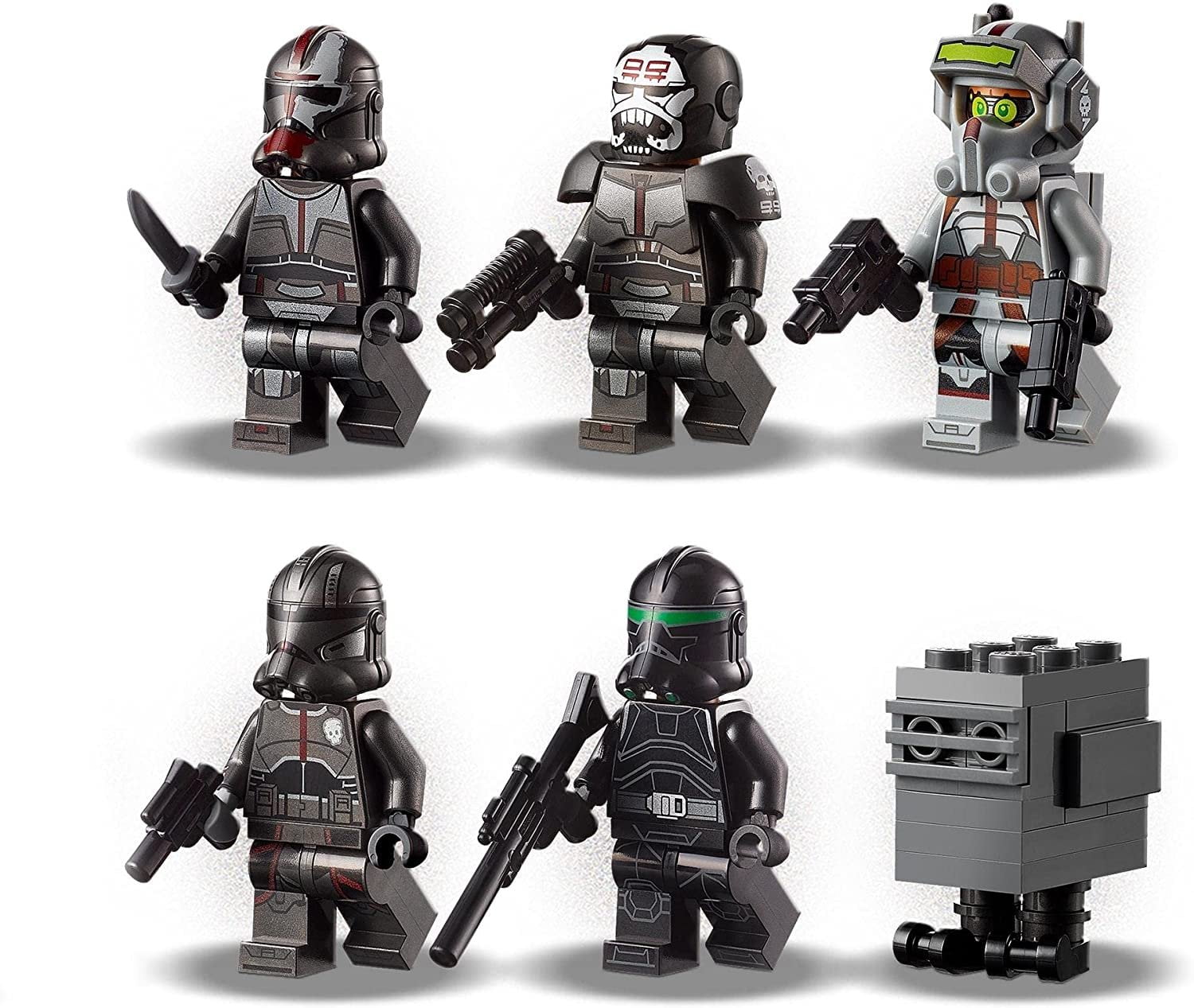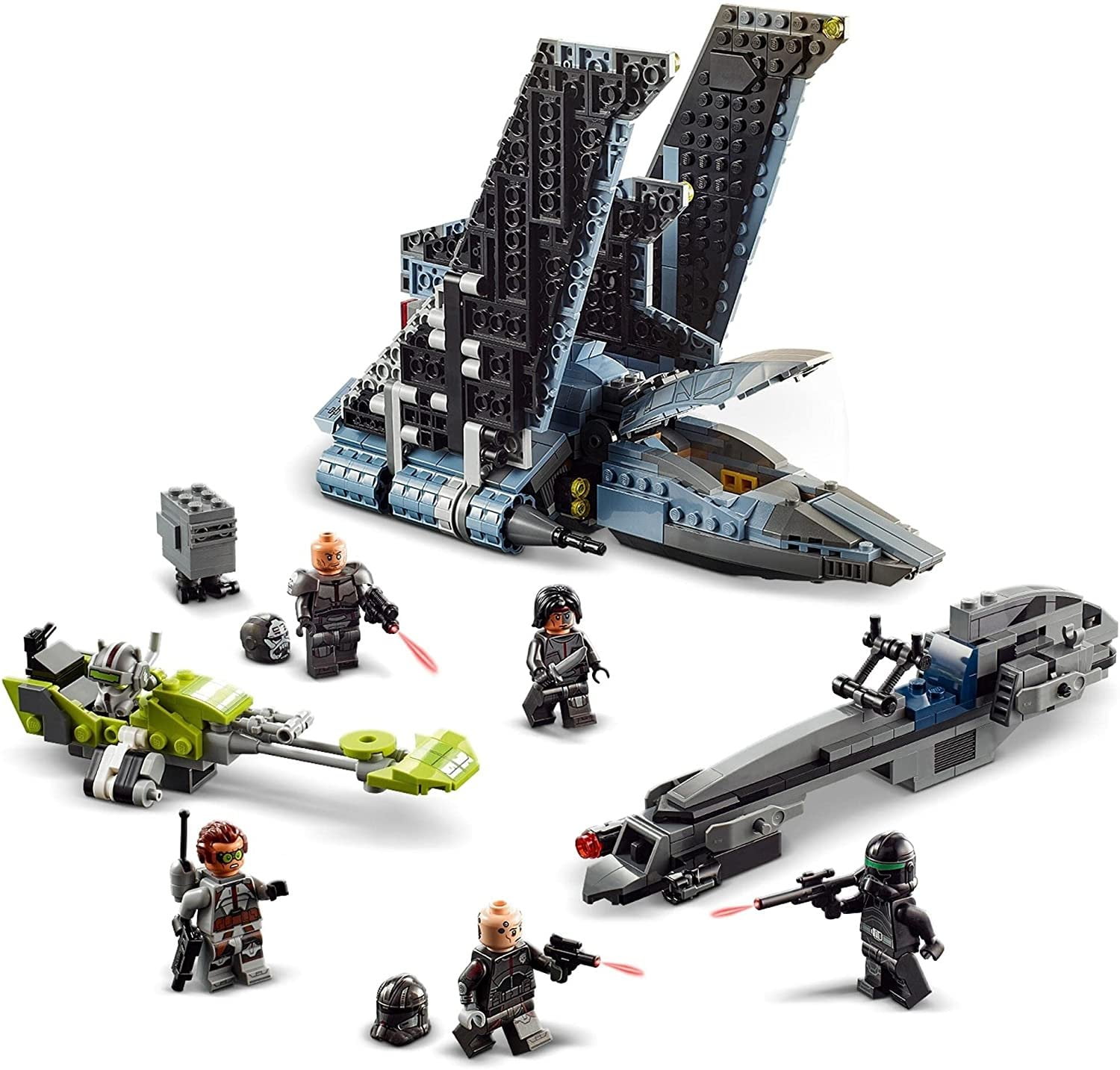 This detailed, Star Wars buildable toy is a LEGO brick version of an Attack Shuttle with adjustable wings, from Star Wars: The Bad Batch Features 2 spring-loaded shooters and a dorsal fin that lifts for easy access to the dual LEGO minifigure cockpit and detailed cabin The buildable shuttle toy’s adjustable wings move for landing/flight action and the cabin has space for 2 minifigures and a weapons storage The set also includes a speeder with 2 stud shooters and another speeder with a clip for a blaster to add to the play possibilities Includes 5 new-for-August-2021 LEGO Star Wars minifigures of Bad Batch clones Tech, Echo, Hunter, Wrecker & Crosshair with assorted weapons