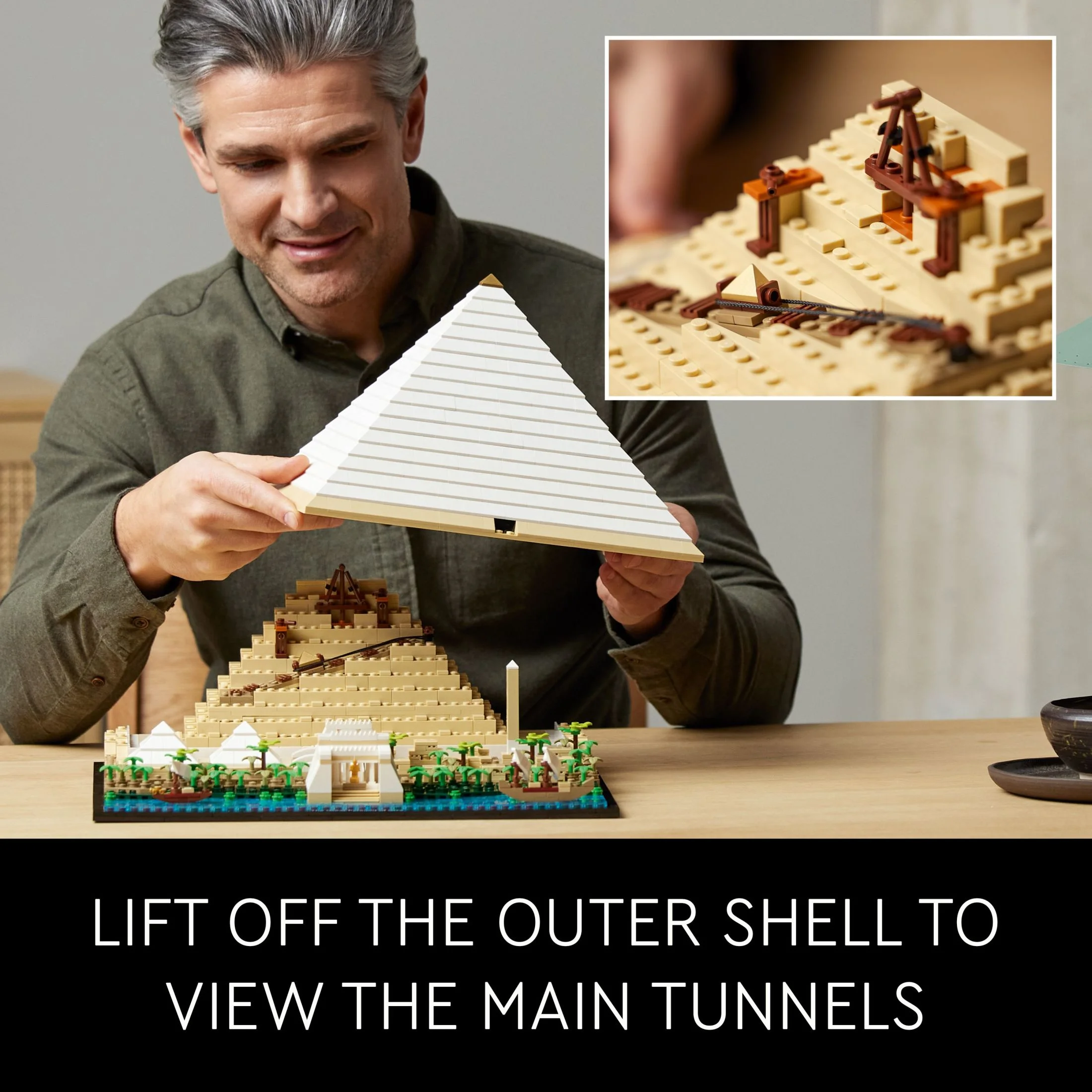 Take an imaginative leap back in time to the 26th century BC and experience the building of one of the Seven Wonders of the Ancient World with this LEGO Architecture Great Pyramid of Giza (21058) model building kit for adults. This model contains everything you need to build the pyramid and its surroundings. See what the area along the Nile River is believed to have looked like in ancient times. With this LEGO famous landmarks set you can build a beautifully detailed cross-section model of the Great Pyramid, revealing its main tunnels and chambers. Lift off the outer shell to reveal the stone-moving system that may have been used to move huge stones during its construction, or view from the back to see the King and Queen’s Chambers and main tunnels. Also included is a section of the Nile river with 2 LEGO brick versions of feluccas (ancient boats), 2 small pyramids, 2 mortuary temples, Sphinx statue, a workers’ village and an obelisk. Clear instructions are included to guide your DIY building adventure and your creation can be connected to a second model (sold separately) for a full pyramid shape. This brick-built collectible is part of a range of LEGO Architecture sets for adults who enjoy creative hobbies. It makes a wonderful treat for yourself and an impressive gift for an architecture connoisseur, history buff or travel lover. Measuring over 8 in. (20 cm) high, 13.5 in. (35 cm) wide and 12.5 in. (32 cm) deep. Contains 1,476 pieces.