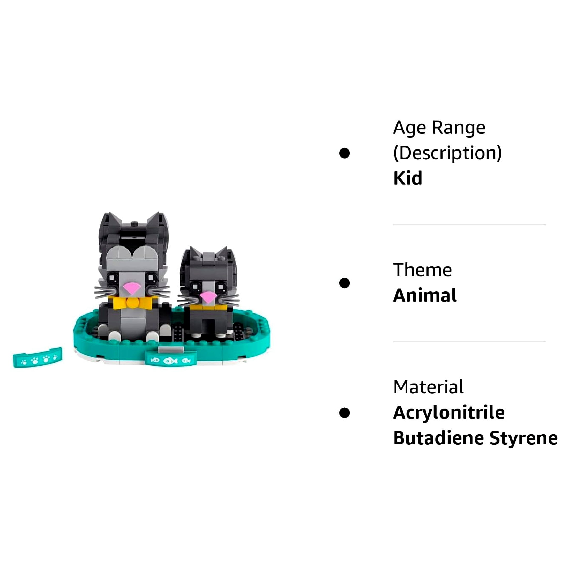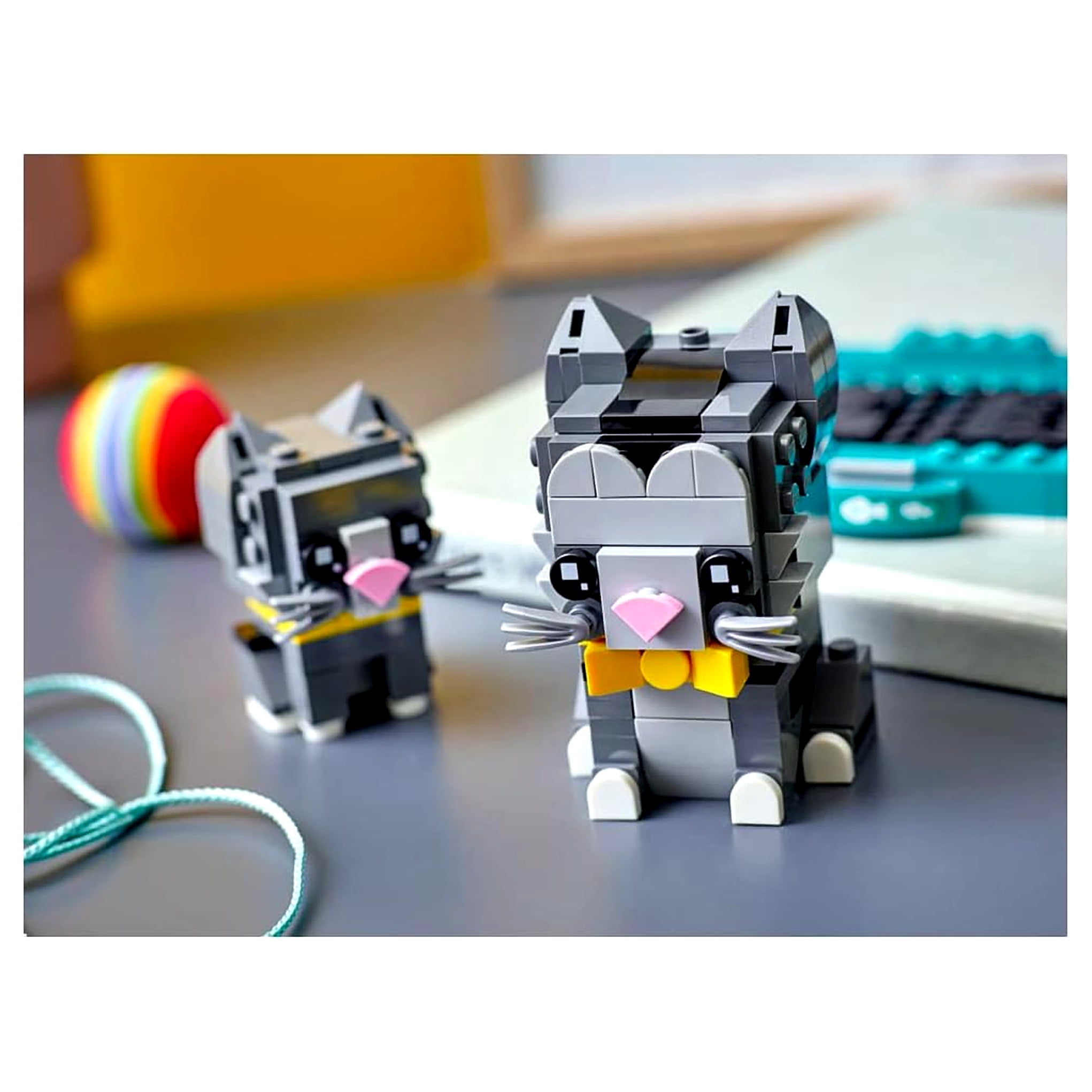T his BrickHeadz cat and kitten, build-and-display set will have cat fans purring with delight. The adult shorthair cat wears a bow tie, has a movable tail and sits next to a cute kitten on a sturdy baseplate in a decorated basket. This buildable pet set is a great gift for all kids, BrickHeadz collectors and anyone who loves cats. Collectible construction set featuring fun LEGO BrickHeadz models of a shorthair cat and kitten sitting together in a basket. Standing over 3? (8cm) tall, this 250-piece model features a bow tie, movable tail and a decorated basket. A great gift for LEGO fans, BrickHeadz collectors and pet lovers aged 8 and up.