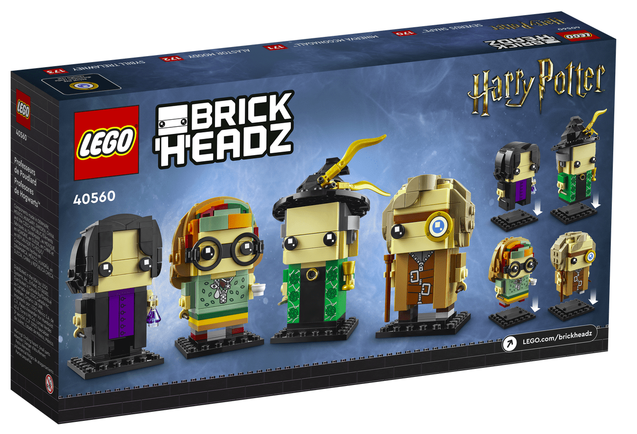 Gift for Harry Potter™ fans – LEGO® BrickHeadz™ Professors of Hogwarts™ (40560) presents buildable models of Professors Snape™, McGonagall™, Moody and Trelawney for young witches and wizards aged 10+ Authentic details – Snape wears his black cloak; McGonagall has a green dress, witch’s hat and golden feathers; Moody has a weird and wonderful eye; and Trelawney sports a colorful headband Designed for play and display – The 4 characters stand over 3 in. (8 cm) tall and come with individual baseplates for easy display. Give as a birthday present, holiday gift or surprise treat