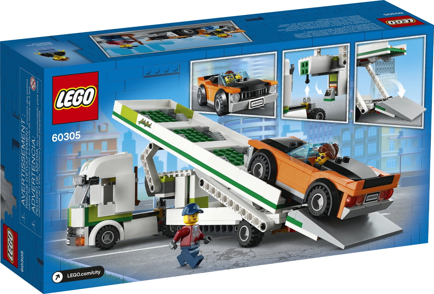 Treat your everyday hero to this exciting LEGO city car transporter (60305) building set, with cool toy vehicles and fun characters that will take imaginative role play into the fast lane Kids can raise and lower the trailer’s upper deck and rear ramp to load and transport up to 3 LEGO city great vehicles cars, including the cool muscle car included with this set Makes a great holiday, birthday or any-other-day treat for boys and girls aged 5 and up When built, the LEGO city car transporter toy measures over 4.5 in.(11 cm) high, 12 in.(31 cm) long and 3 in.(8 cm) wide