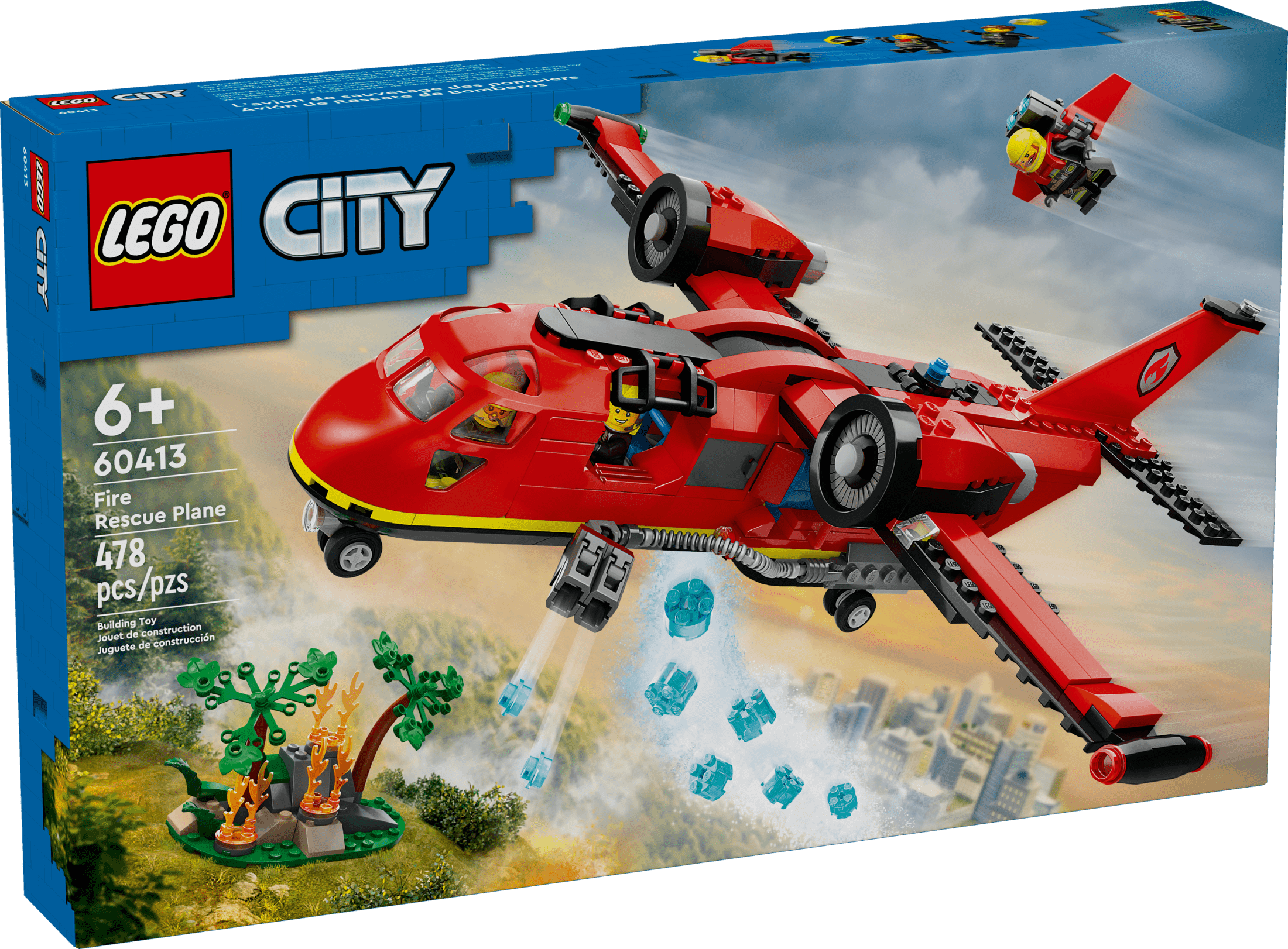 Toy fire rescue plane – The LEGO City Fire Rescue Plane toy for kids comes with lots of features for realistic firefighting play for ages 6 and up What’s in the box? – This emergency rescue toy playset has everything kids need to build a fire plane and wildfire scene, with pilot, extinguisher operator and jetpack firefighter minifigures Features for pretend play – Kids can operate the airplane toy’s water drop function and water element launchers and play out futuristic firefighting stories with the jetpack firefighter minifigure Buildable firefighter toy with digital construction guide – Discover the LEGO Builder app where kids can zoom in and rotate models in 3D, track building progress and explore and save virtual playsets A gift for fans of toy planes – Give this kids’ playset as a holiday or birthday gift for boys and girls ages 6 and up Creative play without limits – Kids unleash more fun and adventures when they add this set to others (sold separately) from the LEGO City collection A city without limits – LEGO City is a place where kids can set their limitless imaginations free, with structures, vehicles and citizens that motivate them to build, create, explore and play