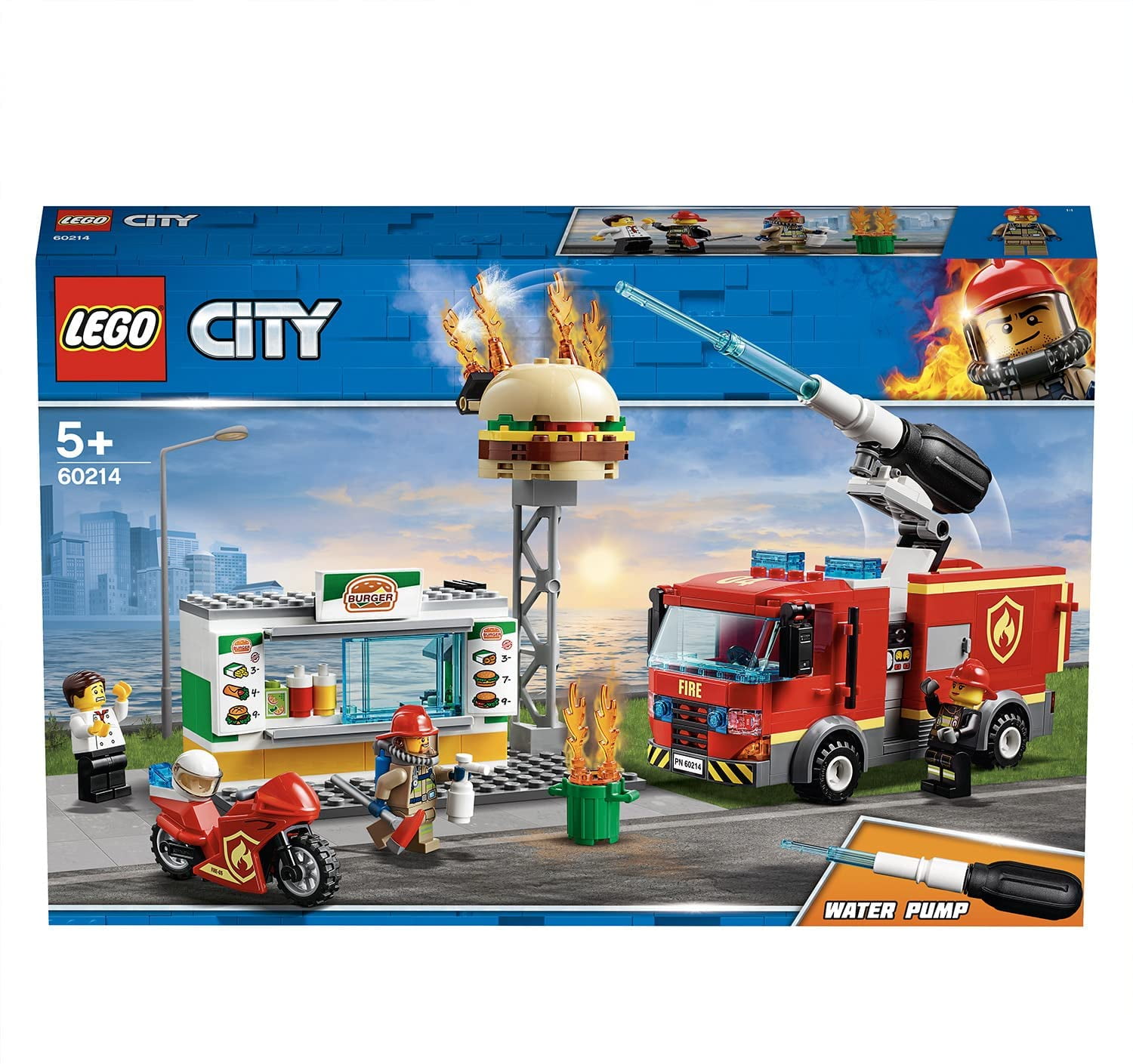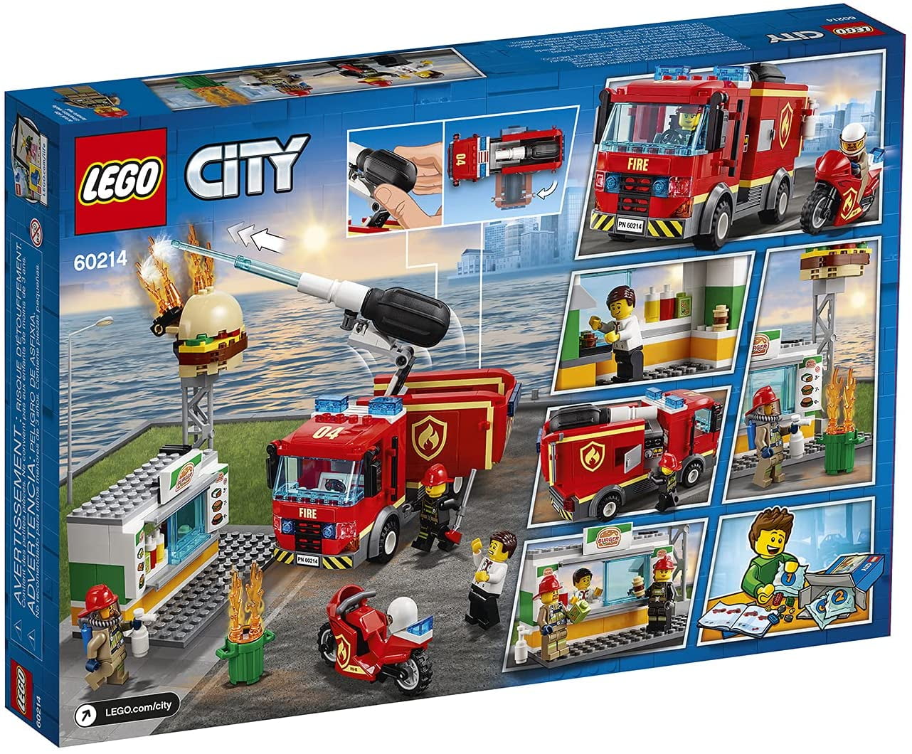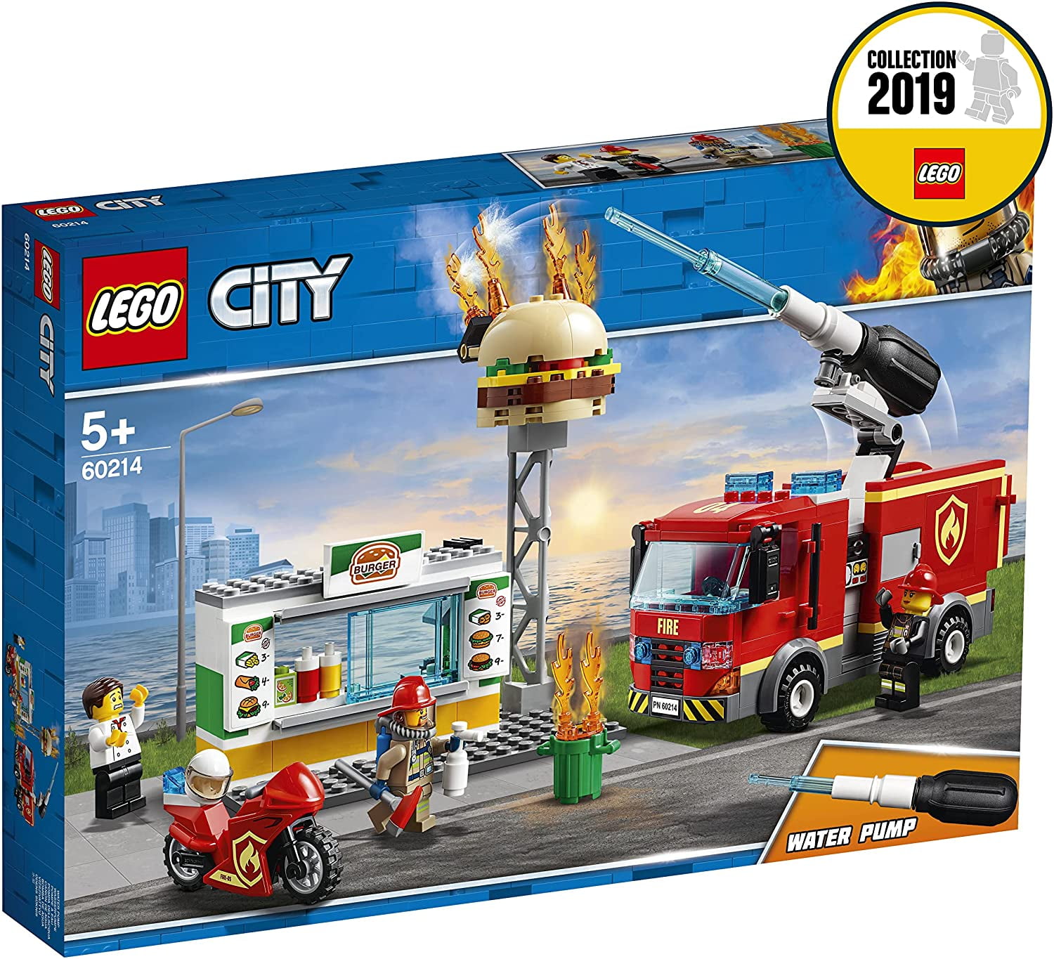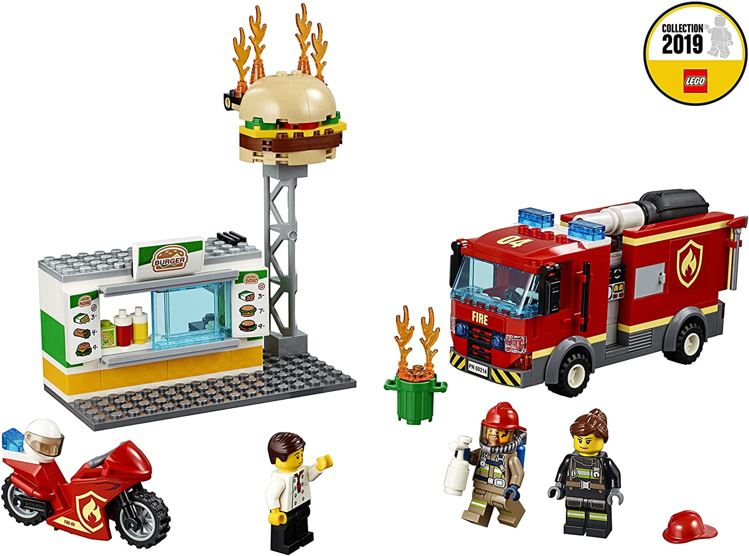 LEGO City Kid’s Burger Bar and Fire Rescue Building Toy Set, 327 Piece Includes 3 LEGO City minifigures: 2 firefighters and a grill chef Features a fire truck toy with a minifigure cab and rotating back end Equipped with a new-for-January-2019 directional pump with water jet function Contains 2 storage compartments for added playability Comes with a motorbike for exciting rescue missions Includes a burger bar with a burger sign, opening service window, and a trash can