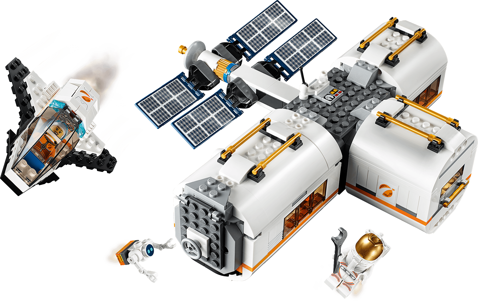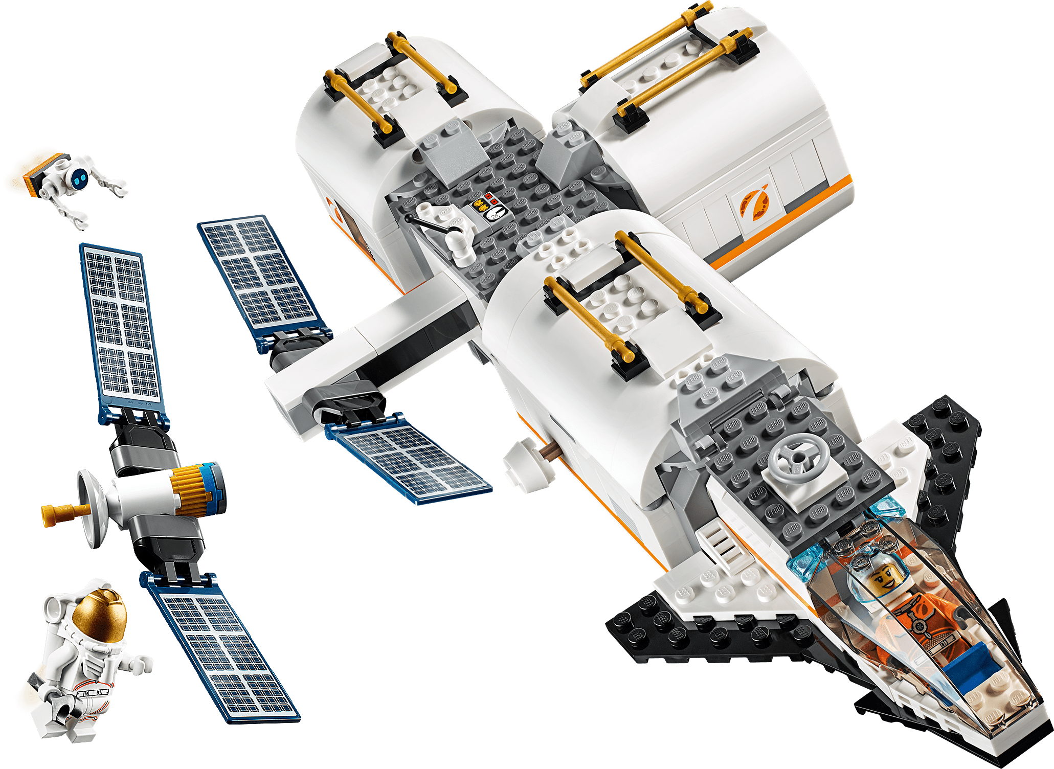 Includes 4 LEGO City minifigures: 2 astronauts and 2 crewmembers, plus a robot figure This space station toy set features 3 detachable modules with removable roofs: a living module with a treadmill, anti-gravity bed and TV screen, lab module with light brick and research tools, kitchen module with plants and a pizza oven, plus a central airlock compartment. The modules can be put together in different ways around and on the central airlock compartment This NASA-inspired astronaut toy set also includes a detachable satellite with folding solar panels and a detachable space shuttle with cargo space and an opening cockpit Accessory elements include repair tools, pizza, 2 new-for-June-2019 geodes with blue crystals, helmet with blue visor and an Extra Vehicular Activity suit with golden visor, plus a brick separator This awesome space station construction toy makes a great gift for kids Shuttle measures over 1” (4cm) high, 4” (12cm) long and 4” (12cm) wide Satellite measures over 1” (3cm) high, 1” (5cm) long and 6” (17cm) wide Kitchen module measures over 2” (7cm) high, 5” (13cm) long and 3” (8cm) wide Lab module measures over 2” (7cm) high, over 2” (7cm) long and 2” (6cm) wide Living module measures over 2” (7cm) high, over 2” (7cm) long and 2” (6cm) wide Central airlock compartment measures over 2” (7cm) high, over 4” (11cm) long and 6” (17cm) wide