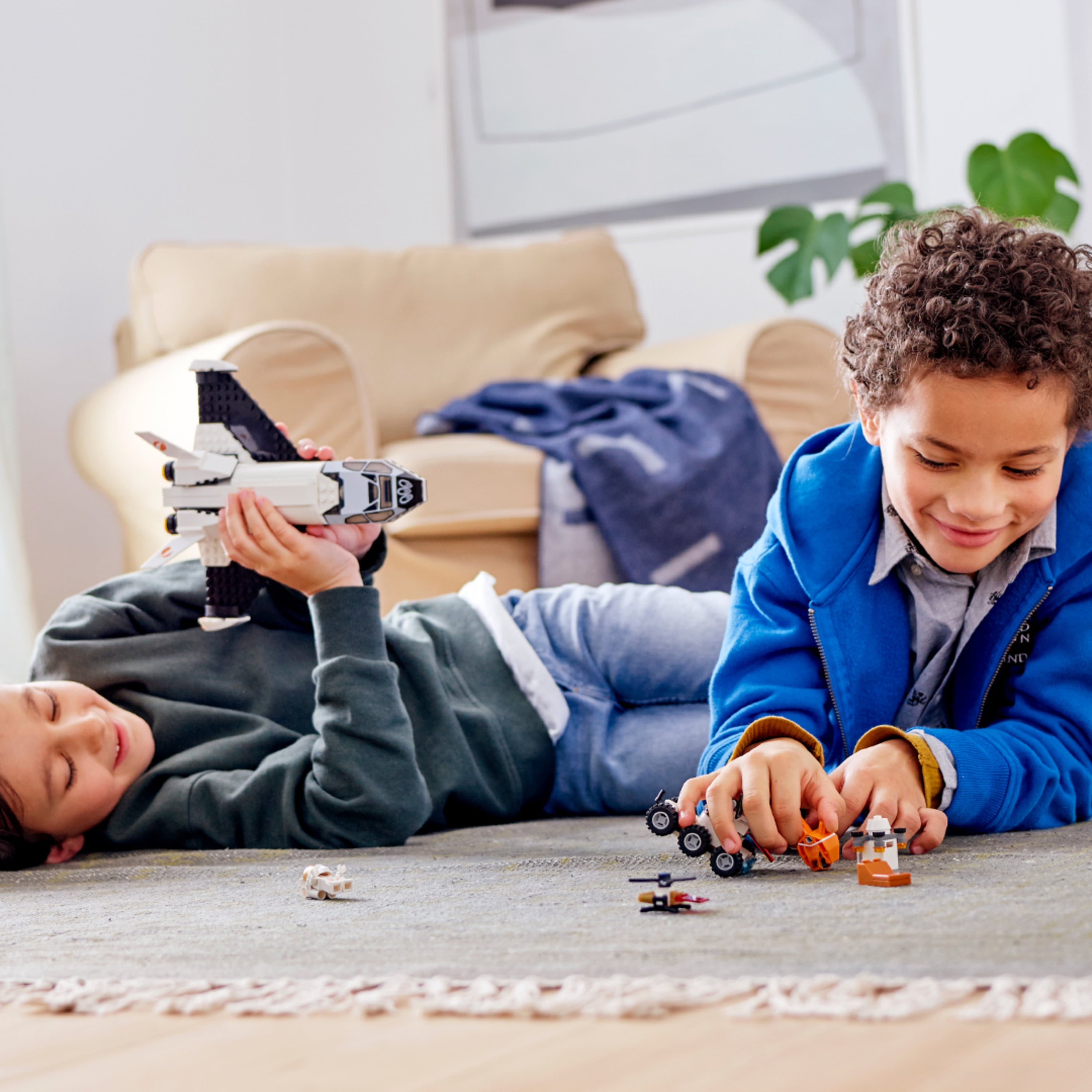 Includes 2 LEGO City astronaut minifigures This building set for kids features a space research shuttle with opening cockpit, 2 large opening doors and space inside for the storage drone, plus a NASA-inspired Mars rover with new articulated grappling arm, laser and tilting solar panels, storage drone with opening compartment, plus a Helidrone with spinning rotor blade and scanner to read a secret symbol discovered on Mars Accessory elements include a helmet with blue visor, Extra Vehicular Activity suit with golden visor, scanner and 2 new geodes with blue crystals This fun construction toy makes a great gift for kids Research shuttle measures over 3″ (9cm) high, 9″ (23cm) long and 8″ (21cm) wide Mars rover measures over 1″ (5cm) high, 2″ (7cm) long and 2″ (6cm) wide Helidrone measures over 1″ (4cm) long and 1″ (3cm) wide Storage drone measures over 1″ (3cm) high and 1″ (3cm) long Mars scenery build measures over 1″ (3cm) wide