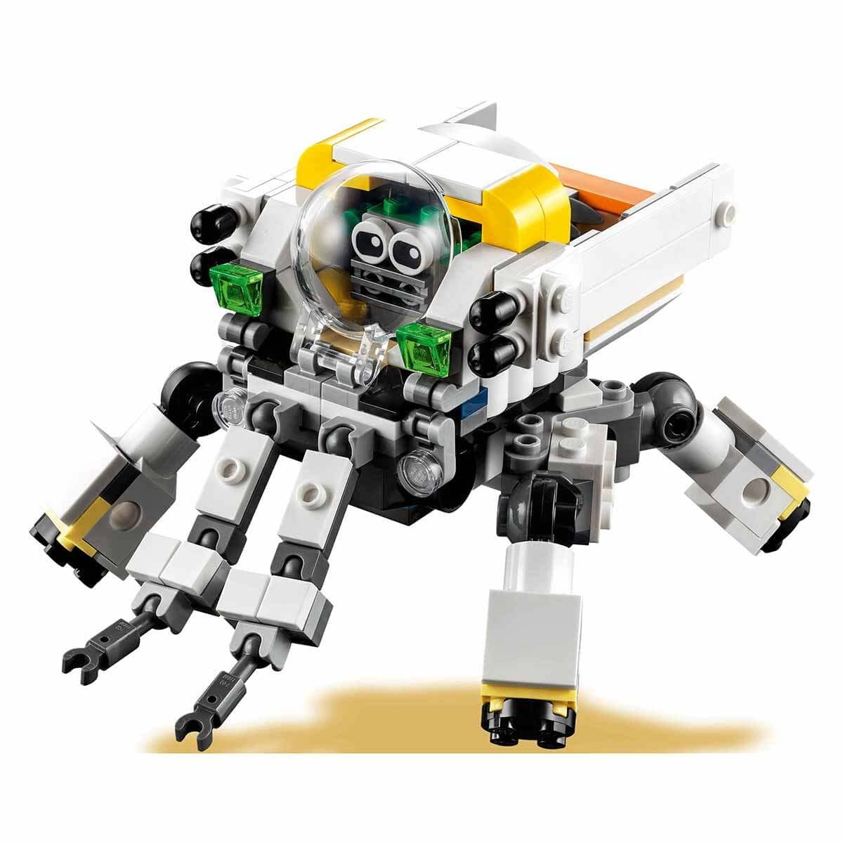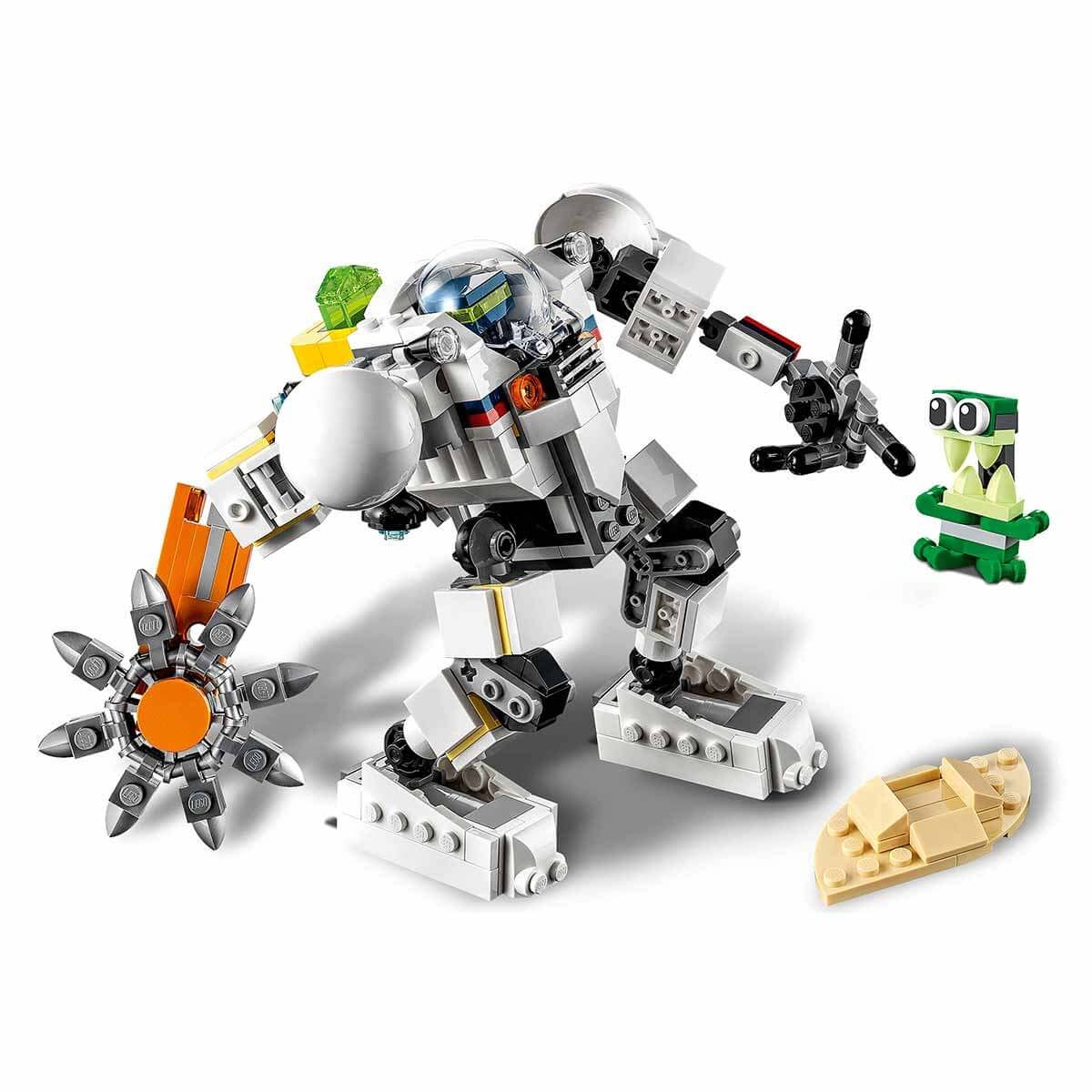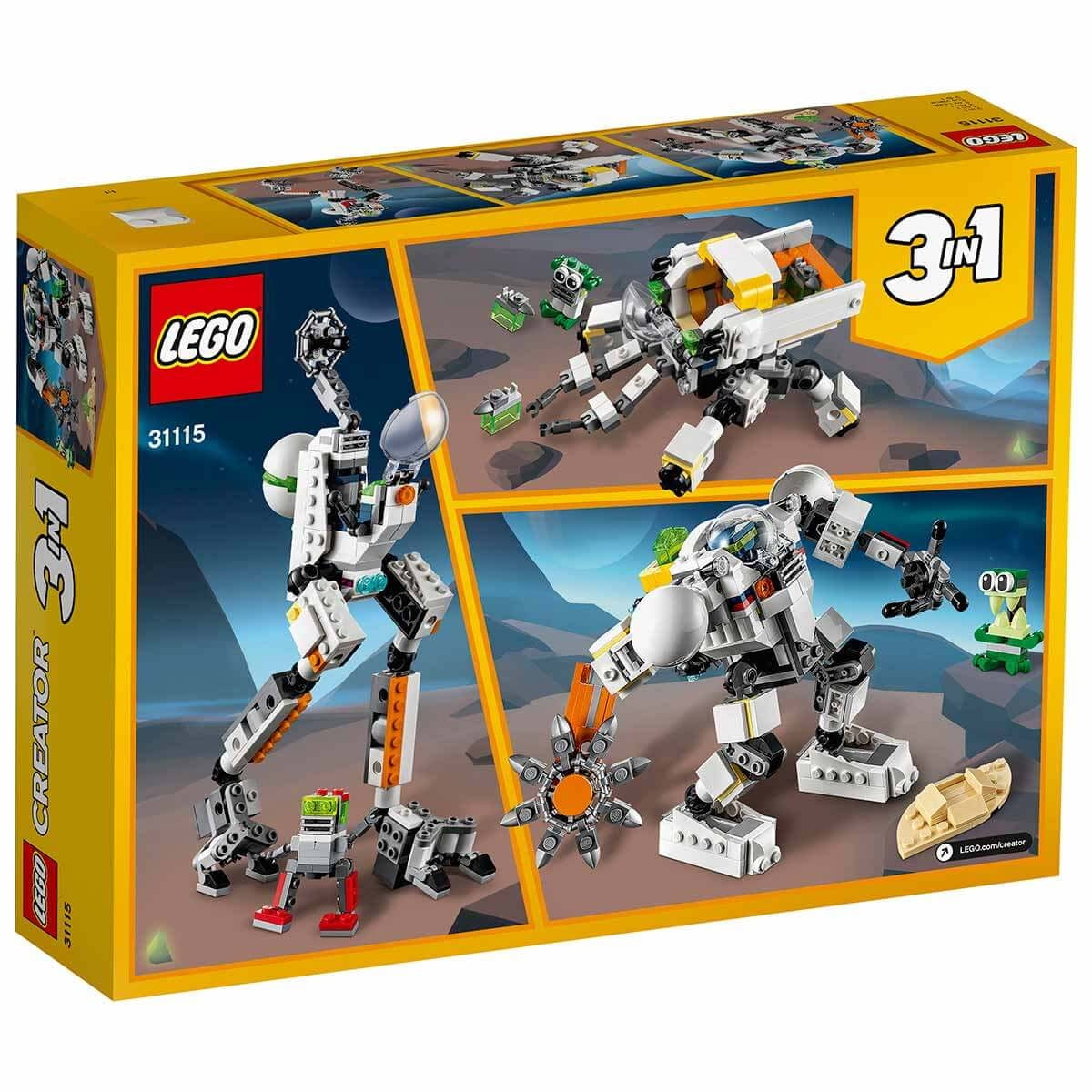 LEGO Creator Space Mine Robot 31115Enjoy out of this world with this amazing Space Mine Robot! Use the circular saw to search for precious crystals and when you find them, pack them in your jet bag. Watch out for the pesky green alien! Then transform the robot into a cargo transporter or a robot-driven mobile vehicle for more intergalactic action, or imagine something brand new! The choice is yours with this incredible 3-in-1 set. LEGO fans will love recreating action scenes with this impressive Creator 3-in-1 Space Mining Robot building set. The cool features of the toy robot, such as movable limbs, rotating circular saw, jetpack on its back and changeable face, give kids everything they need for hours of fun role-playing. The best toys for creative fun! Space and robot lovers can enjoy 3 different build and play experiences with this LEGO Creator 3-in-1 set. Once they’ve built the Space Mining Robot that comes with the alien figure and crystals, they can transform it into a robot-piloted 4-legged cargo transporter or a movable 2-legged LEGO robot. An incredible collection of 3-in-1 LEGO toys! LEGO Creator 3-in-1 building toys open up an exciting world of possibilities with 3 different models in each box! Creator 3-in-1 sets; With an incredible collection of models to engage kids, including cars, animals, and airplanes, it inspires the best creative play. Creative kids can use the robot toy to race against an alien for crystals, travel the galaxy in a 4-legged cargo transporter, or engage in space battles with a 2-legged robot. .The Movable Space Mining Robot has a circular saw, jetpack and a changeable face, the 4-legged cargo carrier and the 2-legged robot each have a robot pilot. This 327-piece LEGO Creator 3-in-1 set is satisfying for space-savvy kids ages 7 and up. It’s a model and makes the perfect birthday or Christmas gift. The robot toy measures 15 cm and is the ideal portable size to play at home or take with you wherever you go. Build even bigger adventures with other LEGO Creator 3-in-1 sets: Wild Lion, Race Car Transporter, Super Motorcycle, Safari Tree House, and Surfer Beach House.LEGO Creator 3-in-1 set er allows kids to enjoy unlimited creative play while developing action-packed stories with 3 different cool and colorful models in each box.Number of Pieces: 327Age Group : 7+ Years