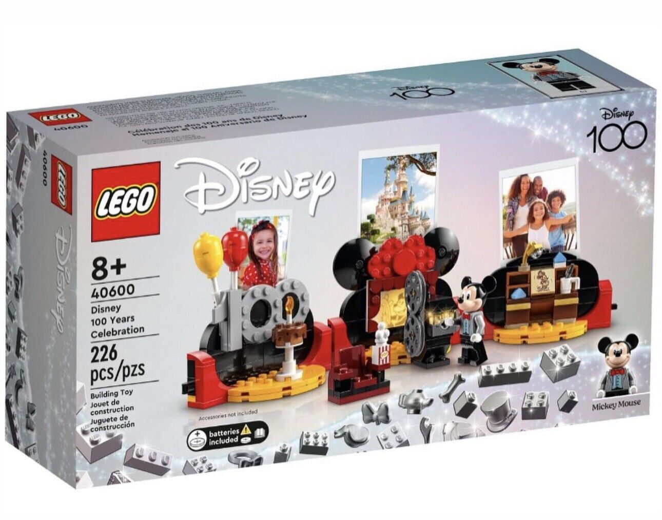 LEGO Disney 100 Years Celebration 226 Piece Building Set 40600 Wow any kid or fan aged 8+ with a gift celebrating Disney’s 100th anniversary of magic, wonder and beloved animated characters. This LEGO® ‘ Disney: Disney 100 Years Celebration (40600) set features 3 models: a small desk with a drawing; a screen and a projector with a light brick that makes Disney’s Mickey Mouse appear; plus balloons and cake. Each model includes a clip on the back and can function as a note or a photo holder. The set also includes an exclusive Mickey Mouse LEGO minifigure. Collectible building set – Commemorate 100 years of storytelling through the magic of animation with this LEGO® ‘ Disney: Disney 100 Years Celebration (40600) set, made for kids and fans aged 8 and up An all-occasion treat – Each model has a clip to hold photos and the screen model has a projector with a light brick that illuminates Disney’s Mickey Mouse, making this a fun gift for Disney-lovers Dimensions – When connected, the 3 models measure over 3.5 in. (9 cm) high, 12 in. (31 cm) wide and 3.5 in. (9 cm) deep and can be displayed on a shelf when playtime is over Disney