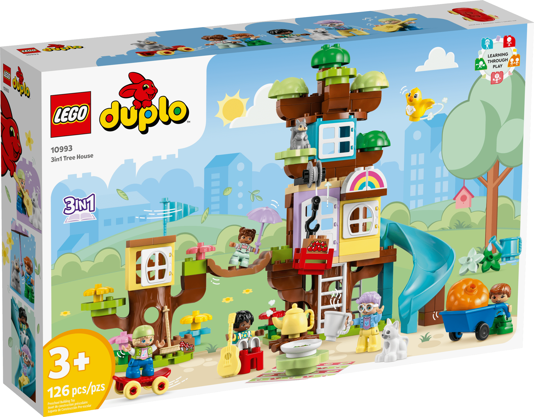 Fun tree house toy for little learners – Toddlers ages 3+ can explore the treetops, develop self-expression and build their motor skills with the LEGO DUPLO 3in1 Tree House (10993) Fun characters and accessories – Figures include a grandma, 4 kids, a bird, a cat, and a squirrel, plus lots of accessories for teaching self-expression, group-play skills and social role play Countless play possibilities – Together with their parents, preschoolers can learn through play by building and rebuilding 3 different scenes: a 3-story treetop play area with a slide, a cozy tree house and a pretty garden scene Creative building toy for toddlers – This learning and education toy makes a great first LEGO set and birthday gift for toddlers ages 3 and up Room to play – With the main model measuring over 16.5 in. (43 cm) high, 21 in. (54 cm) wide and 8.5 in. (22 cm) deep, the 3-story tree house toy has lots of space for little fingers to explore Digital instructions for creative building – The LEGO Builder app features a digital version of the building instructions included with this set A safe experience – LEGO DUPLO bricks and pieces are dropped, heated, crushed, twisted and analyzed to make sure they fulfill demanding child safety standards