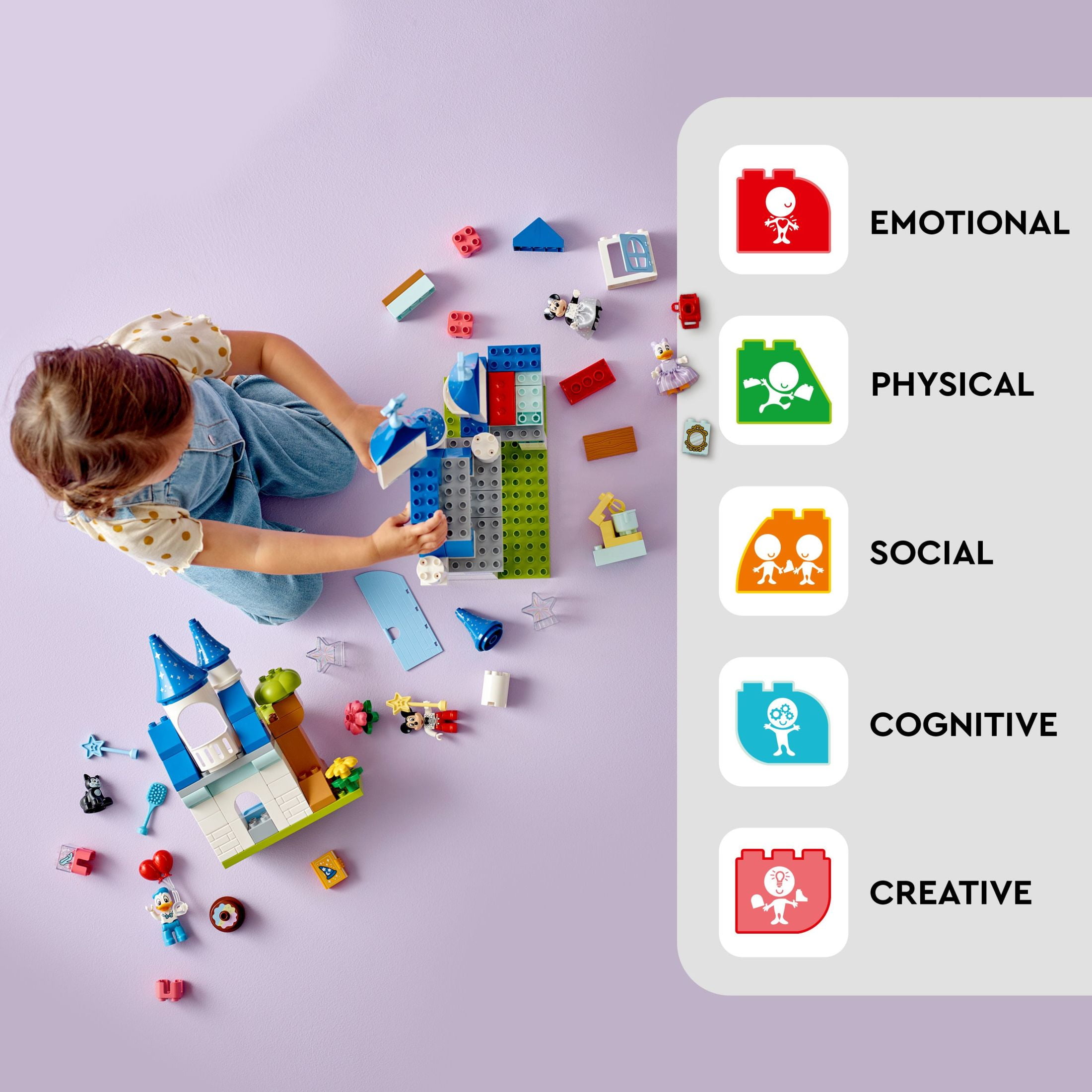 Imaginative Disney 100 building toy for hours of play – Give toddlers limitless creative adventures as they develop motor skills building and rebuilding the LEGO DUPLO Disney 3in1 Magic Castle (10998) set 5 Disney figures – Preschoolers explore the castle’s magical features in the company of 5 LEGO DUPLO figures: Disney’s Mickey Mouse, Minnie Mouse, Donald Duck, Daisy Duck and Figaro the cat Building fun that always stays fresh – Toddlers configure the model however they choose: as a large castle, a tall tower or as 2 smaller builds hinged together Accessories that spark creative stories – The set comes with elements such as Cinderella’s shoe, a magic book, mirror, wand, camera, balloons and a kitchen mixer Gift for little builders with big imaginations – Delight a Disney fan aged 3+ on a special occasion with this feature-filled, buildable toy castle that gives hours of play Lots of space to play – The main model measures over 20.5 in. (52 cm) high, 18.5 in. (48 cm) wide and 7.5 in. (19 cm) deep, so there’s ample room for little fingers to explore Digital building instructions – The LEGO Builder app features a digital version of the building instructions included with this set
