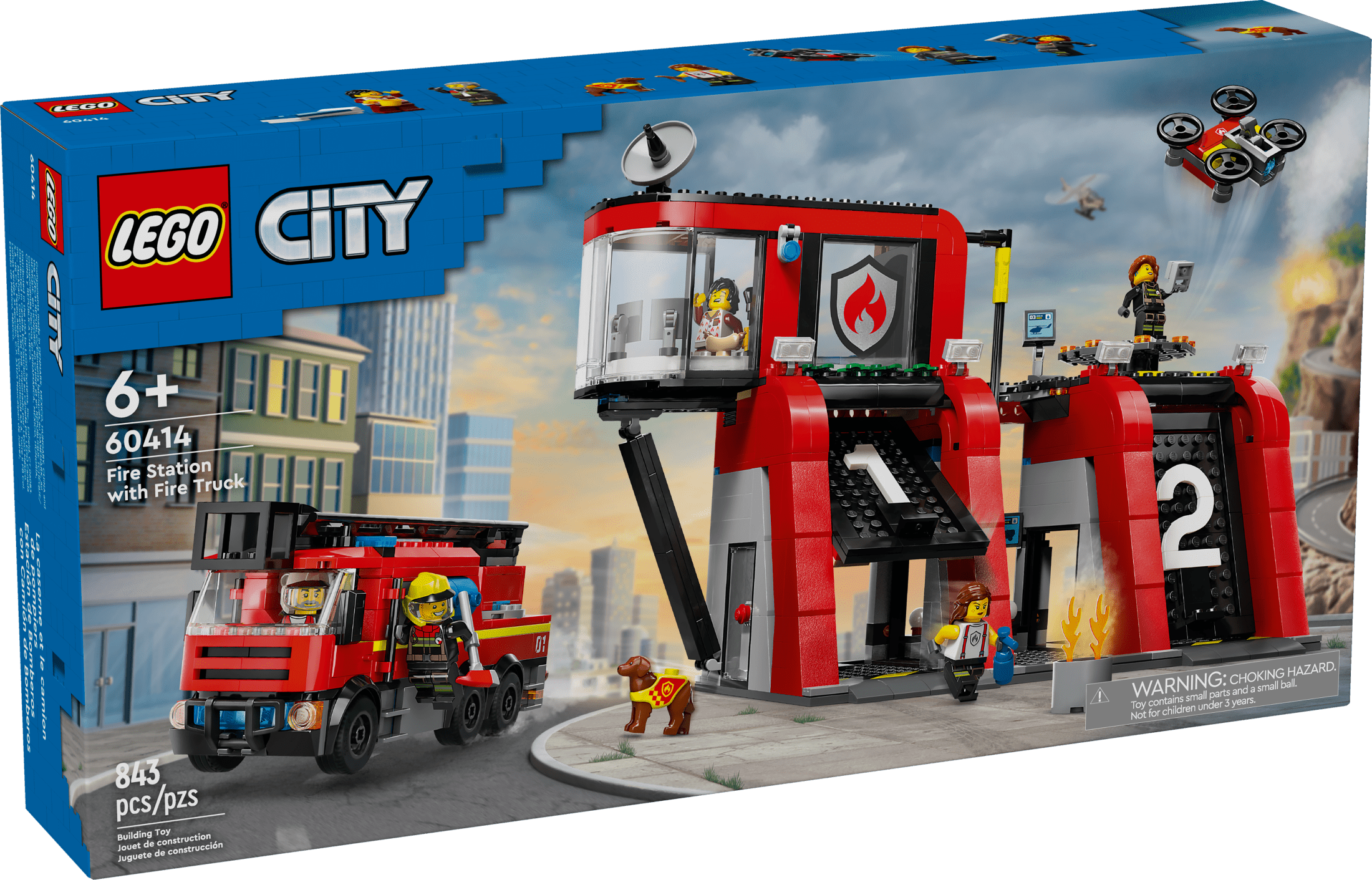 LEGO Fire Station with Fire Truck Block Building Sets, 843 Pieces Spark kids’ imaginations with the LEGO® City Fire Station with Fire Truck (60414) toy playset for ages 6 and up Features a modern control center, kitchenette, and sleeping quarters above an equipment area Includes 2 garages with tall up-and-over doors for easy access Comes with a toy drone and a cool fire engine equipped with a modular ladder and extinguisher attachments Mobilize the 5 fire-crew minifigures and fire dog figure for hours of action-packed firefighting role play