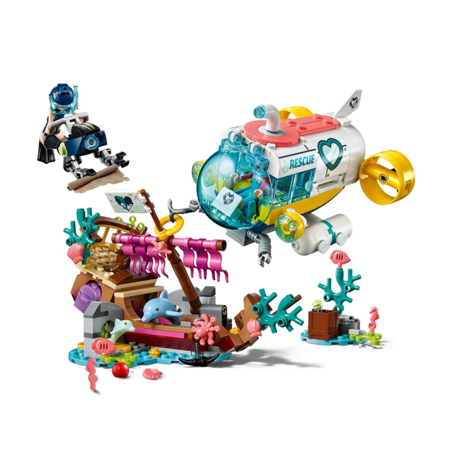 Features a submarine toy with a viewing sphere with hinged windscreen, plus an underwater scooter, shipwreck with hinged mast, and a mini island with a treasure trunk This submarine toy set includes 2 mini-doll figures: Stephanie and Kacey, plus 2 dolphin figures Submarine accessory elements include a water-reactive textile treasure map, 2 wigs, 2 diving helmets, coral and sea creature elements, treasure chest with gems, ball, bottle, fins, syringe, baby bottle and a grabbing tool Inspire your little builder to set sail on a LEGO rescue mission with this underwater set Help your child to explore how to care for an animal’s wellbeing with this creative submarine toy Kids will love to act out the exciting race to the treasure between Stephanie and Kacey Water-reactive textile treasure map adds an element of surprise Use the LEGO Life app to access the sea rescue’s intuitive Instructions PLUS building instructions. Help even younger builders through the building process, with easy-to-use zoom, rotate and ghost-mode functions to visualize their creations as they go For girls and boys ages 6+