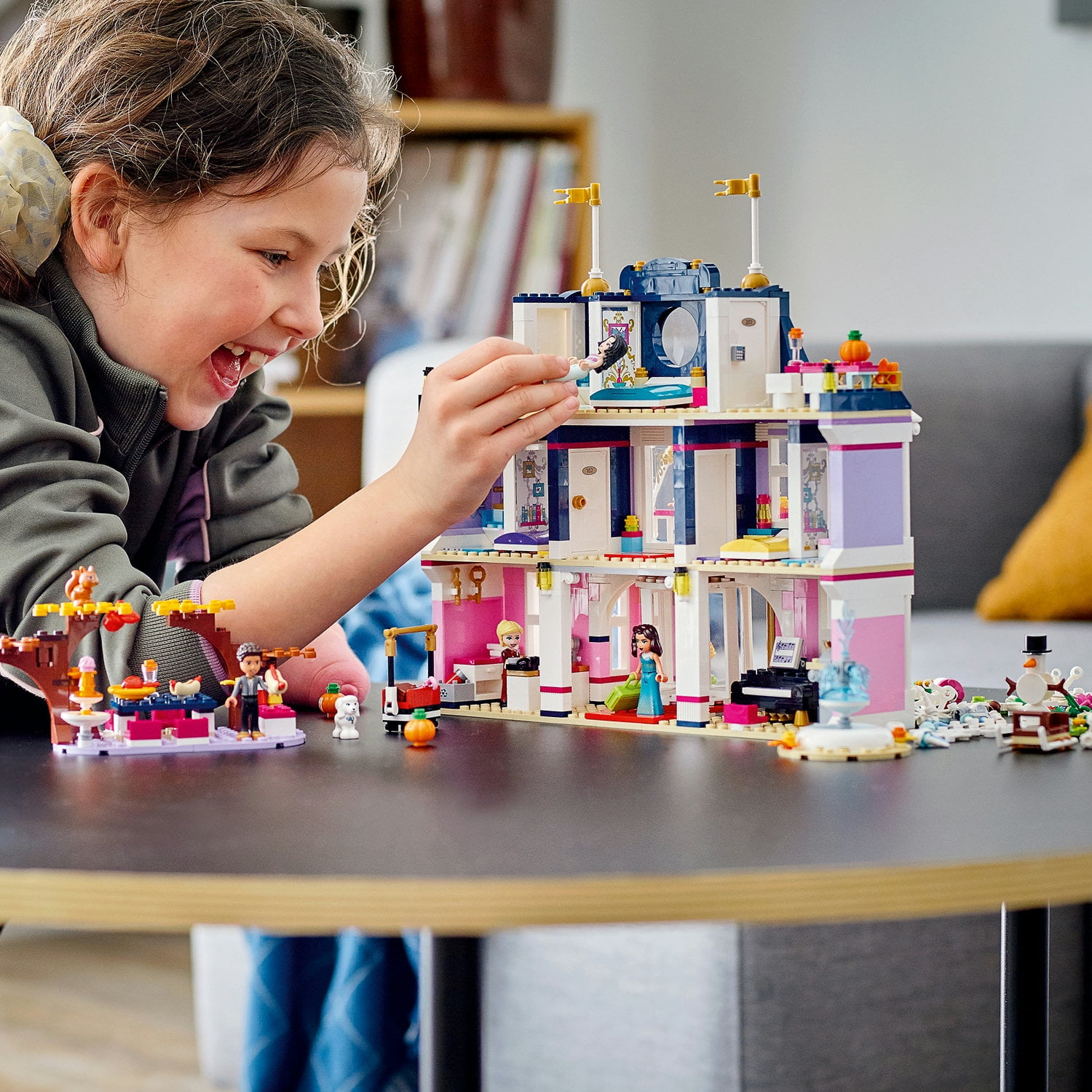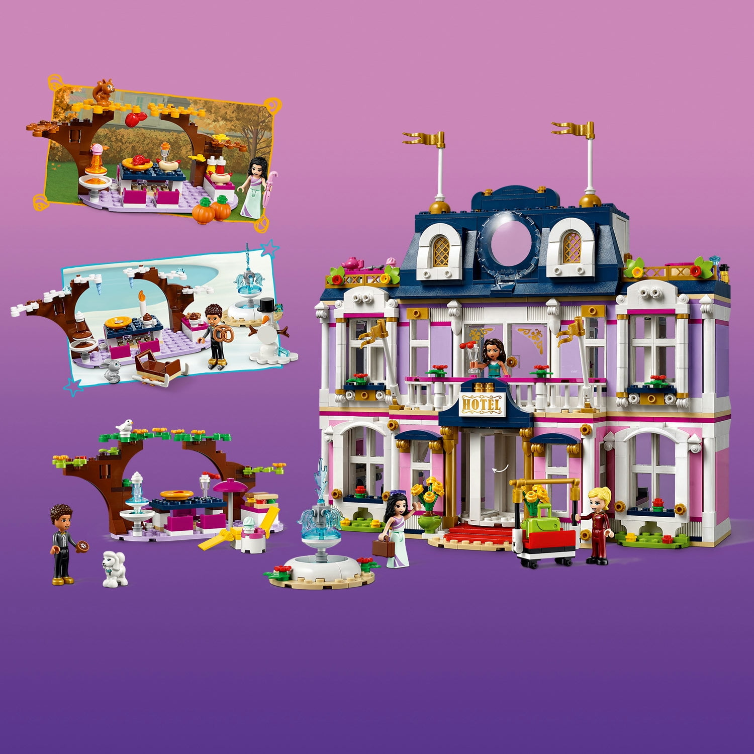 Comes with 4 LEGO friends mini-dolls including actress and receptionist figures and 3 animal figures. Packed with authentic details, the hotel has 5 rooms to explore, plus an outdoor dining area Creative kids will have hours of fun recreating what it’s like to stay or work in a ritzy hotel. They’ll love using their imagination to dress the hotel toy in accessories depending on the season Ideal seasonal gift for boys and girls aged 8+ who love real-world toys. Makes a show-stopping present for kids with a little building experience who will enjoy the construction challenge Main building measures over 11 in.(28cm) high, 11 in (28 cm) wide, and 5 in (14 cm) deep. Thanks to its size and styling, this LEGO Friends set makes a centerpiece display with real impact
