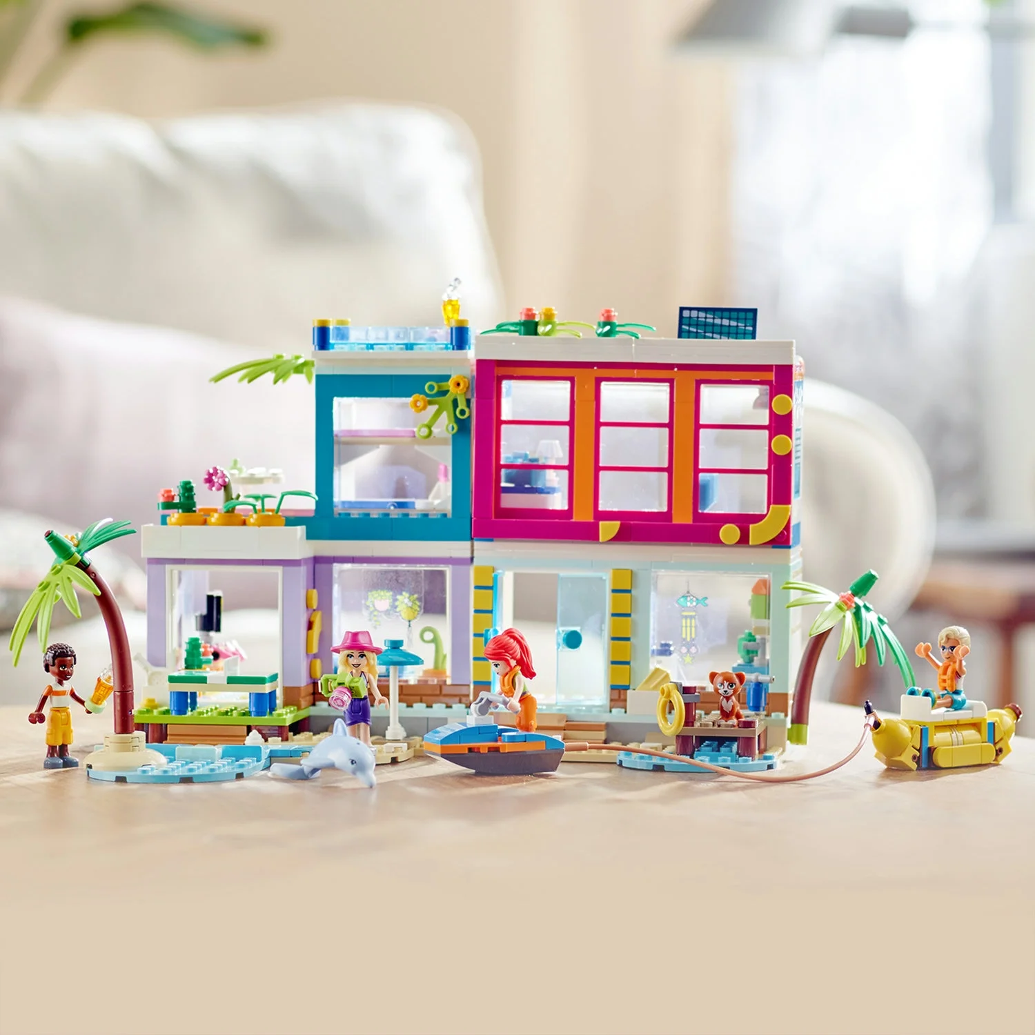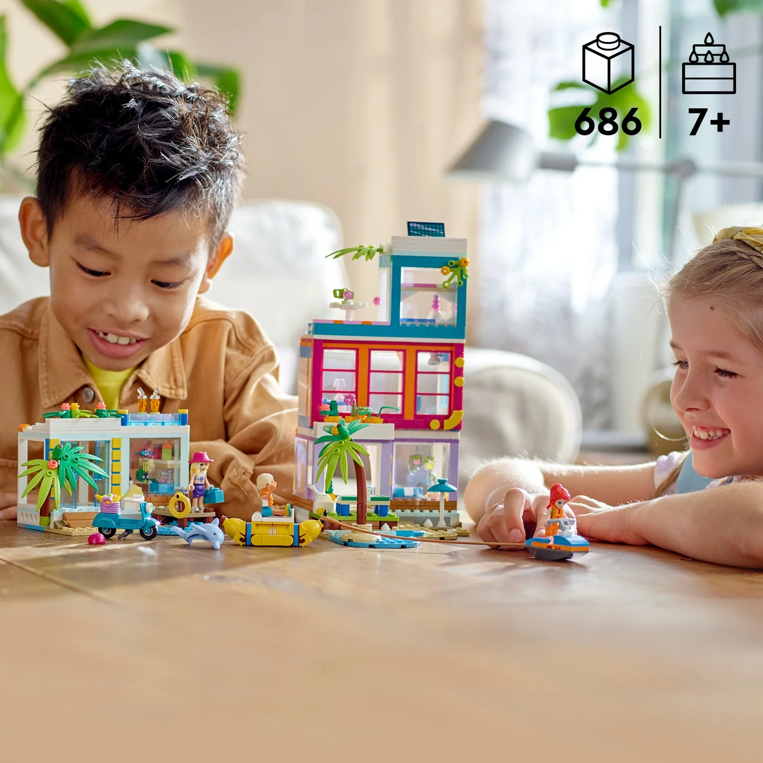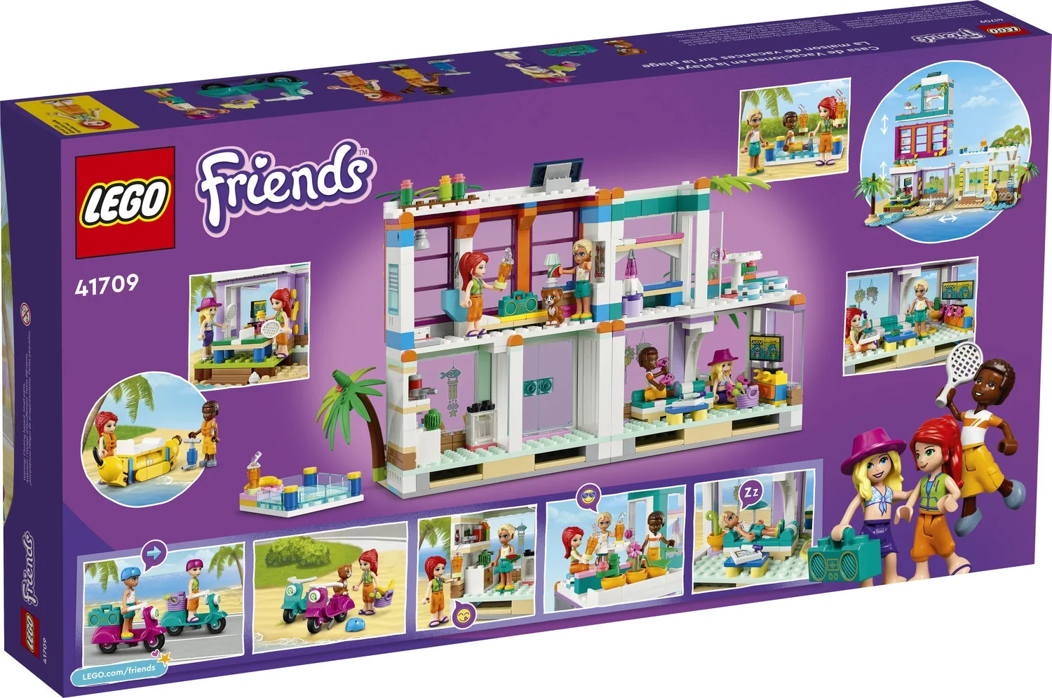 Kick-start creativity: The modular LEGO Friends Vacation Beach House (41709) playset gives kids hours of fun, letting them reconfigure their model into 2 or 3 separate buildings as they prefer Packed full of play: Includes a bedroom with a bathroom, a room with bunk beds, a balcony and a rooftop pool, a lounge with a sofa bed, a kitchen, 2 electric scooters and a banana boat LEGO Friends gift with 6 characters: Vacation Beach House (41709) comes with 4 mini-dolls, including LEGO Friends Mia, and dolphin and cat figures Creative accessories: From the games controllers to the table-tennis table and the air pump used to inflate the banana boat, there are lots of elements included to fire imaginative play Fun birthday gift idea for kids: Know a kid who loves to play house or enjoy beach-themed toys. This colorful summer toy is sure to delight boys and girls who love vacation play