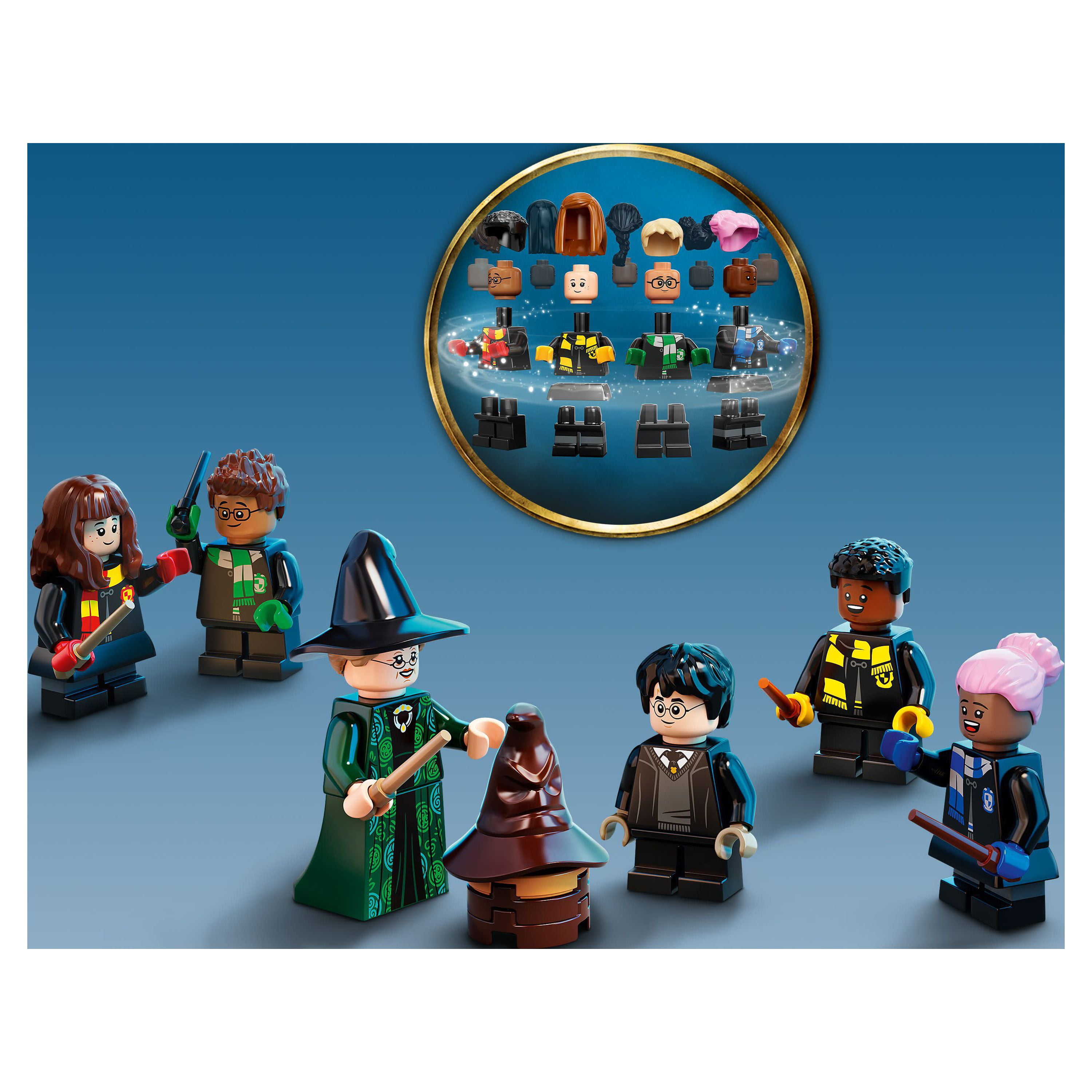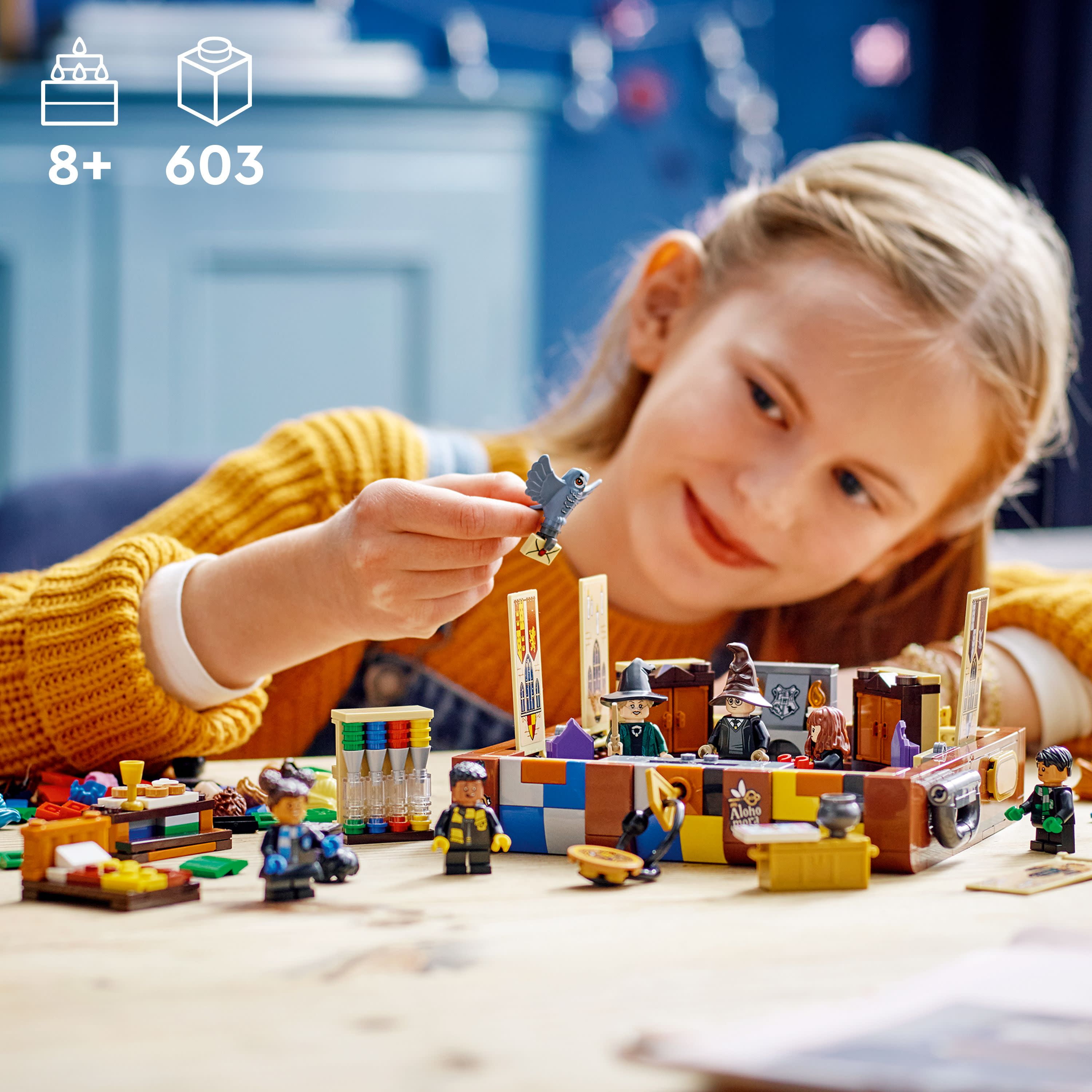 The Harry Potter Hogwarts house trunk set features minifigures & buildable items from the Harry Potter movies for kids to create and customize Personalisable Harry Potter luggage trunk contains different Hogwarts House colors and fun stickers for kids to make the trunk their own An assortment of minifigure parts lets kids build up to 5 LEGO Harry Potter minifigures or create completely new characters Includes furniture that magically reconfigures, Harry Potter accessories & elements to combine and bring Hogwarts adventures to life There are also 3 memorable moments from the movies to build and roleplay: the Sorting Ceremony; a Great Hall feast; and the Common Room Accessories include The Sorting Hat, the Marauder’s Map, Bertie Bott’s Every Flavor Beans, potions, a cauldron, a potion-making book and more This endlessly versatile playset is an ideal customizable Harry Potter gift for girls and boys and all fans of the Wizarding World adventures
