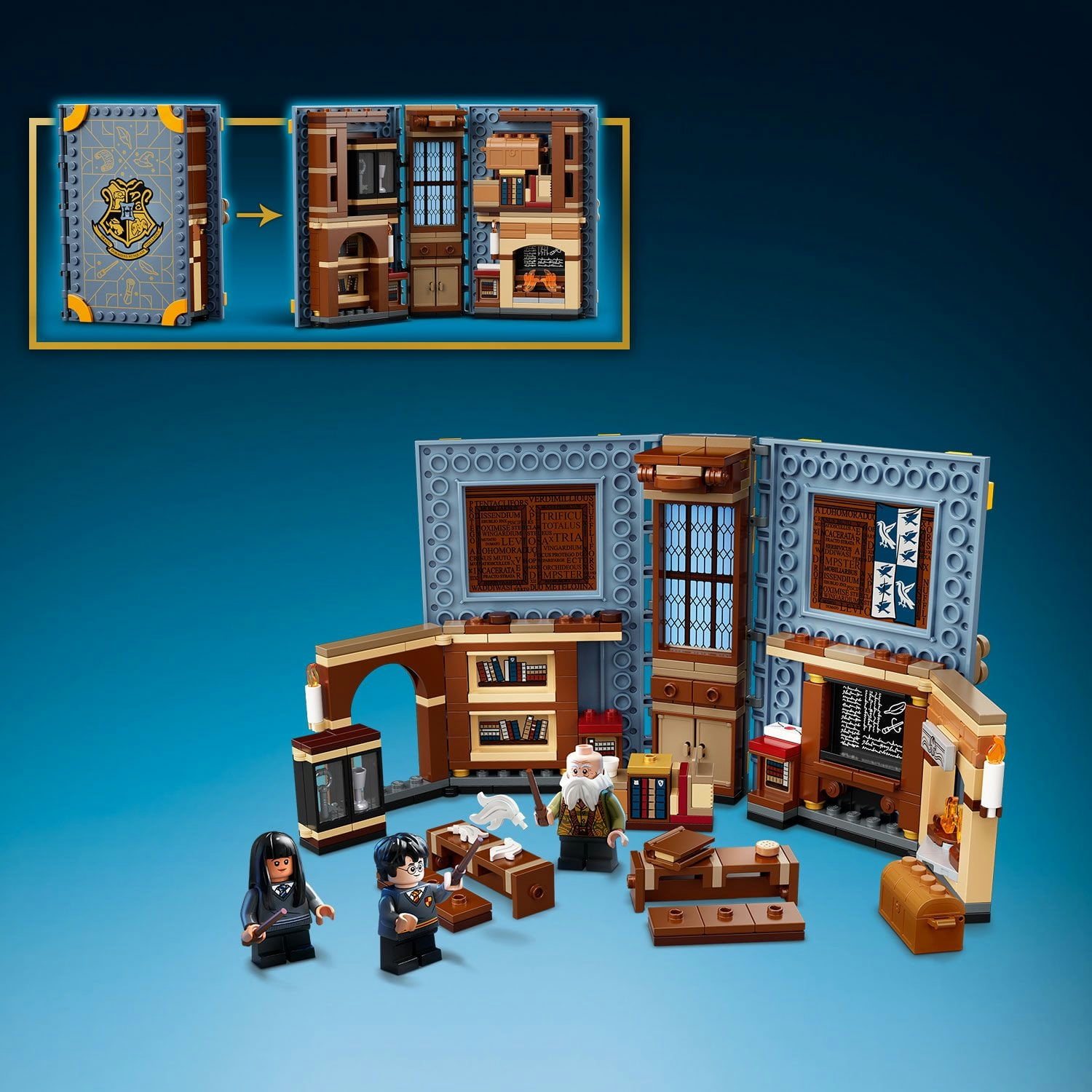 LEGO Harry Potter Hogwarts Moment: Charms Class (76385) is a brick-built playbook that opens to reveal Professor Flitwick’s spell-casting lesson from the Harry Potter movies Includes Harry Potter, Cho Chang and Professor Flitwick minifigures, blackboard, bookshelf, fireplace, spell book and lots of authentic accessories Kids open the cover to enter Professor Flitwick’s Charms lesson. There are lots of magical supplies to practice with and lots of fun accessories to extend the play even more For ages 8 and up. An enchanting treat for young witches and wizards looking for a different way to enjoy Harry Potter excitement This magical Hogwarts Moment set measures over 5 in. (12 cm) high, 3 in. (8 cm) wide and 1.5 in. (4 cm) deep – perfect for play and display, and easy to carry around
