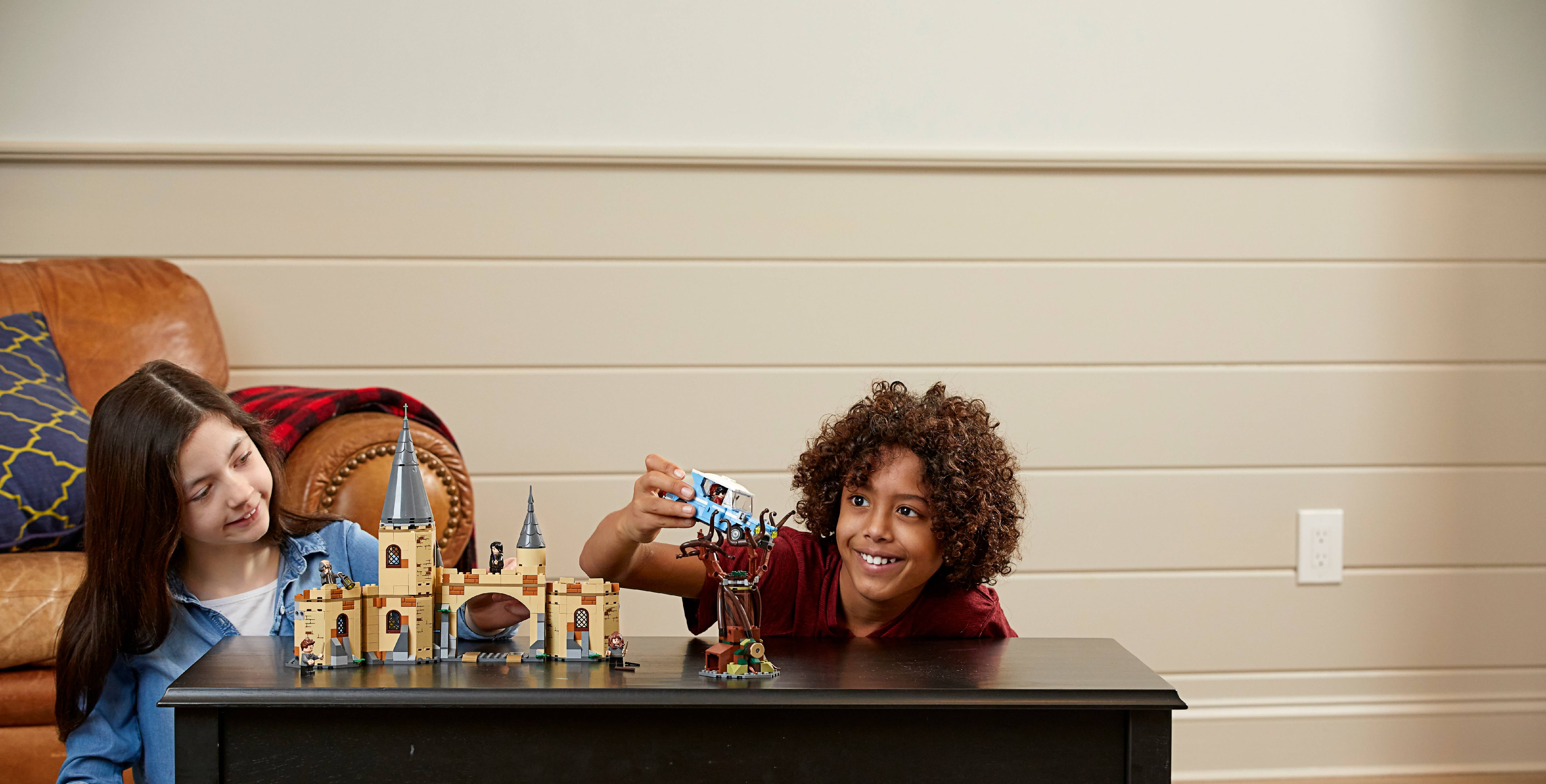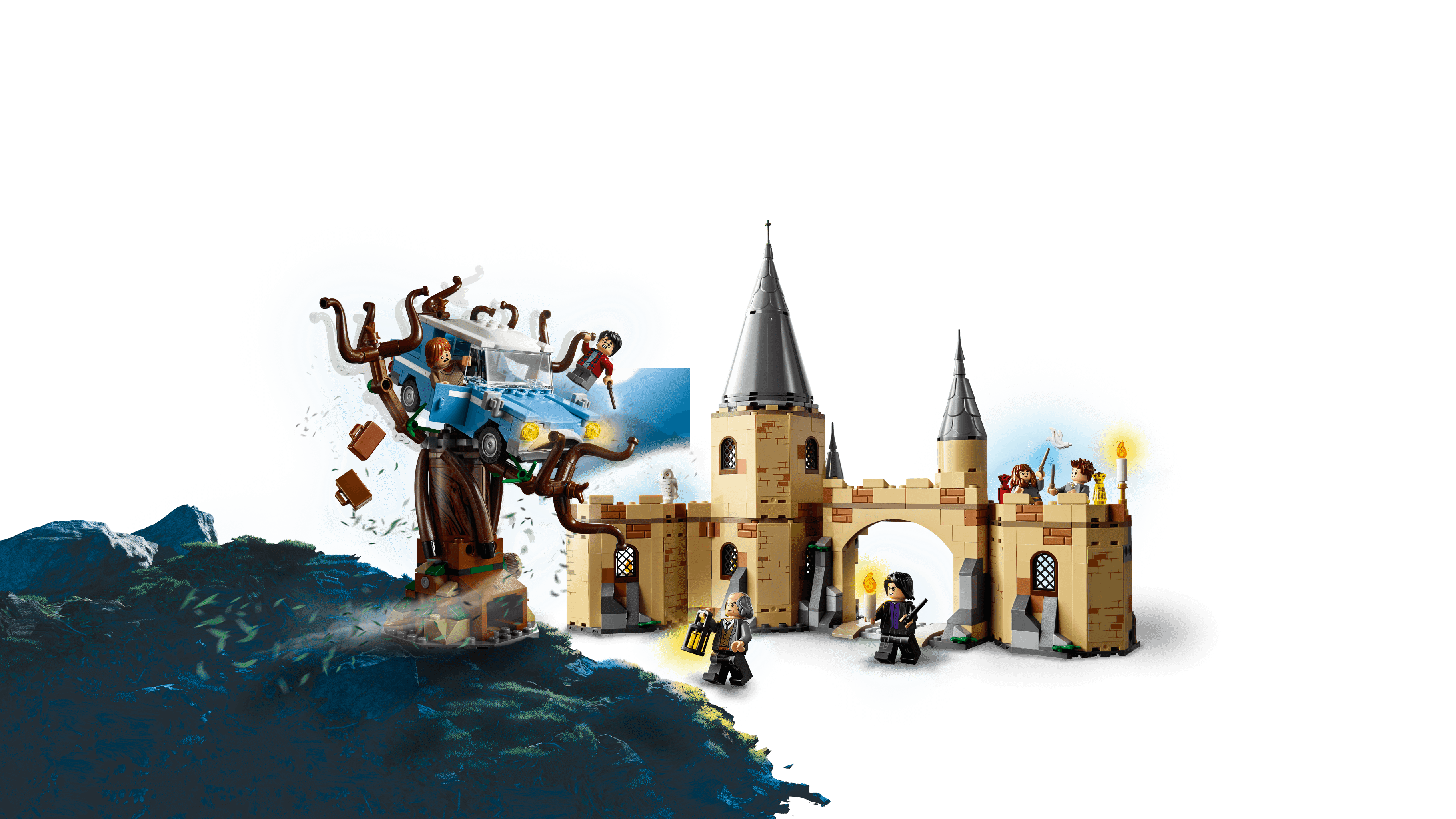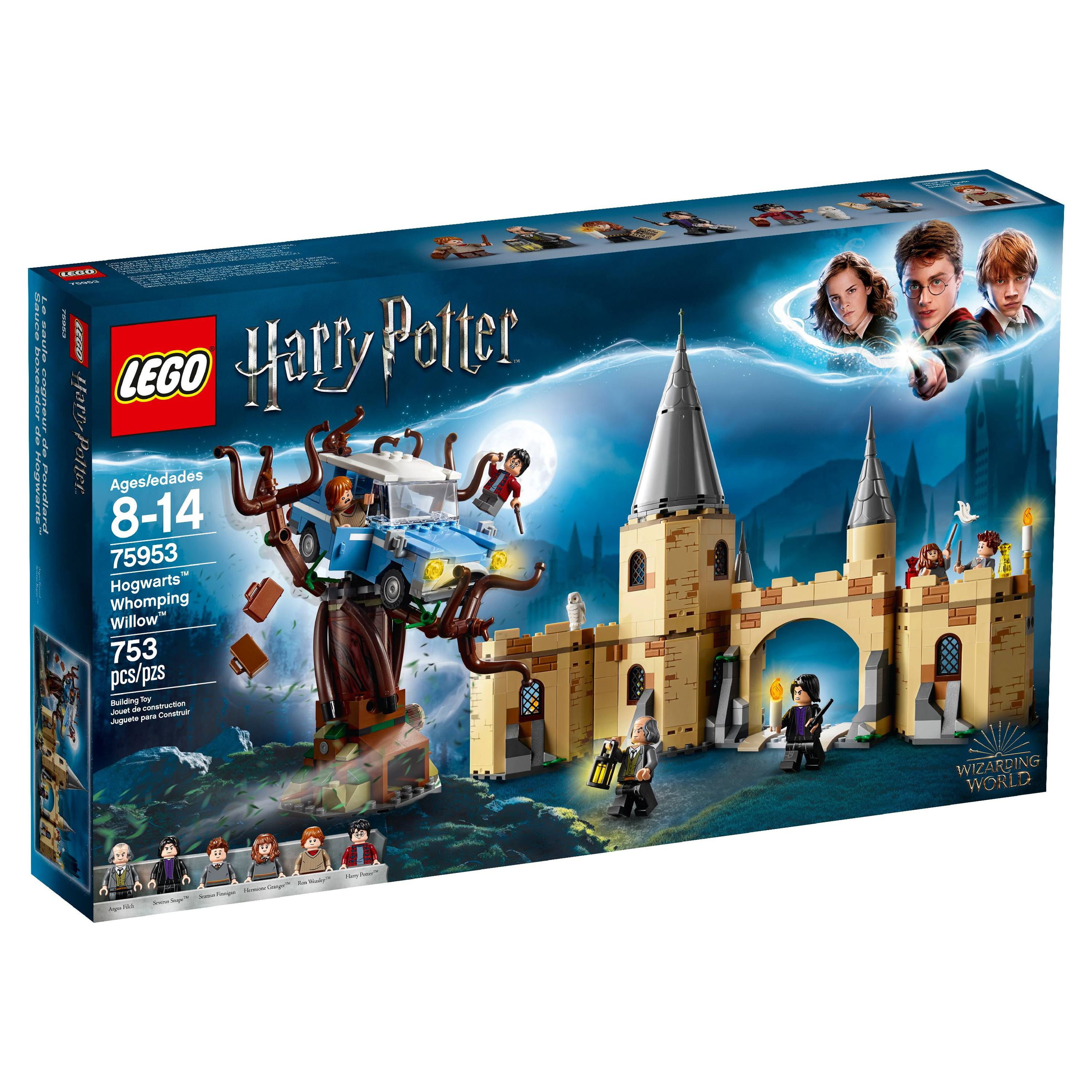 Includes 6 minifigures: Harry Potter, Ron Weasley, Hermione Granger, Seamus Finnigan, Argus Filch and Severus Snape, plus a He dwig owl figure Features the buildable Whomping Willow tree, Flying Ford Anglia car and Hogwarts castle section Whomping Willow features spinning branches and the Shrieking Shack tunnel entrance Flying Ford Anglia features 2 opening doors and an opening trunk with suitcases 3-level Hogwarts castle section features a gate, parapet walk, 3 turrets, dormitory with 2 beds, potions classroom with worktable and Severus Snape’s office Spin the tree’s branches to capture the car, then throw it to the ground to release Ron and Harry and drive through the castle gate Patrol the ramparts with Argus Filch and his lantern Mix potions with Professor Snape in the classroom Accessory elements include potions, cauldrons, 2 suitcases, 5 wands, candles, a lantern, Daily Prophet newspaper and magic spell page, broom, tables, chair, tools and 2 inkpots with a quill Combines with the 75954 Hogwarts Great Hall for even bigger LEGO® Harry Potter adventures Recreate iconic scenes from the Harry Potter movies Whomping Willow measures over 7″ (18cm) high, 7″ (20cm) wide and 7″ (20cm) deep Flying Ford Anglia measures over 1″ (5cm) high, 4″ (11cm) long and 2″ (6cm) wide Hogwarts castle section measures over 10″ (27cm) high, 13″ (35cm) wide and 3″ (8cm) deep