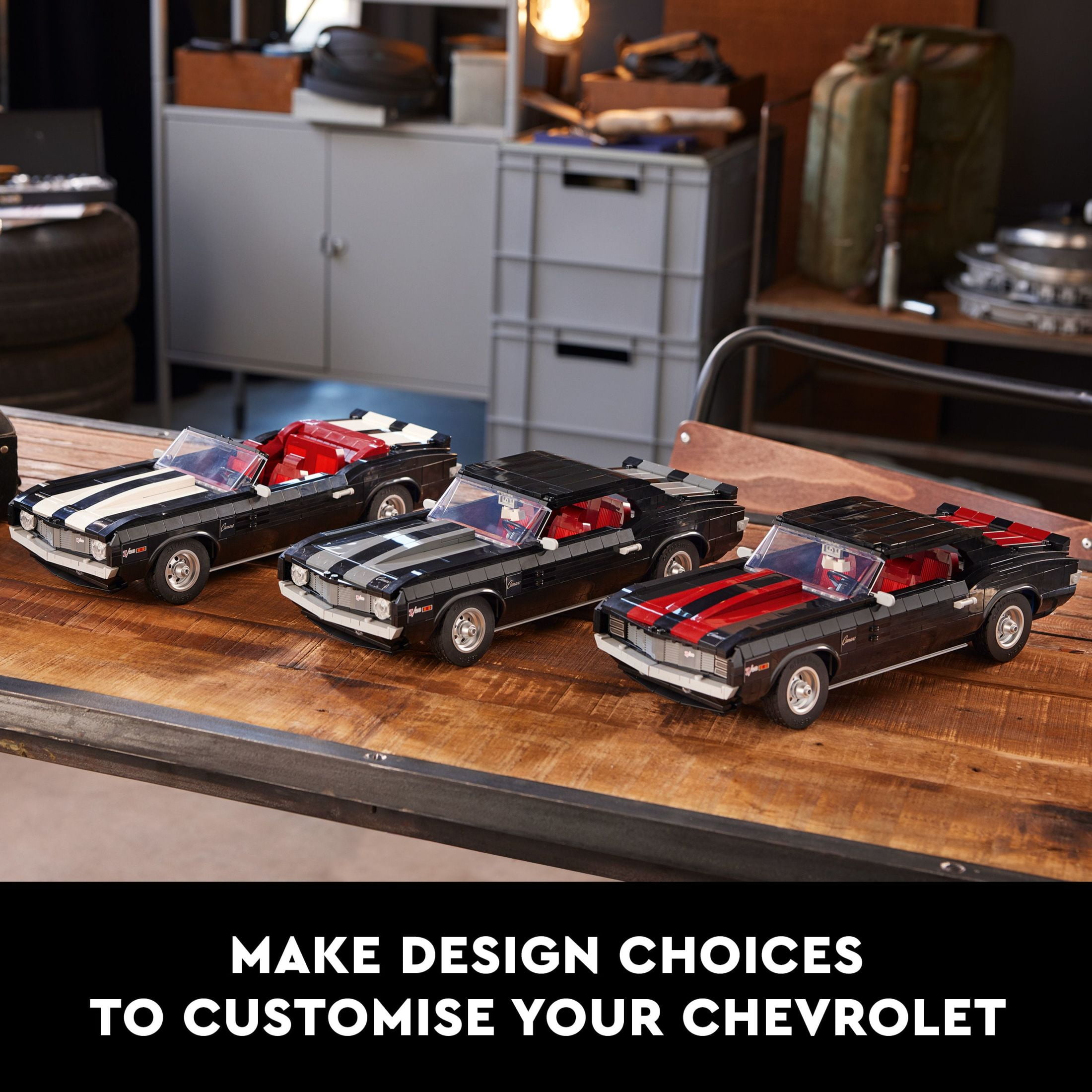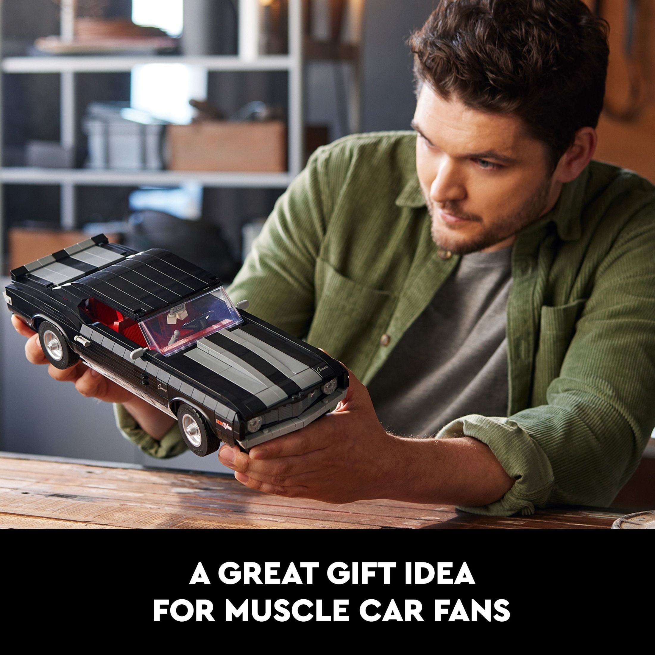 Get ready for a great building project with this replica of the 1969 Chevrolet Camaro Z28, a LEGO Icons set for adults to celebrate the legendary car Build an American muscle car model in black, with silver alloys, detailed V8 engine, working steering wheel and opening doors, hood and trunk Easily customize this model car kit for adults with closed or convertible roof, classic or hideaway front headlights and racing-stripe colors Model car kit includes a furry dice, a printed tile with an auto magazine, a choice of 2 number plates and the white, grey or red racing stripes This vintage model car building kit gives you a relaxing building project to create a unique collectable car, ideal for display as home decor This LEGO Icons model car kit for adults is a great creative hobby and a classic car gift idea for fans of American muscle car models