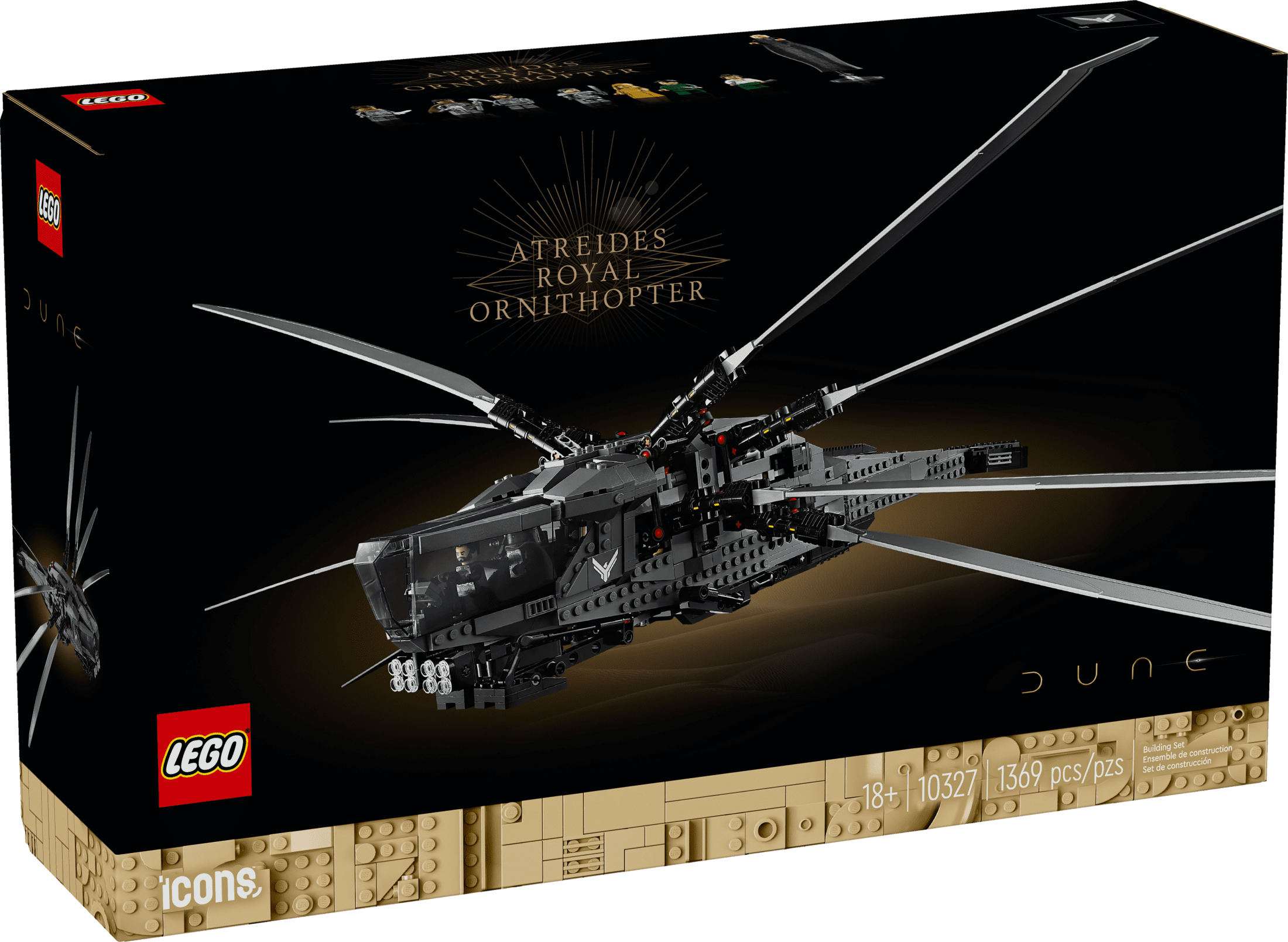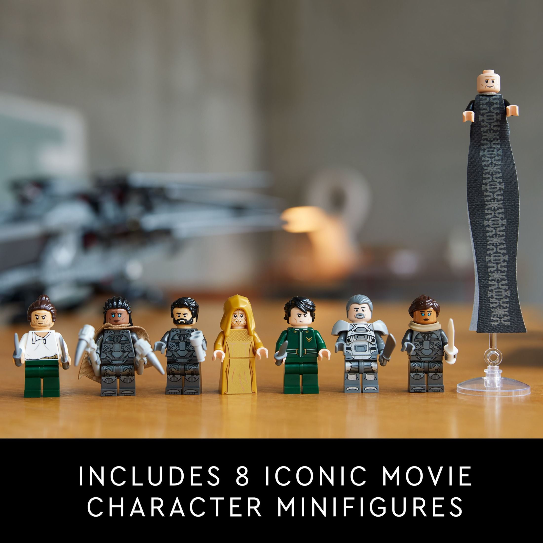 Dune building set for adults – Collectible LEGO Icons Dune Atreides Royal Ornithopter building project for fans of the Dune 2021 movie What’s in the box? – Everything you need to craft a LEGO replica of the Dune Atreides Royal Ornithopter aircraft with foldout, flappable wings and deployable landing gear, plus 8 movie minifigures Minifigure character lineup – Includes Paul Atreides, Lady Jessica, Gurney Halleck, Chani, Leto Atreides, Liet Kynes, Duncan Idaho and Baron Harkonnen in his long robe A movie collectible for build and display – This LEGO replica can be displayed in flight or landing modes and comes with 8 Dune minifigures for creating epic movie scenes A movie-themed adult gift idea – Give this LEGO Icons Dune Atreides Royal Ornithopter construction set as a gift for Dune movie fans and sci-fi lovers Mindful LEGO projects for adults – This LEGO Icons project is part of a range of advanced building sets designed for adults Dimensions – This 1,369-piece model, with wings folded out, measures over 9 in. (23 cm) high, 22 in. (57 cm) long and 31 in. (79 cm) wide