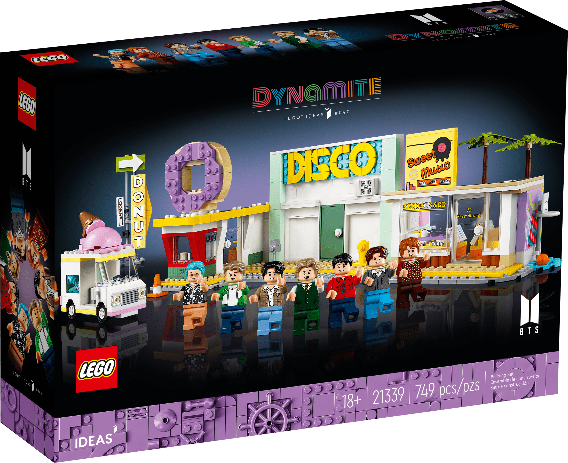 LEGO Ideas Collectible Adult Minifigures Plastic Multicolor, 2.985 lbs LEGO Ideas BTS Dynamite music video set (21339) – Build and display your love for BTS by recreating scenes from their global hit single Dynamite Includes 7 LEGO minifigures of the famous K-pop band – RM, Jin, SUGA, j-hope, Jimin, V, and Jung Kook, each with microphone elements Recreate iconic scenes from the video – Features LEGO brick versions of the disco, record store, and donut store, complete with authentic details Interactive dance feature – Place all the BTS minifigures on the detachable stage and turn the wheel to see them dance together Perfect gift for BTS fans – This collectible 749-piece LEGO Ideas set makes an excellent birthday, holiday, or graduation gift for BTS enthusiasts or LEGO builders Designed for both play and display – The main building model measures over 5.5 in. (14 cm) high, 15 in. (38 cm) wide, and 6 in. (16 cm) deep Comprehensive guide included – Comes with a booklet featuring illustrated instructions, the story of BTS, and interviews with the set’s fan designers and LEGO designers