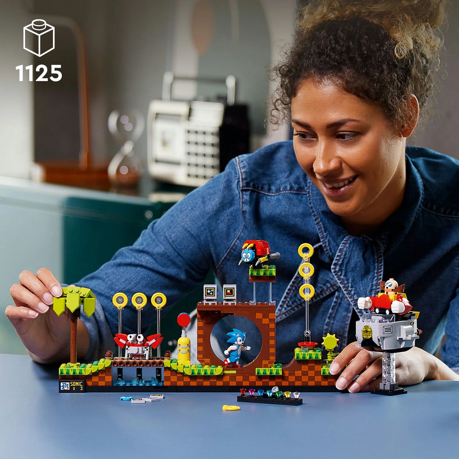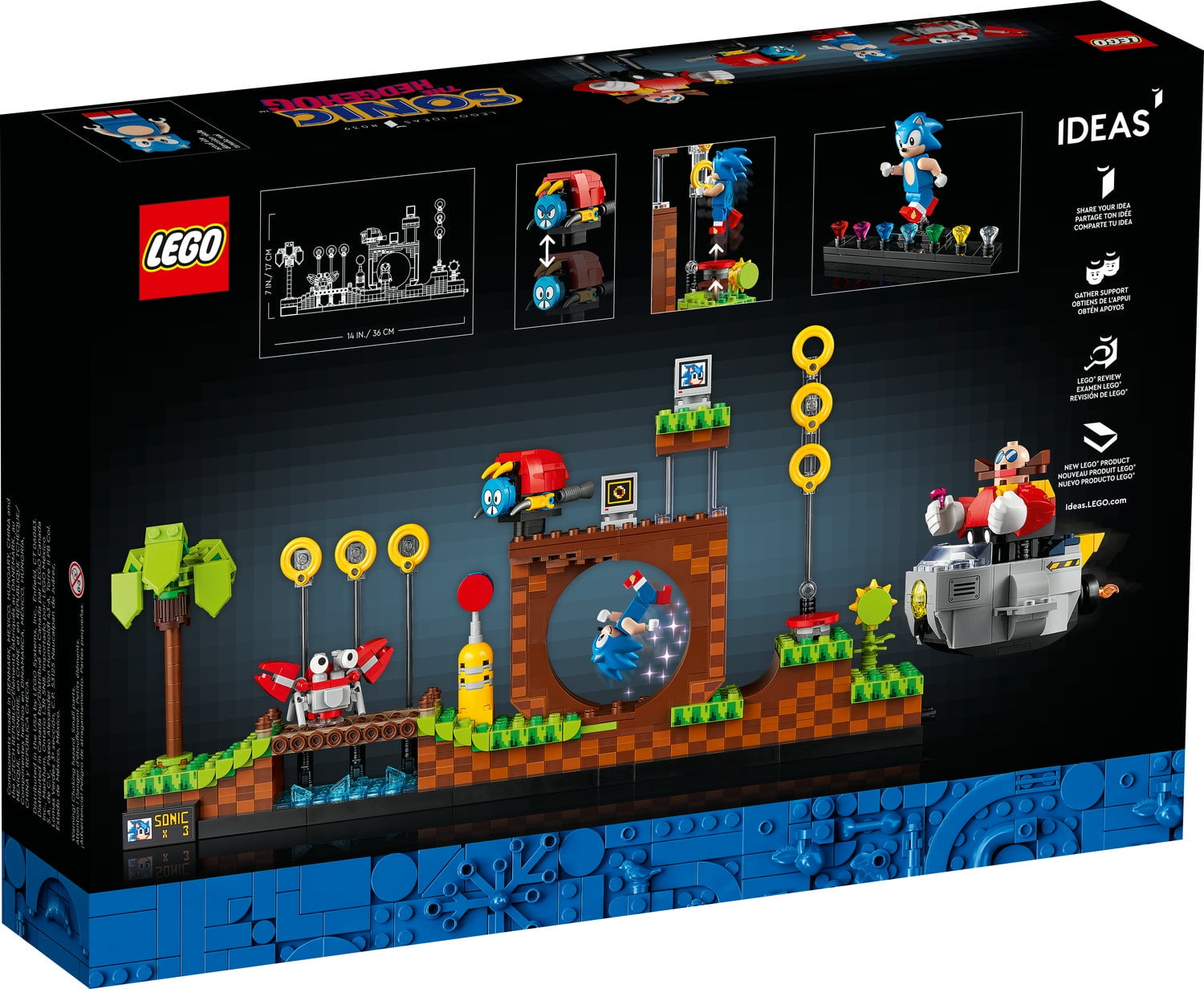 Pay tribute to the classic Sonic the Hedgehog video game and recapture the magic in LEGO style with this brick-built version of the famous game level Includes a Sonic the Hedgehog LEGO minifigure, Dr. Eggman with buildable Eggmobile, Moto Bug with 2 face options, and Crabmeat figures Push the lever and launch the LEGO Sonic minifigure for Super Sonic jumps to evade the Bug and Crabmeat LEGO Sonic figures and collect the rings Authentic details include a palm tree, bridge loop, rings and 2 buildable bonus item TV screens with 5 screen elements and 5 sticker options Earn an emerald for every build you complete, collect all 7 Chaos Emeralds to display on the stand with Sonic and finally defeat Dr. Eggman An authentic recreation of the classic game level and a nostalgic 90’s LEGO set to proudly display in the home or office The model can be rearranged to create alternative levels and makes a great Sonic the Hedgehog gift for all fans