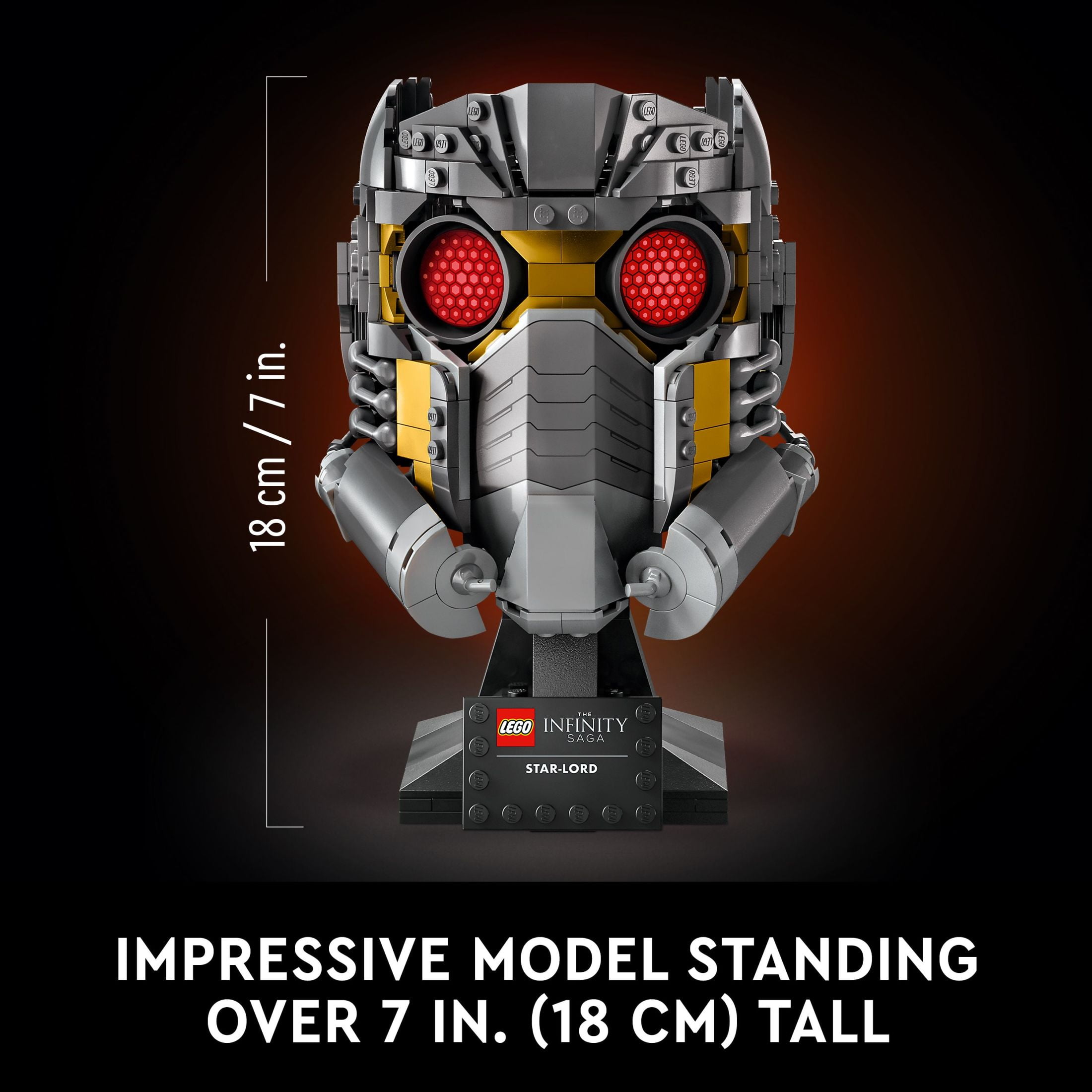 Challenge your creative construction superpowers and capture forever the Guardians of the Galaxy leader’s iconic appearance with LEGO Marvel Star-Lord’s Helmet (76251), a Marvel model for adults fans Display this buildable replica of Star-Lord’s helmet mounted on the included sturdy brick-built base with nameplate as a conversation-starting décor piece for the home or office Lose yourself in an immersive project and rewarding challenge as you capture the authentic details of this piece of comic-book history in LEGO brick-style This hands-on building kit makes a great gift for adults or any Marvel fan, LEGO lover or model maker For added convenience, a digital version of the set’s building instructions can be found on the LEGO Builder app on your mobile device The collection of LEGO Sets for Adults provides a rewarding build-and-display experience to relax and recharge that lasts long after the construction work has been completed The completed collectible Guardians of the Galaxy model measures over 7 in. (18 cm) high, 4.5 in. (12 cm) wide and 5 in. (13 cm) deep. Contains 602 pieces