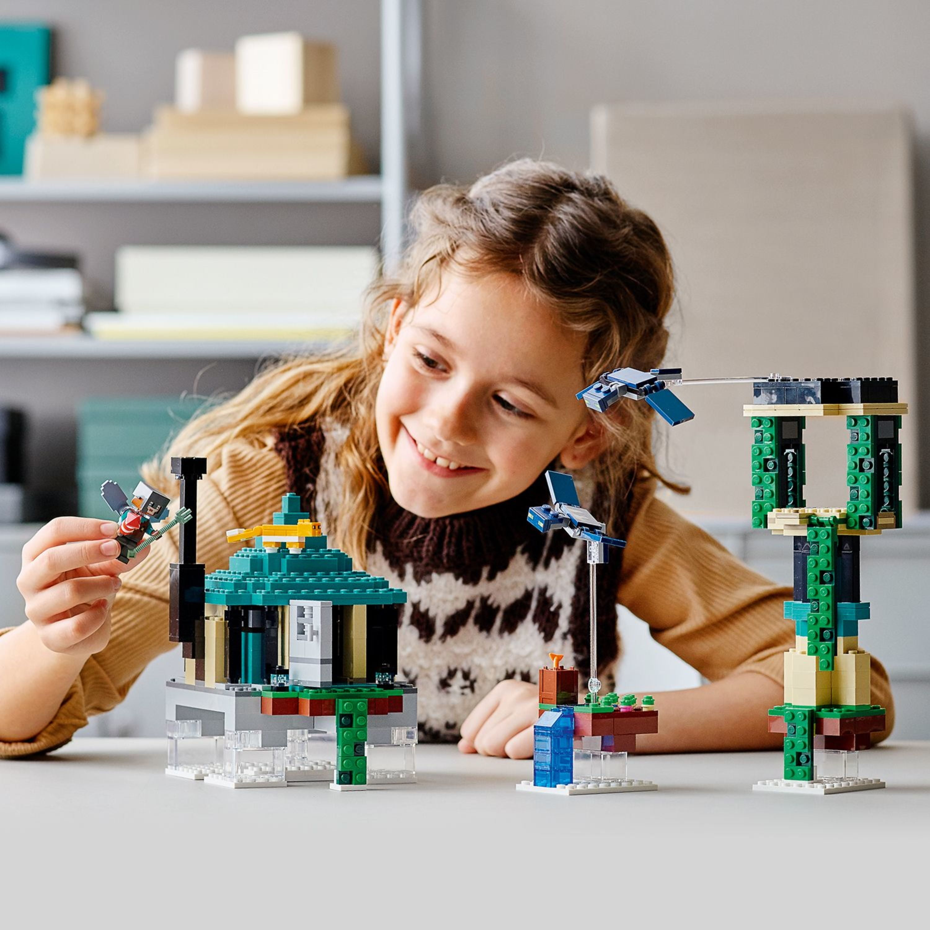 LEGO Minecraft The Sky Tower 21173 incorporates a diverse range of buildable environments that reconfigure in infinite ways to inspire Minecraft adventures that never end Includes a Pilot figure with elytra wings, netherite helmet, firework rocket and trident; 2 flying phantoms; an orange tabby cat; and lots of authentic accessories This fantastically versatile playset encourages kids to continually adapt their creations and explore new adventures. Its just like the video game, but with hands-on, creative construction Minecraft players and creative builders aged 8 and up will enjoy endless hands-on, immersive pleasure with this imagination-inspiring playset Measuring over 7 in. 18 cm high, 6 in. 15 cm wide and 5 in. 12 cm deep, this reconfigurable set is ideal for imaginative play, creative display and combining with other LEGO Minecraft sets