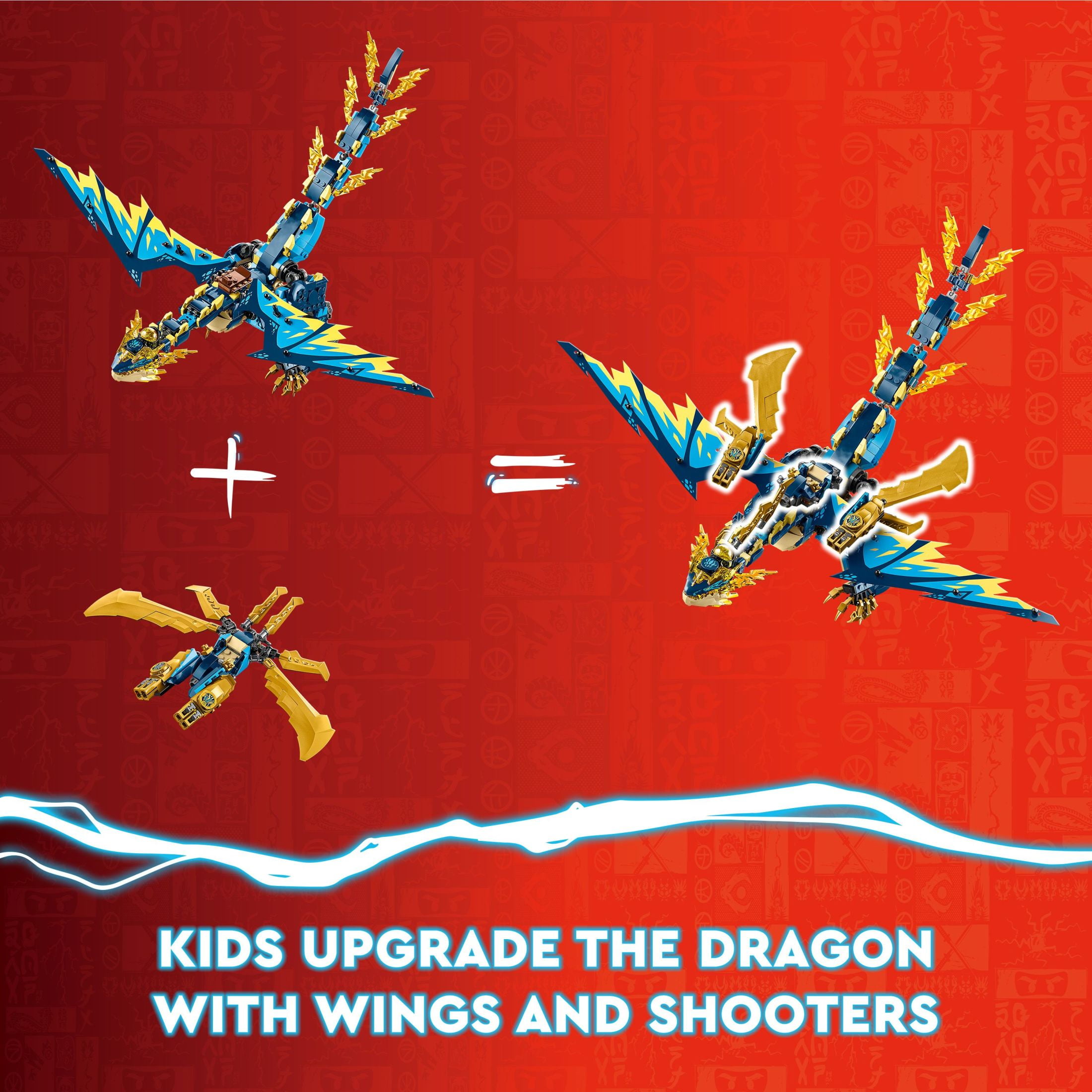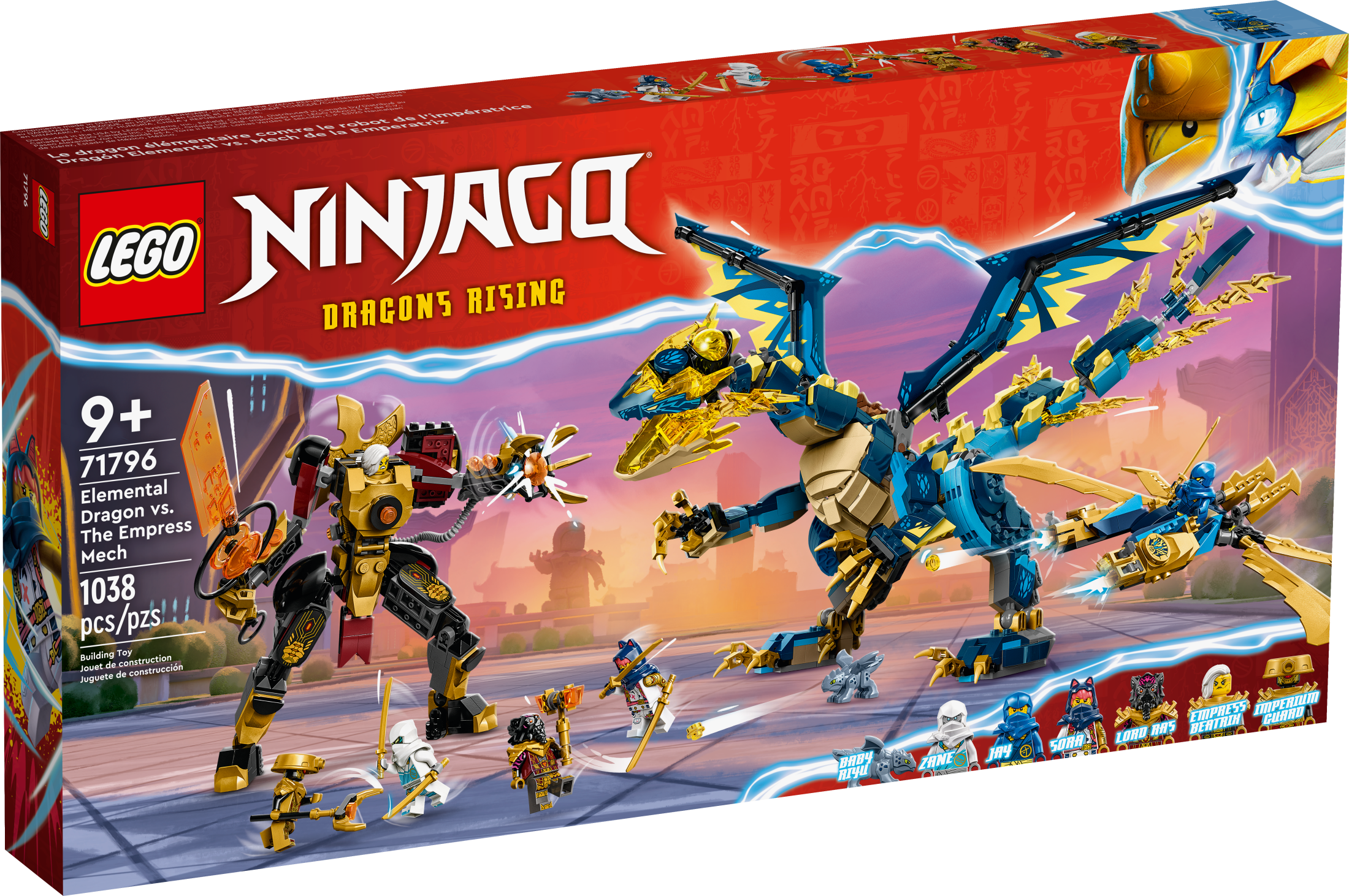 Dragon and mech playset – Boys and Girls ages 9+ can play out an epic showdown from the NINJAGO Dragons Rising TV series with the Elemental Dragon vs. The Empress Mech (71796) toy set 6 minifigures – Jay, Sora and Zane, who come with 2 golden katanas each to take on Lord Ras and his hammer, Empress Beatrix with her Imperium sword and an Imperium Guard with a staff Flyer vehicle – The ninja can take to the skies in a flyer armed with golden blade wings and powerful shooters that can fire 4 studs Upgradable ninja dragon – The dragon Jiro can be upgraded into a bigger and more imposing model by adding the golden blade wings and stud shooters from the flyer Collectible yellow dragon power element – The ninja and Empress Beatrix are fighting over this power source, and kids can collect 4 more power elements in different colors in other LEGO NINJAGO sets LEGO gift idea – This 1,038-piece premium construction set for kids aged 9+ provides a fun-filled build-and-play experience and can be given as a birthday present or holiday gift Display item – Standing over 9.5 in. (25 cm) tall, Jiro the elemental dragon can be displayed in kids’ bedrooms after they finish playing out daring clashes with it