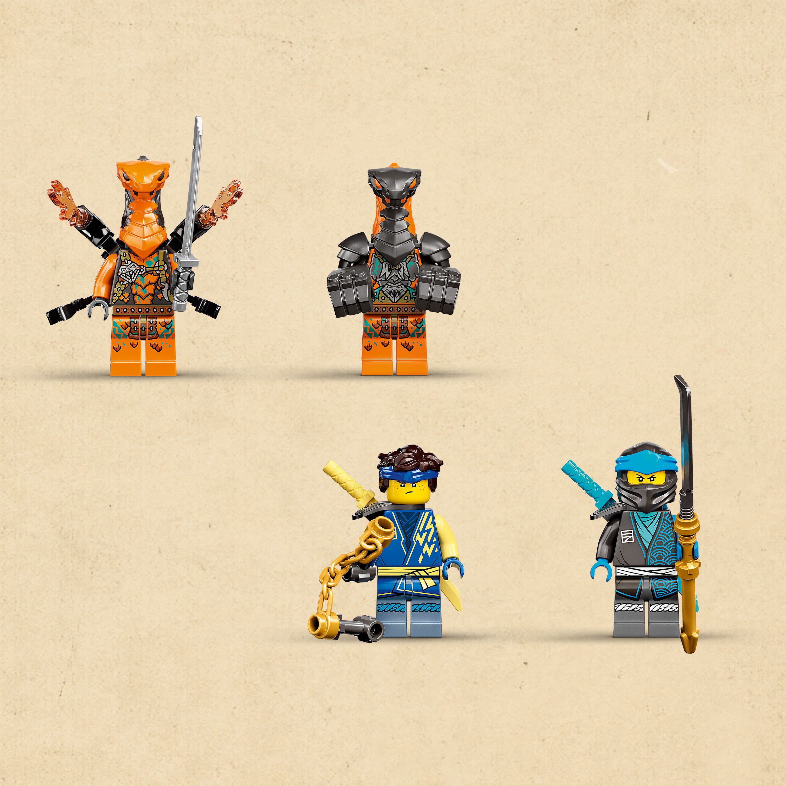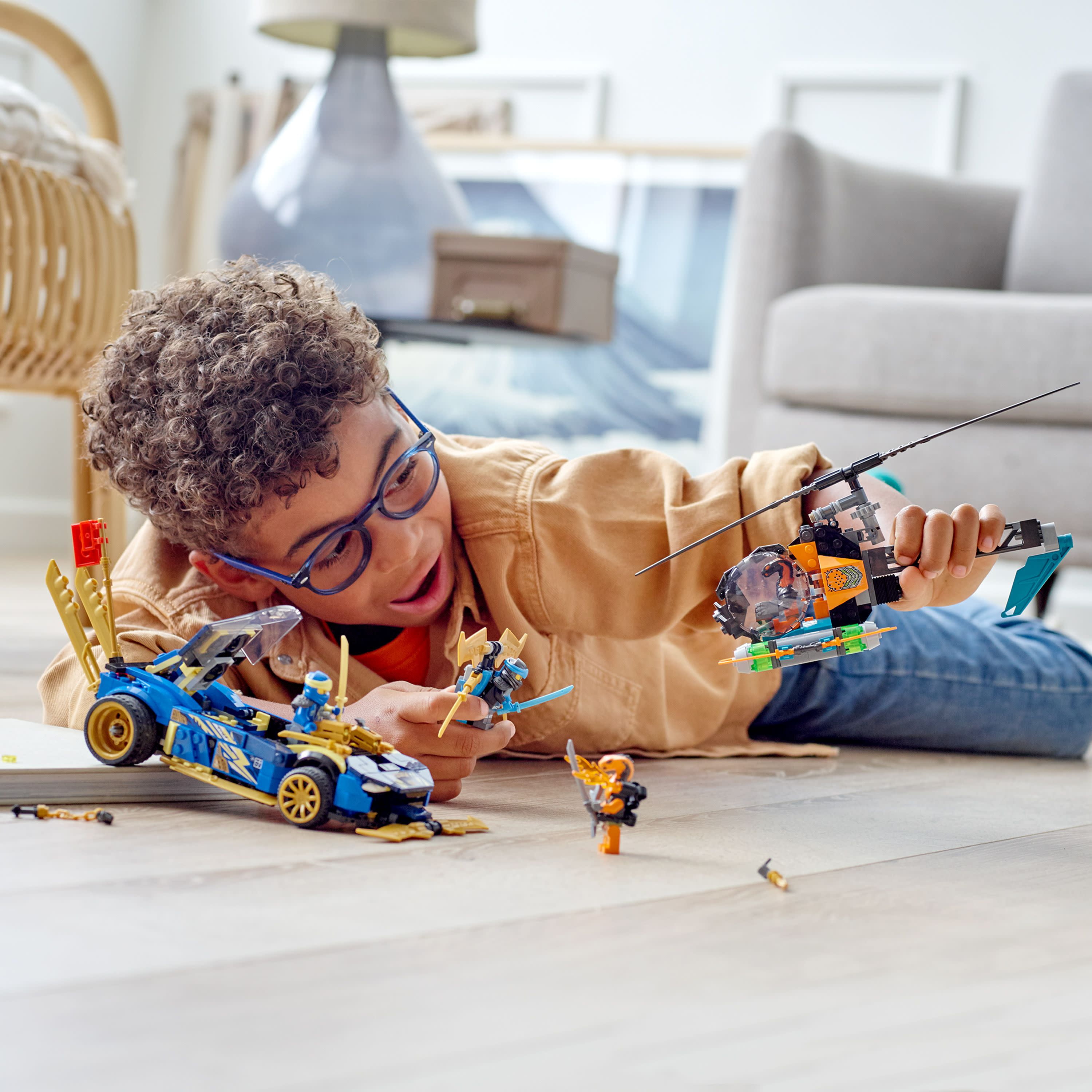Kids can role-play battles in the air or on the ground with this LEGO NINJAGO Jay and Nya’s Race Car EVO and helicopter set with 3 vehicles This set comes with 3 vehicles: a LEGO Ninjago race car featuring a detachable flyer, and an armored toy helicopter with rotating blades Includes 4 LEGO NINJAGO minifigures: Jay with a sword, Nya with a spear, plus snake warriors Cobra Mechanic with a sword and Boa Destructor When kids complete their mission and defeat the snake warriors, they are rewarded with a Teamwork banner to display on the car Look out for banners in 7 other sets, including Ninja Dojo Temple 71767, Kai’s Fire Dragon EVO 71762 and Ninja Ultra Combo Mech 71765 Using the free LEGO Building Instructions app, builders can zoom, rotate and visualize the model on their smartphones and tablets NINJAGO toys make fantastic birthday gifts for kids 7 + years old who are into ninjas, racing cars and other vehicles!
