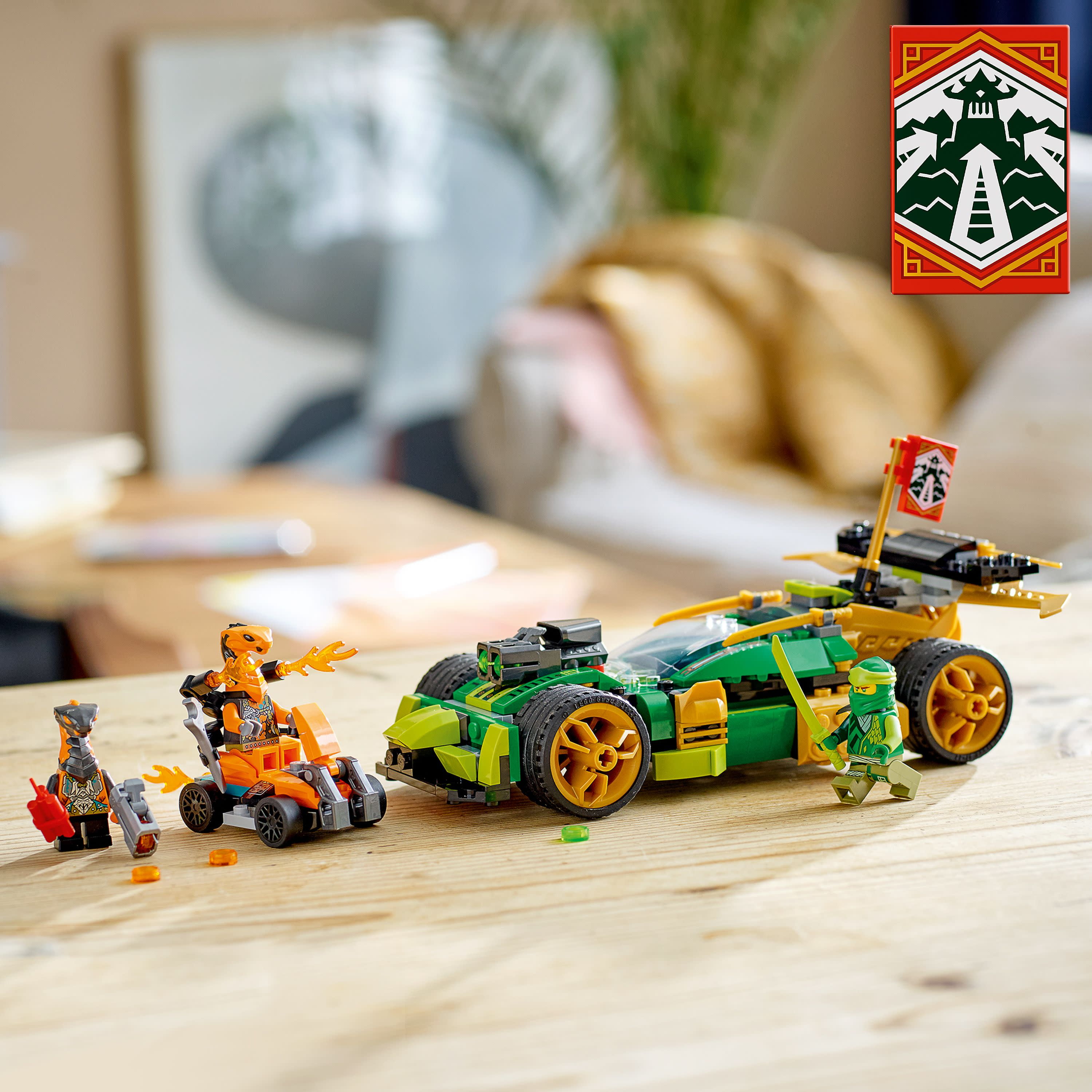 Features 3-in-1 NINJAGO racing car toys that can be upgraded into 3 different models, and 3 cool LEGO NINJAGO minifigures with weapons Transform the racing car toy from a buggy into a powerful and fast vehicle with armor, gold side panels, 2 shooters & a spoiler with blades Kids build LEGO NINJAGO Lloyd’s car toy in 3 stages, from a buggy to an armored vehicle ready for battle to take on the evil snake warriors Includes NINJAGO Lloyd with a sword, Cobra Mechanic on a quad bike with a flamethrower, and Python Dynamite with a gun and stick of dynamite When kids complete their missions and defeat the snakes, they are rewarded with an Adaptability banner to display on the car Look out for banners in 7 other sets including Jay’s Thunder Dragon EVO 71760, Zane’s Power Up Mech EVO 71761 and Kai’s Fire Dragon EVO 71762 This cool NINJAGO EVO toy cars set allows kids to build Lloyd’s car in 3 quick stages and makes a mega fab birthday gift for kids 6 + years old