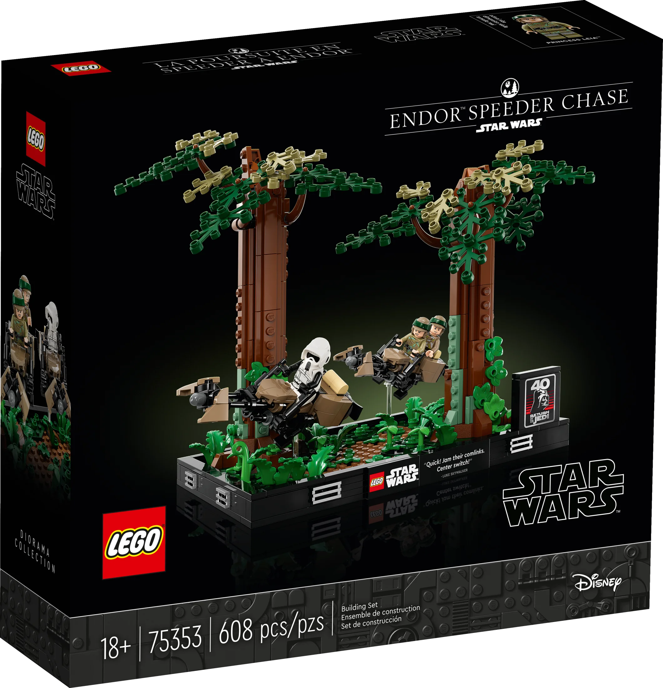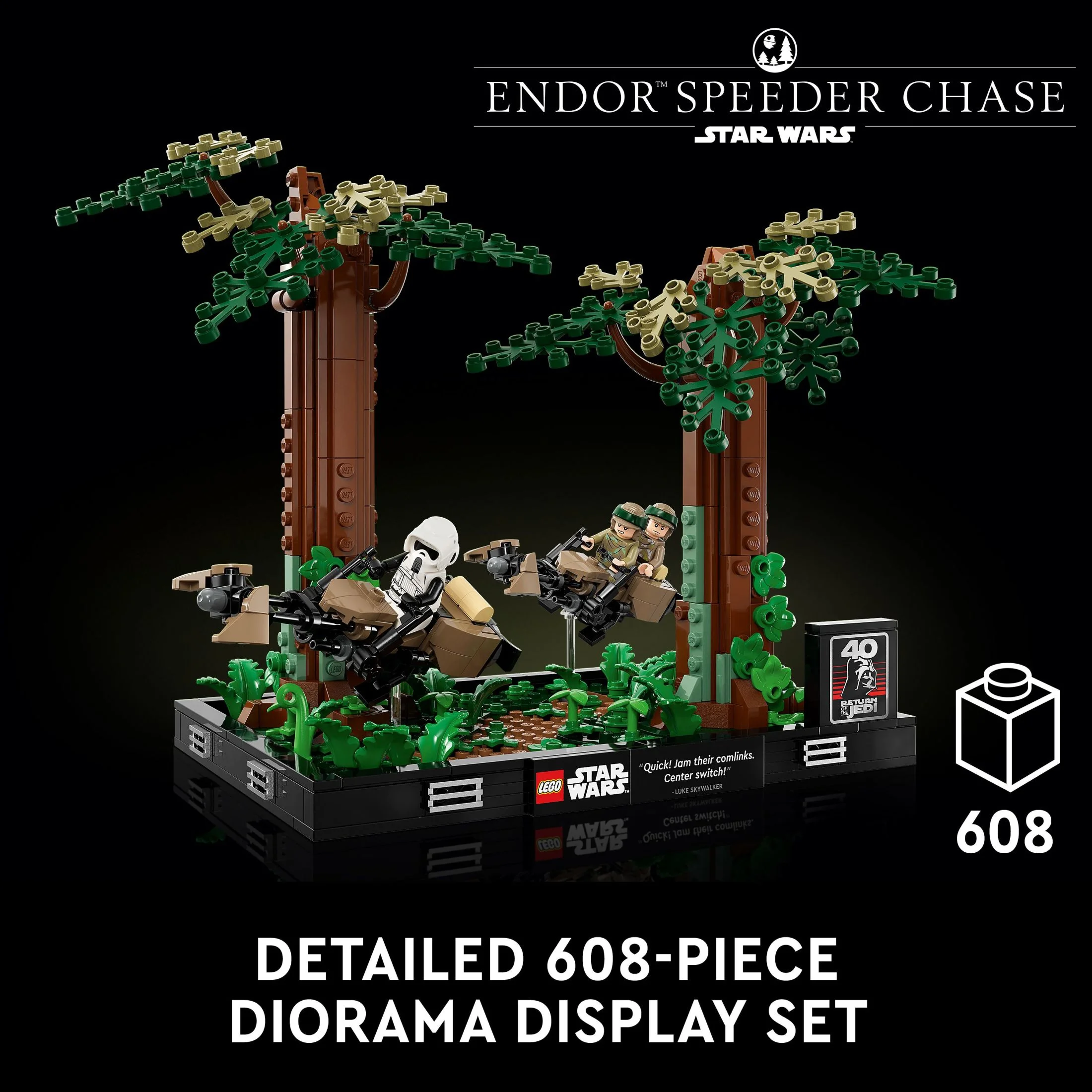 Create a dynamic LEGO brick-built snapshot of the iconic speeder chase through the forests of Endor from Star Wars: Return of the Jedi with this detailed Endor Speeder Chase Diorama (75353) Celebrate the Original Star Wars Trilogy with 3 LEGO Star Wars Minifigures, including Princess Leia and Luke Skywalker in Endor outfits and a Scout Trooper. Luke has a green lightsaber while Leia and the Scout Trooper each have a blaster Build authentic details such as 2 speeder bikes (1 for Leia and Luke and 1 for the Scout Trooper) with transparent elements to pose them at dynamic angles, 2 buildable trees, fern elements and a plaque marking the 40th anniversary of Star Wars: Return of the Jedi Grow your collection with this set, which is part of a series of collectible, buildable LEGO Star Wars diorama models that depict iconic Star Wars moments Treat yourself or give this buildable set for adults as a holiday gift or graduation present to a friend with a passion for classic Star Wars or a collector of LEGO Star Wars dioramas This buildable Star Wars display model great for dorm room or home decor measures over 8 in. (20 cm) high, 11 in. (28 cm) wide and 7 in. (18 cm) deep. Contains 608 pieces