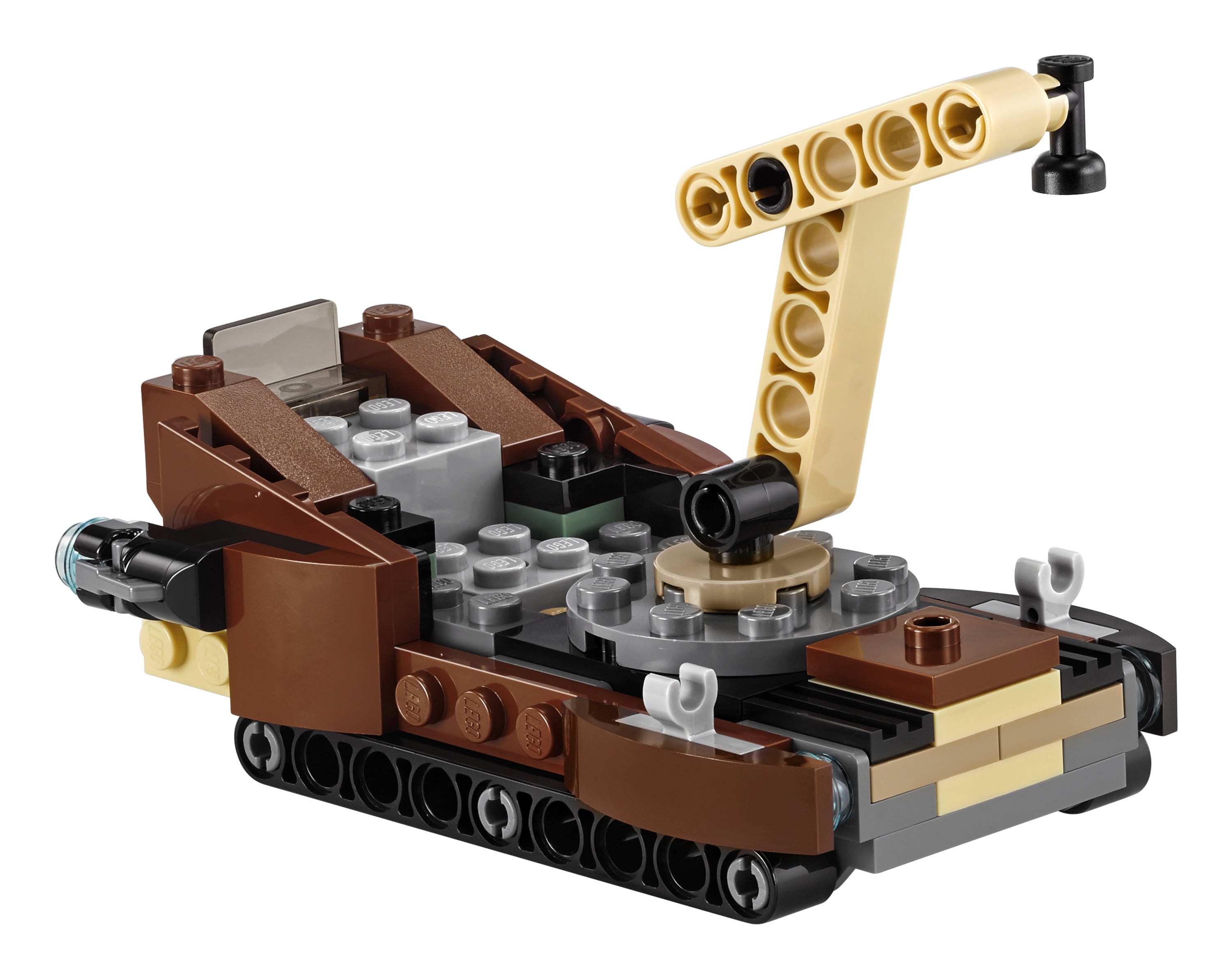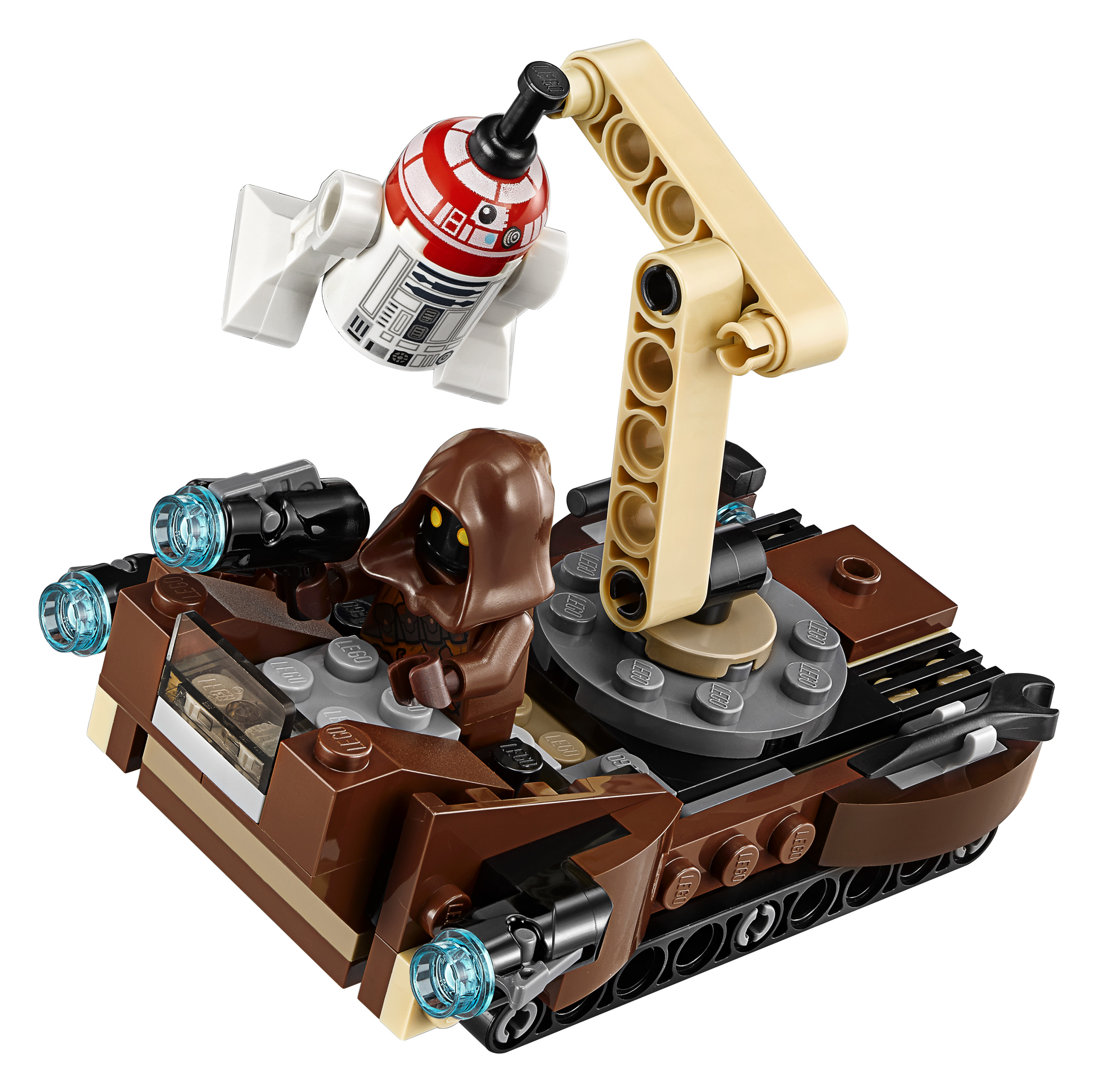 ? Includes 3 minifigures: 2 Jawas and a Tusken Raider, plus an astromech droid. ? Features a service vehicle with 2 stud shooters and an articulated crane to pick up the included astromech droid. ? Weapons include 2 stud blasters for the Jawas and the Tusken Raider?s gaffi stick. ? Recreate your own desert-planet scenes from Star Wars: A New Hope. ? This LEGO® Star Wars toy is suitable for ages 6-12. ? Service vehicle measures over 2? (7cm) high, 3? (9cm) long and 2? (7cm) wide.
