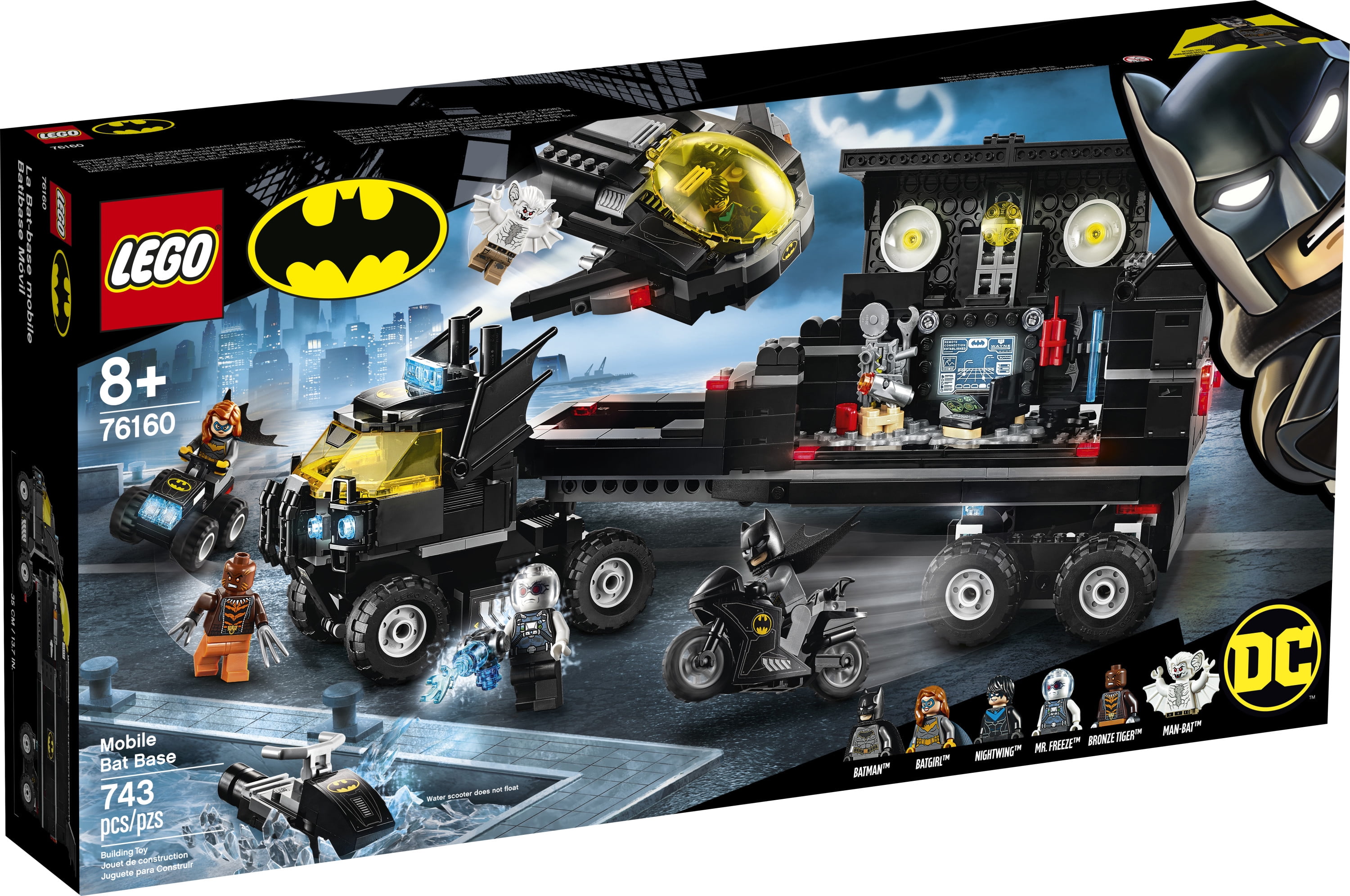 The LEGO DC Mobile Bat Base (76160) toy is packed with iconic vehicles, awesome gadgets and cool weapons for kids to use as they help Batman and Batgirl round up 4 notorious Super-Villains This ‘Batcave on wheels’ set incorporates a Batjet, BatQuad, motorcycle, water scooter, toy truck and 6 minifigures from the Batman movies: Batman, Batgirl, Nightwing, Mr. Freeze, Man-Bat and Bronze Tiger The toy’s opening roof and side provide easy access to Batman’s Batcave accessories; With so much to discover, and 6 minifigures from the Batman movies, the possibilities for independent imaginative play are endless It’s not just Batman movie fans who’ll be thrilled to receive this mobile Batcave building toy as a birthday gift; It’s a great ‘build your own truck’ playset for all children aged 8 and up who enjoy imaginative play Measuring over 14″ (38cm) long, the Mobile Bat Base vehicle is the perfect size for hands-on play and big enough to contain everything kids needs for epic super-hero adventures