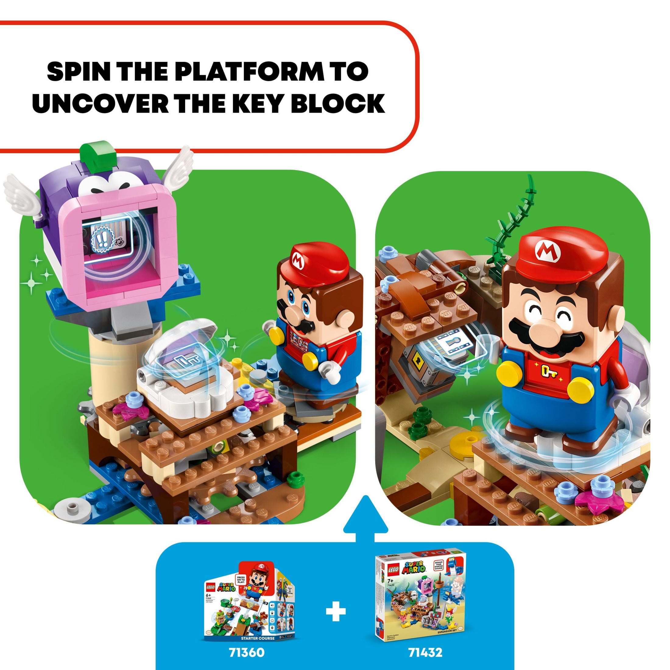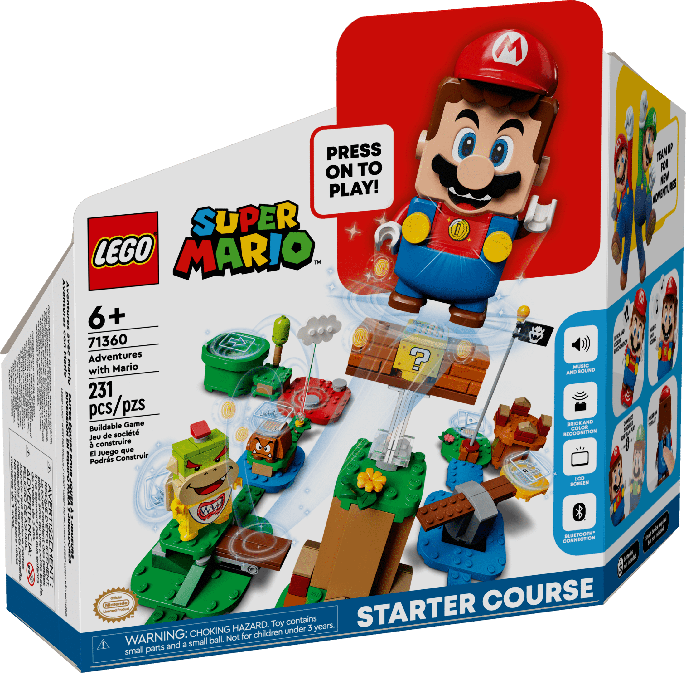 Fans can begin exploring the fun-packed LEGO Super Mario universe with the Adventures Mario Starter Course 71360, featuring 7 action bricks for different interactions with the LEGO Mario figure LEGO Mario has color sensors, plus LCD screens in his eyes, mouth and belly to display over 100 different instant reactions to movement. Also included is a speaker that plays iconic sounds and music from the video game In this super toy playset, LEGO Mario collects virtual coins as he runs and jumps from the Start Pipe to the Goal Pole via LEGO bricks, cloud platforms, the Question Block and clashes with the Goomba figure and Bowser Jr. figure This 231-piece, collectible LEGO playset makes a cool gift for kids aged 6+ who can build and play their own way and learn to solve problems while having lots of creative fun Rearrange the Starter Course and combine with LEGO Super Mario Expansion Sets to create more challenging levels and games to play with and against friends The LEGO Mario figure is powered by 2 x AAA batteries (not included), delivering a highly interactive in-game experience where players get instant feedback and rewards for creativity