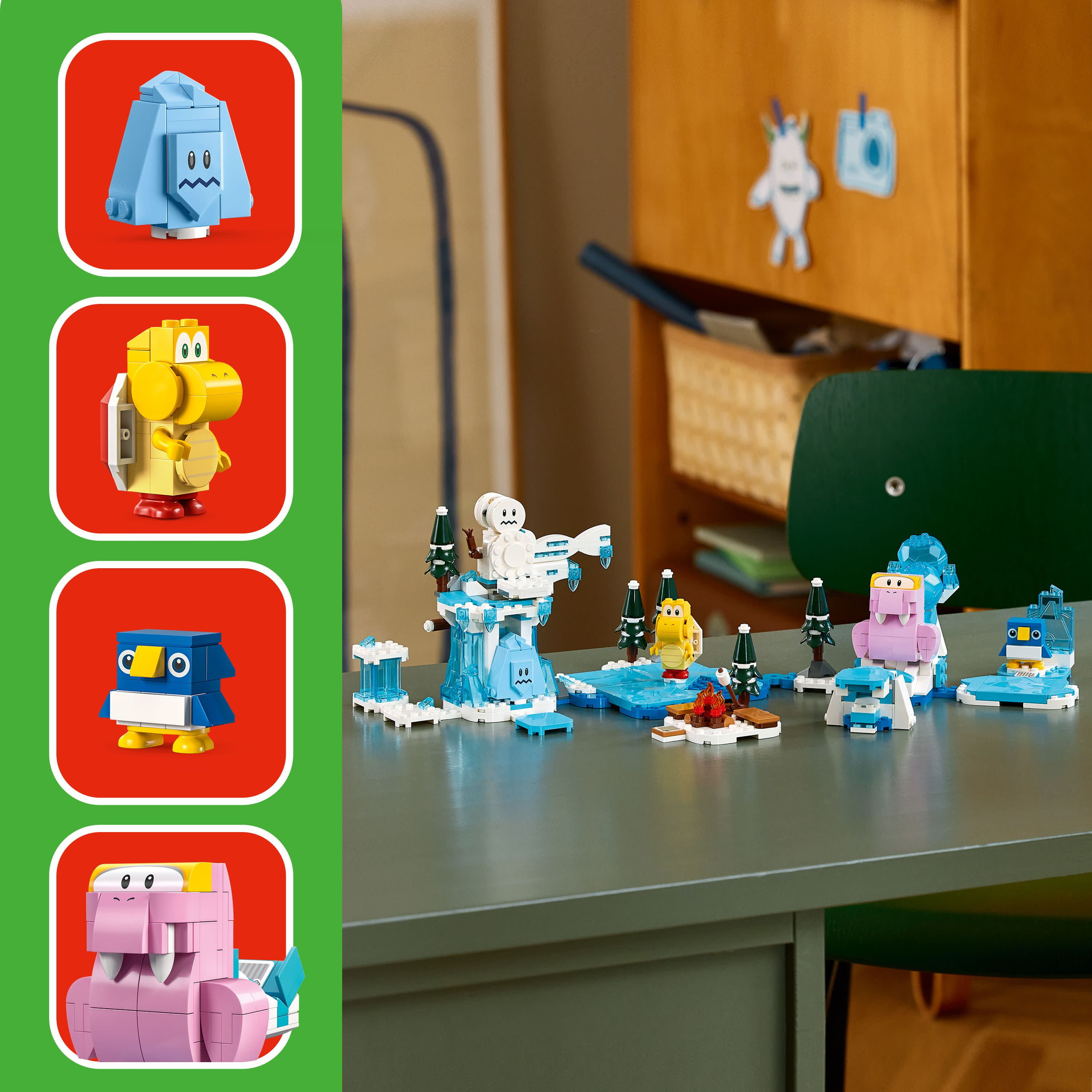 Kids can add frozen fun to Super Mario levels with the Fliprus Snow Adventure Expansion set featuring 4 characters and icy adventure elements Includes 4 LEGO Super Mario figures: a Fliprus, a Freezie, a Red Koopa Troopa and a toy baby penguin, plus a toy snowman to build and a platform Players can ice skate through the course while being careful not to fall in the water (Starter course 71360, 71387 or 71403 is required to play) Kids knock down the Red Koopa Troopa, jump onto the platform to battle Fliprus and defeat the Freezie to reach the hidden fruit element Players earn digital coins by helping LEGO Mario, LEGO Luigi or LEGO Peach characters (not included) while role-playing with this Expansion Pack The Super Mario buildable game is great for kids who love Super Mario Bros. Visit LEGO.com/devicecheck to download the LEGO Super Mario app LEGO Super Mario building toys make awesome collectible toys for kids Ages 7+ years old who already own a LEGO Super Mario Starter Course