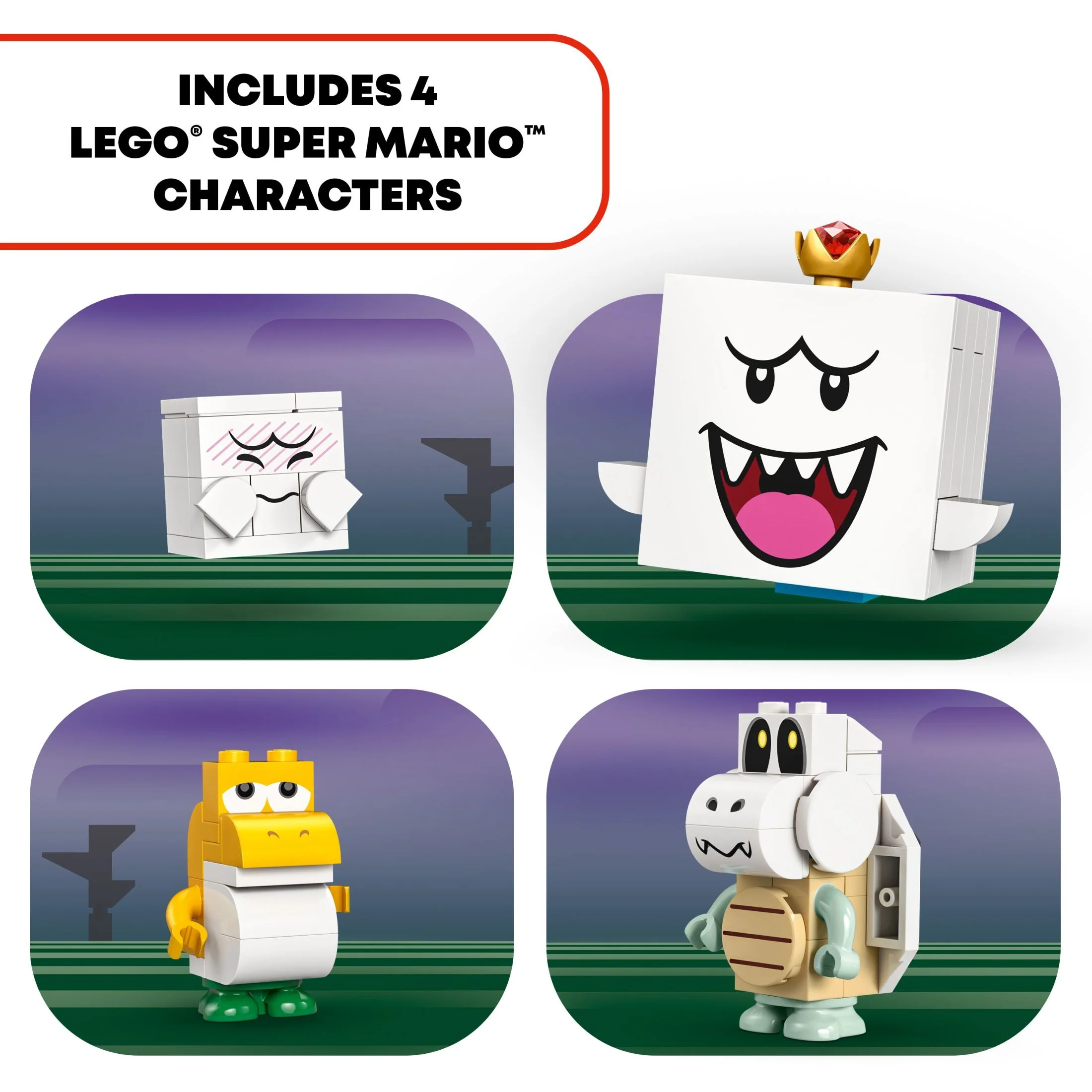 LEGO SUPER MARIO HAUNTED HOUSE AND GHOST BUILDING TOY FOR KIDS – Explore King Boo’s Haunted Mansion, battle ghostly enemies and search for the key to the treasure chest with this Nintendo collectible set INCLUDES 4 LEGO SUPER MARIO VIDEO GAME TOY FIGURES – King Boo, a Yellow Baby Yoshi, a Dry Bones and a Boo ADVENTURE PLAYSET – The LEGO brick mansion opens out for play and features an elevating sofa, a bookcase with key-reveal function, plus a Coin Block, Chest Block and Key Block INTERACTIVE DIGITAL PLAY – Help LEGO Mario, LEGO Luigi or LEGO Peach (figures not included) find the key to the treasure chest, topple King Boo from the table in the courtyard and more A HELPING HAND – Download the companion LEGO Super Mario app for building instructions, creative tips and more; for a list of compatible Android and iOS devices, visit LEGO.com/devicecheck INSPIRE CHILDREN’S IMAGINATIONS – LEGO Super Mario toy playsets are designed for solo or social play, offering role play, digital coin-collecting and fun challenges through expansion and rebuilding DIMENSIONS – The toy mansion in this 932 piece set makes a great Halloween gift and measures over 7.5 in. (18 cm) high, 9 in. (23 cm) wide and 7.5 in. (19 cm) deep. It can also be added to other LEGO Super Mario sets, sold separately