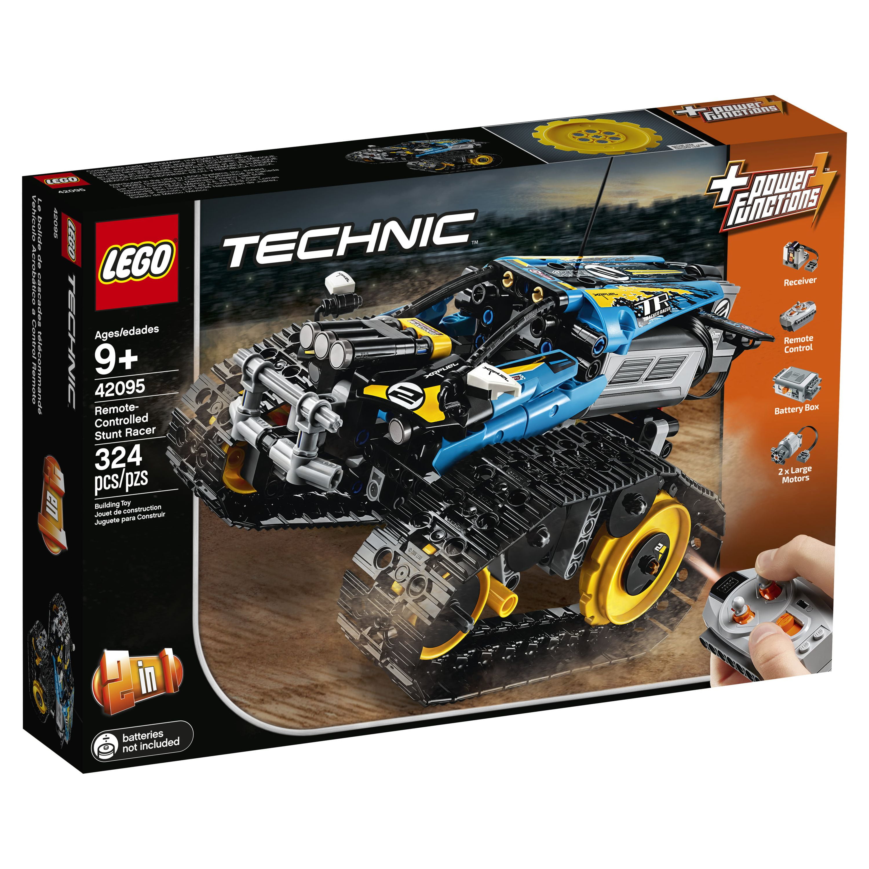 Build a LEGO Technic Remote-Controlled Stunt Racer to traverse rough terrain and pull high-speed wheelies, turns and spins! This 2-in-1 remote-controlled tracked vehicle rebuilds into a Remote-Controlled Racer Remote-Controlled Stunt Racer measures over 6” (17cm) high, 8” (22cm) long and 5” (15cm) wide; Remote-Controlled Racer measures over 4” (12cm) high, 7” (20cm) long and 7” (19cm) wide 324 pieces – For boys and girls aged 9+ and for fans and big kids of all ages This LEGO Technic RC Stunt Racer 42095 set can be built together with all other original LEGO sets and LEGO bricks for creative building