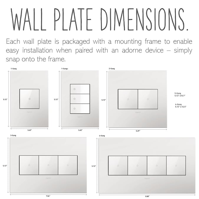 - The adorne 3 gang wall plate is perfectly sized to fit any combination of up to three standard and up to six half-sized adorne switches, outlets or dimmers