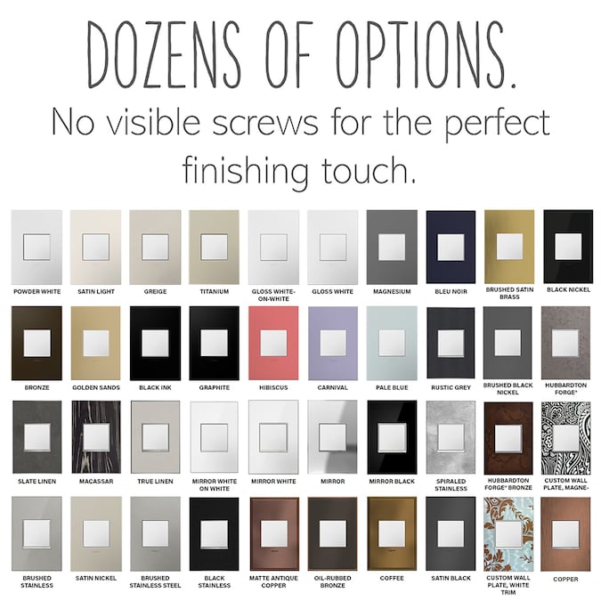 The adorne collection by Legrand offers solutions to match any taste and finishes to fit any personality. Whether you favor the clean lines of modern design, or cozy, cottage-style comfort, or even the classic elegance of a more traditional style, adorne is built to fit. Take your pick of white, magnesium, or graphite switches, dimmers, and outlets, and match them with a wide array of wall plate options. You will find everything from lush natural woods, metals, and fabrics to a brilliant spectrum of colorful solids. Watch these usually forgotten finishing touches transform your walls from blah to breathtaking, letting the personality of your design shine through.