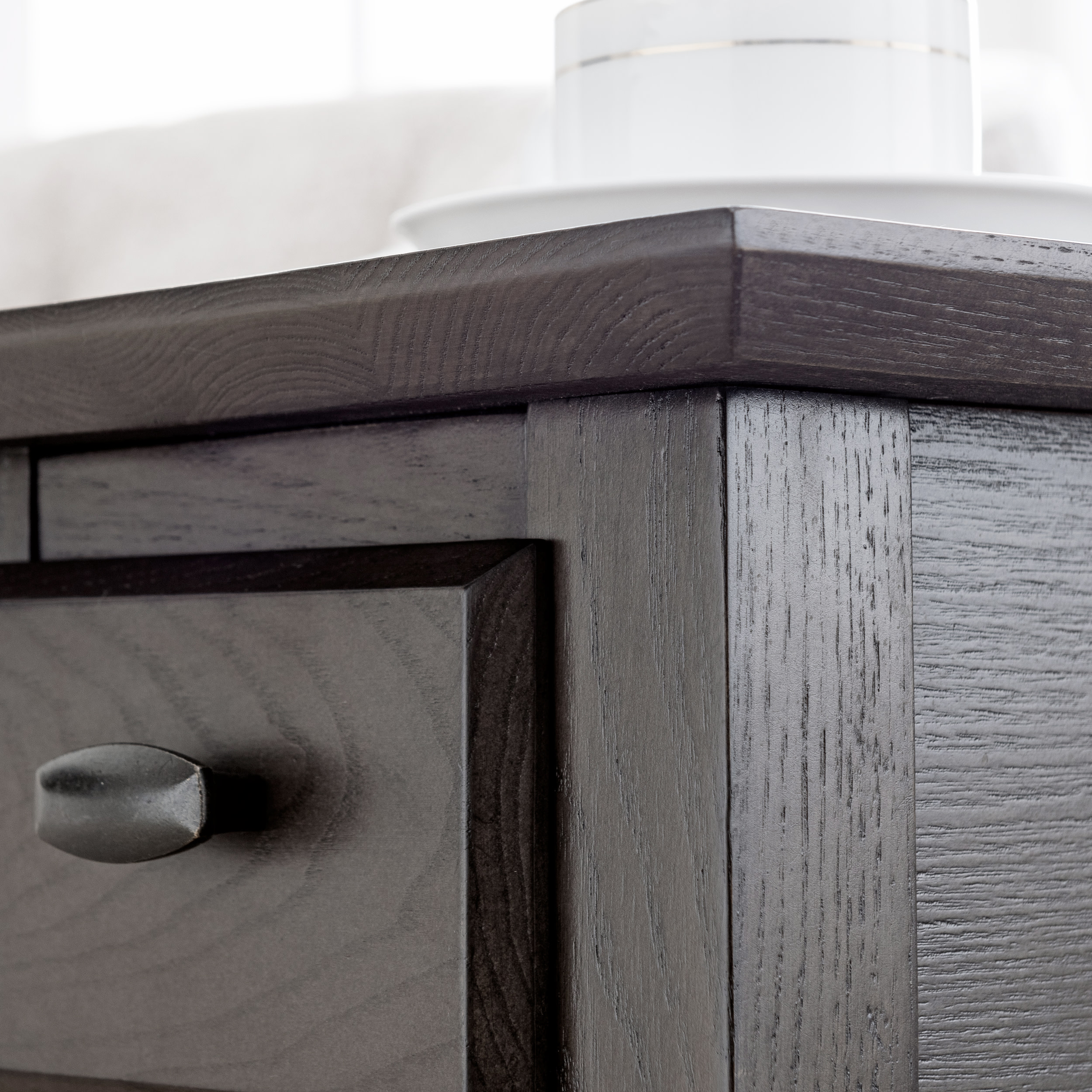 Assembled Dimensions: 10 inches L x 24 inches W x 24 inches H Solid wood drawer box with matte black drawer pull Lower display shelf Soft Smoke Gray finish Simple assembly in minutes All solid wood construction Fits perfectly next to recliners or in small spaces