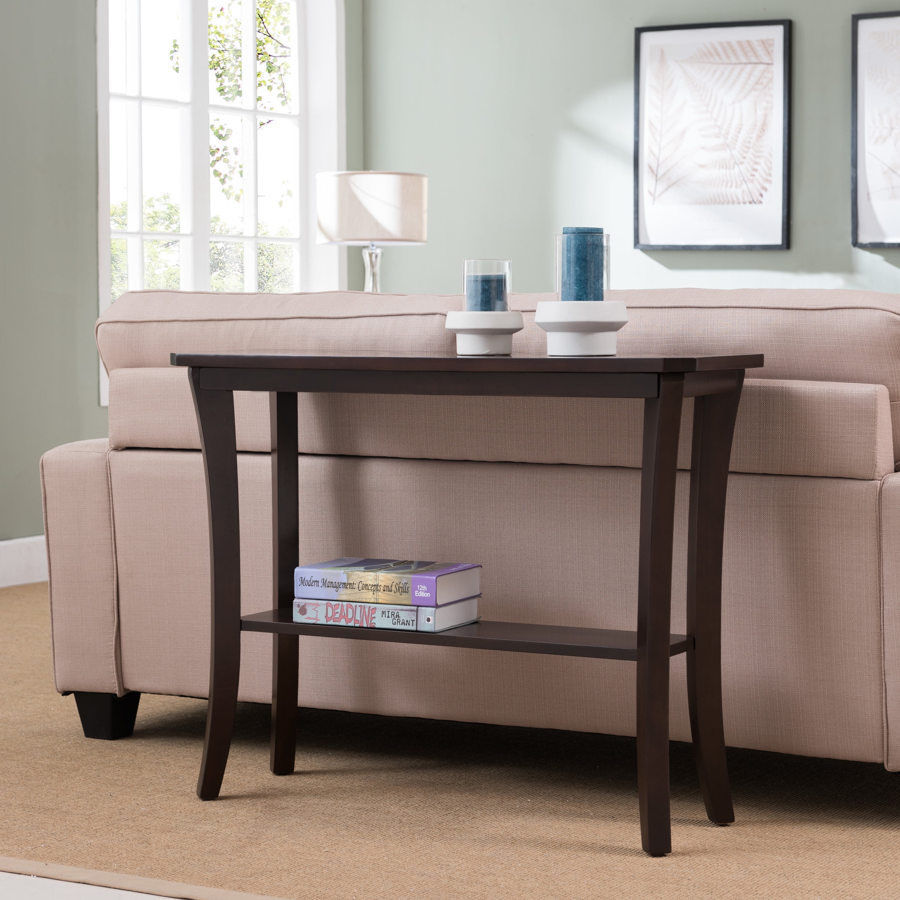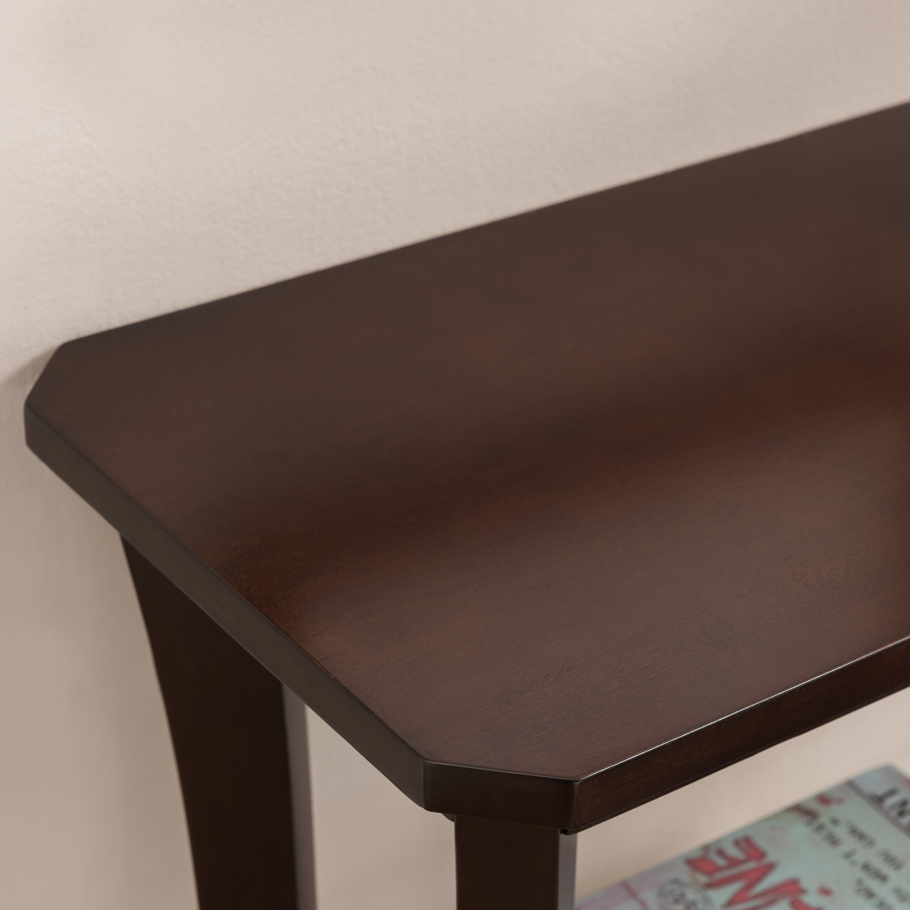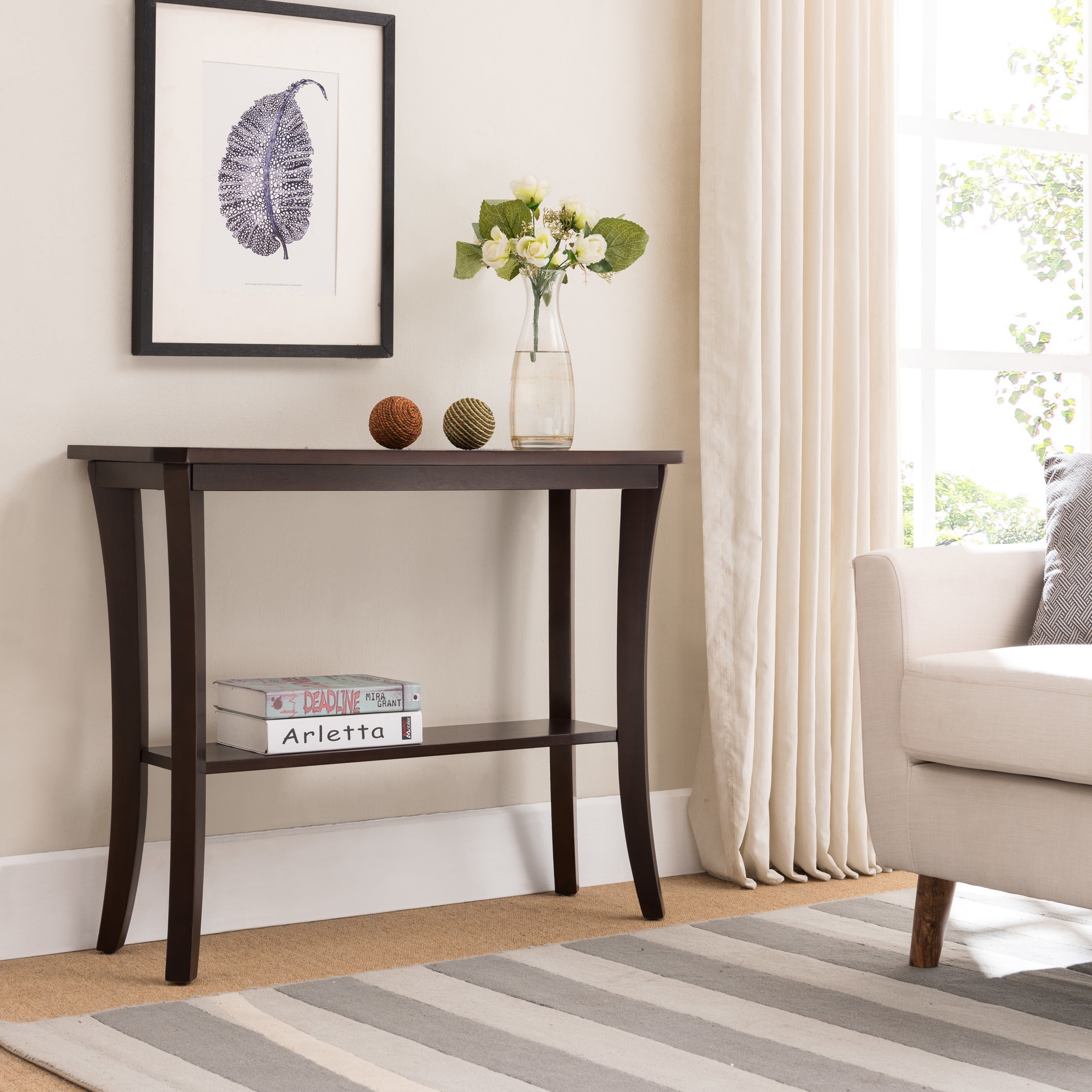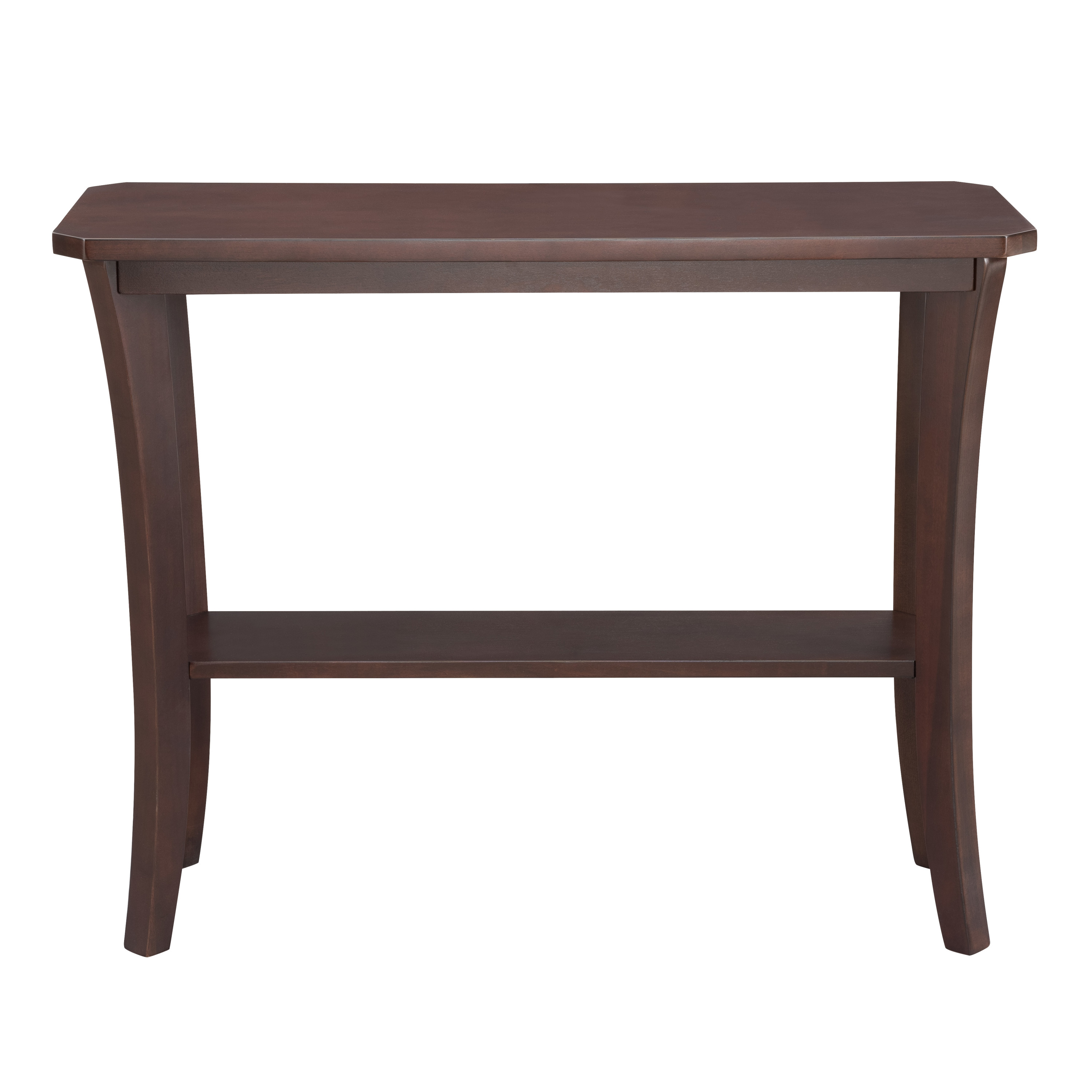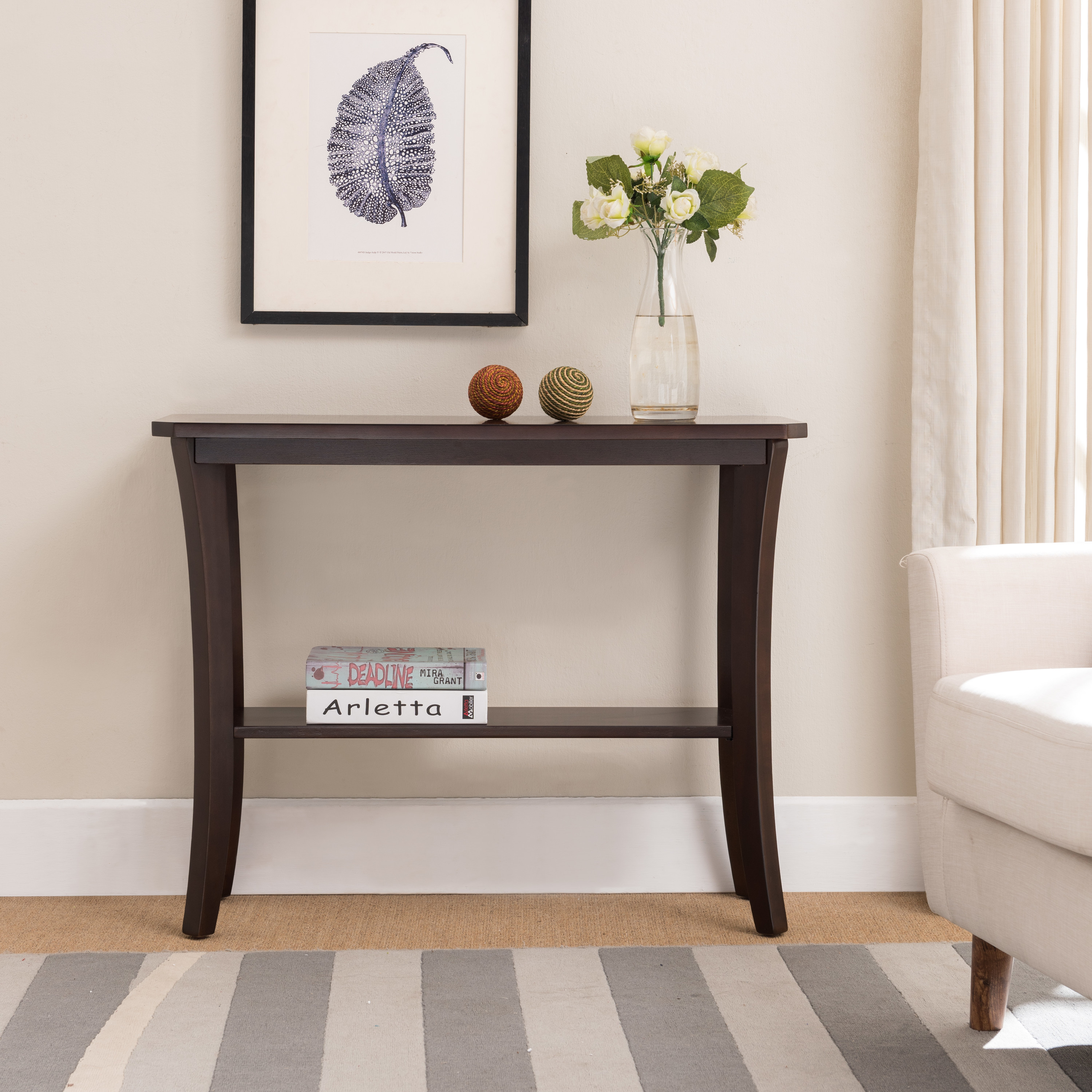 The Boa Console Hall Stand by Leick Home brings a touch of glamour and practicality to entryways, hallways, foyers, and living rooms. Whether used to hold keys and mail in an entryway, as a stylish accent behind a sofa, or as a functional addition in a hallway, this console table offers versatile use for any space. The gracefully curved sabre leg design and rich chocolate cherry brown finish provide a timeless aesthetic that enhances both traditional and modern decor styles. Designed with a space-saving silhouette, it fits perfectly against walls, making it ideal for apartments, condos, and smaller homes where maximizing floor space is essential. Crafted from solid wood, this sturdy table is built for everyday use, offering long-lasting durability. The cut-corner tabletop design eliminates sharp edges, making it safer for high-traffic areas and homes with children or pets. A lower display shelf provides ample space for books, baskets, plants, or decorative items, helping to keep your space organized and stylish. Measuring 38 inches wide, 14 inches deep, and 30 inches high, the Boa console table offers the perfect balance of storage and style without overwhelming your space. Designed for easy assembly, it includes clear instructions and all necessary tools for a quick, hassle-free setup. With a weight capacity of 100 lbs., this table can easily support lamps, framed photos, and other essentials. Trust Leick Home’s 150+ years of craftsmanship to bring quality and timeless design to your home, backed by a 1-year limited warranty.