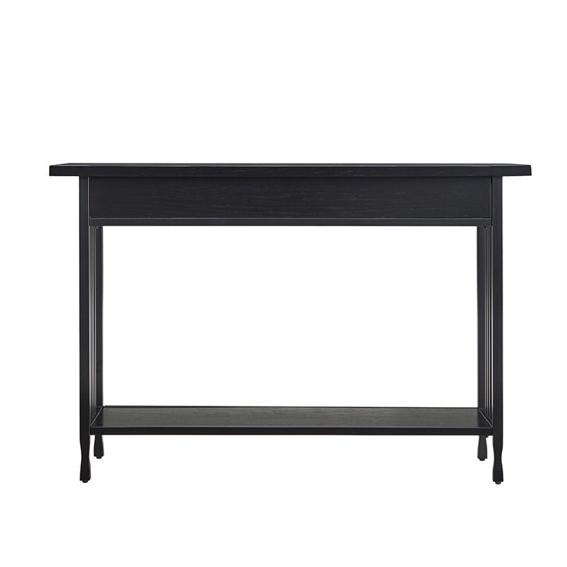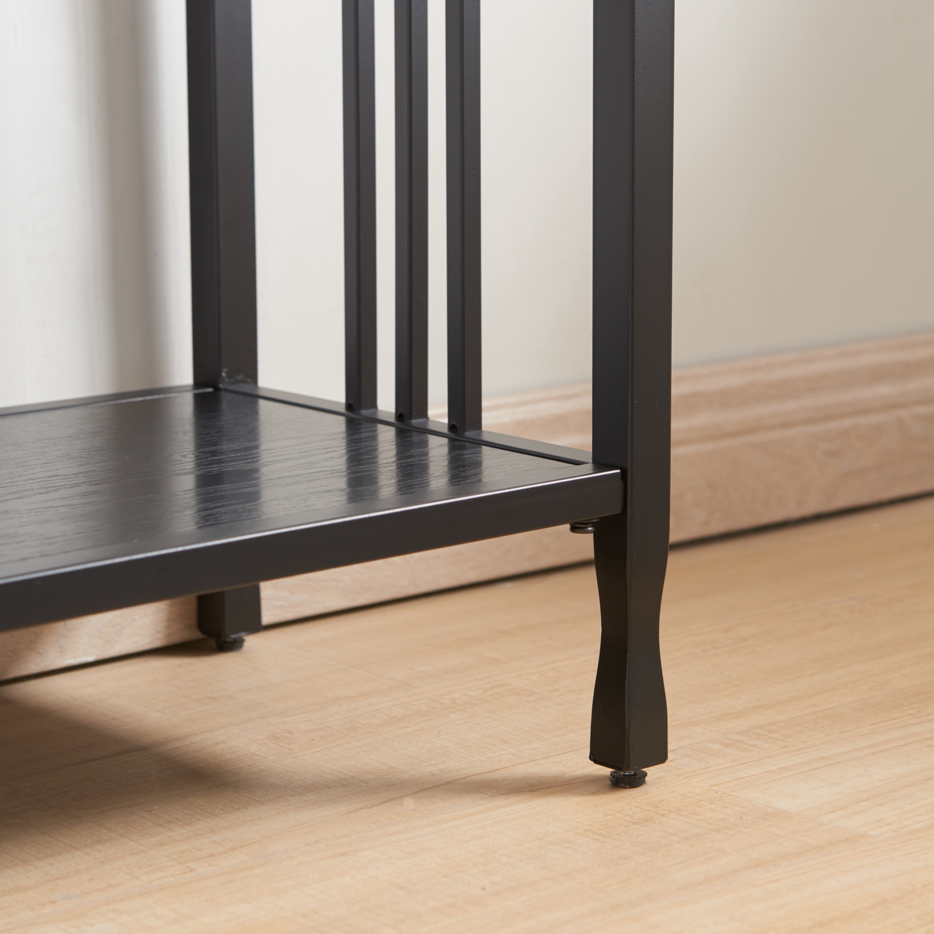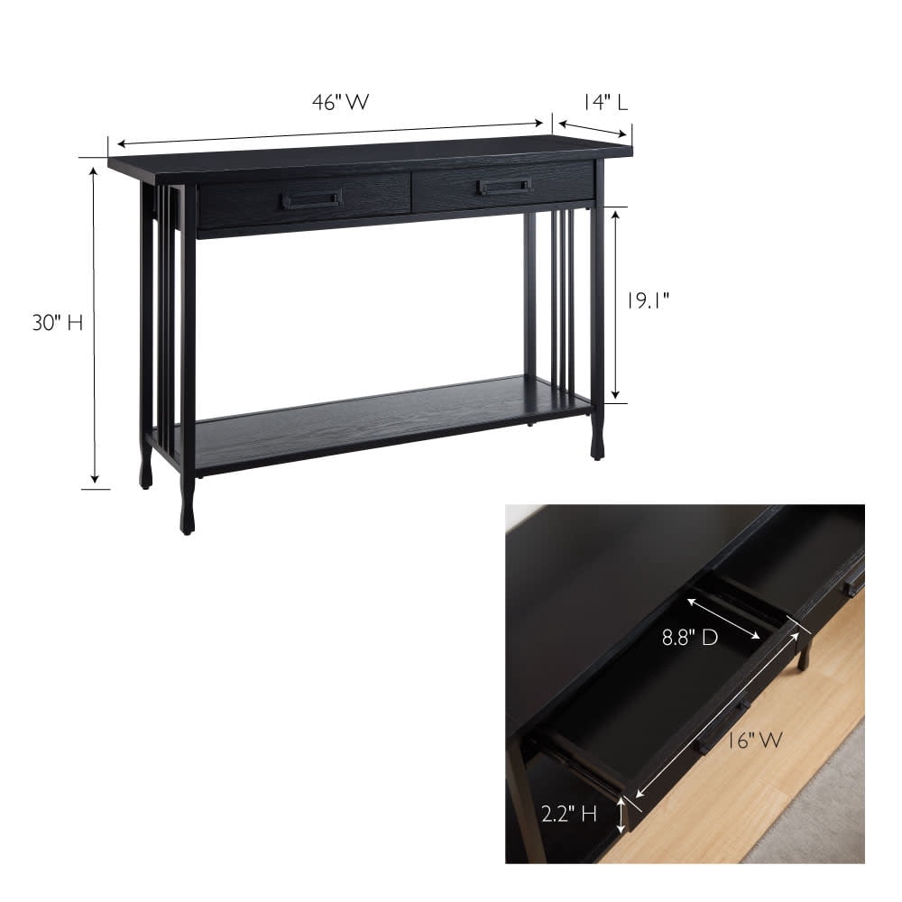 Sturdy steel and North American hardwood construction Deep black wash wood finish Blackened metal mission slats Cinched metal toe design with adjustable leveling feet Lower display shelf and two dovetailed drawers Full extension ball bearing drawer guides with custom designed drawer hardware Simple assembly in minutes Assembled Dimensions: 46 inches L x 14 inches W x 30 inches H