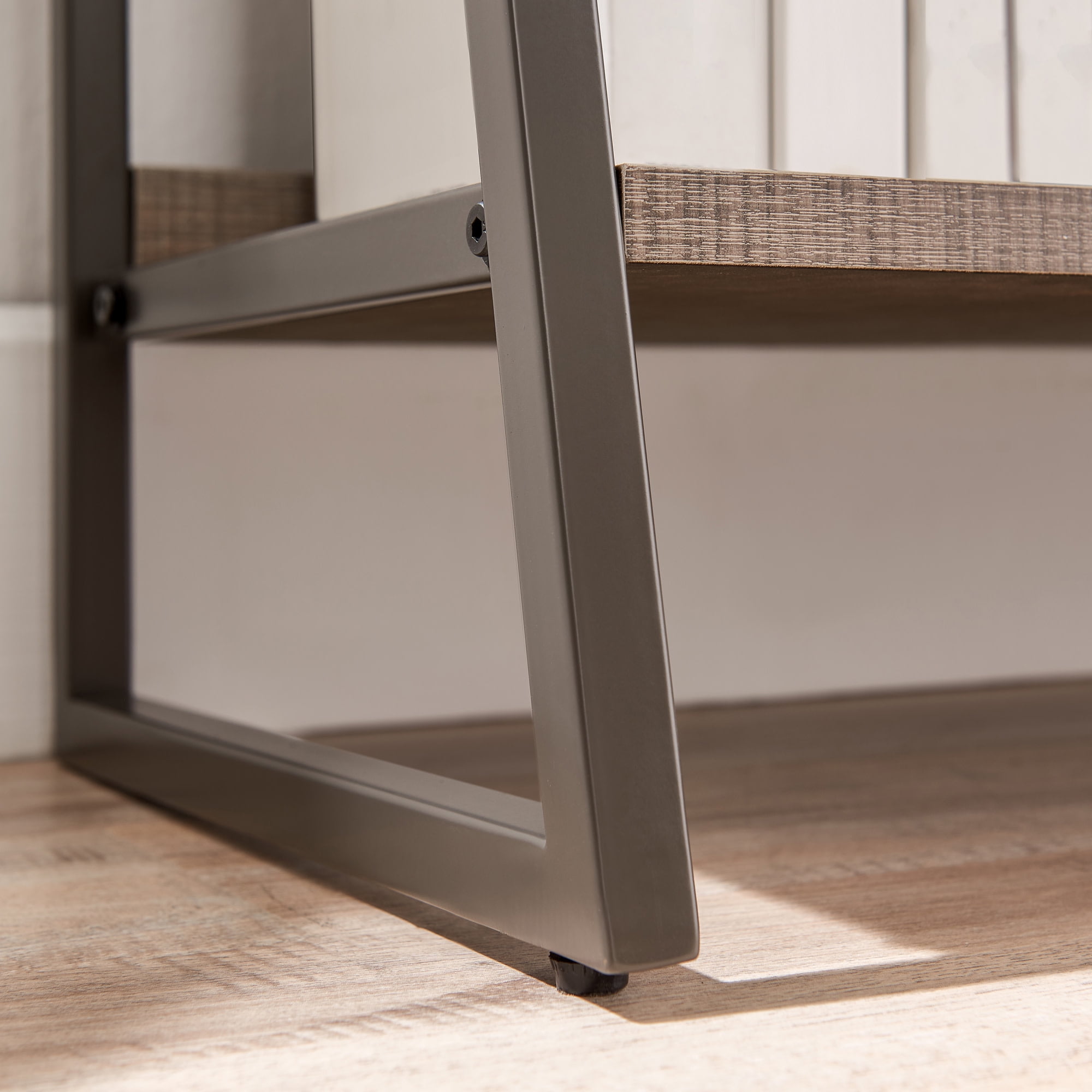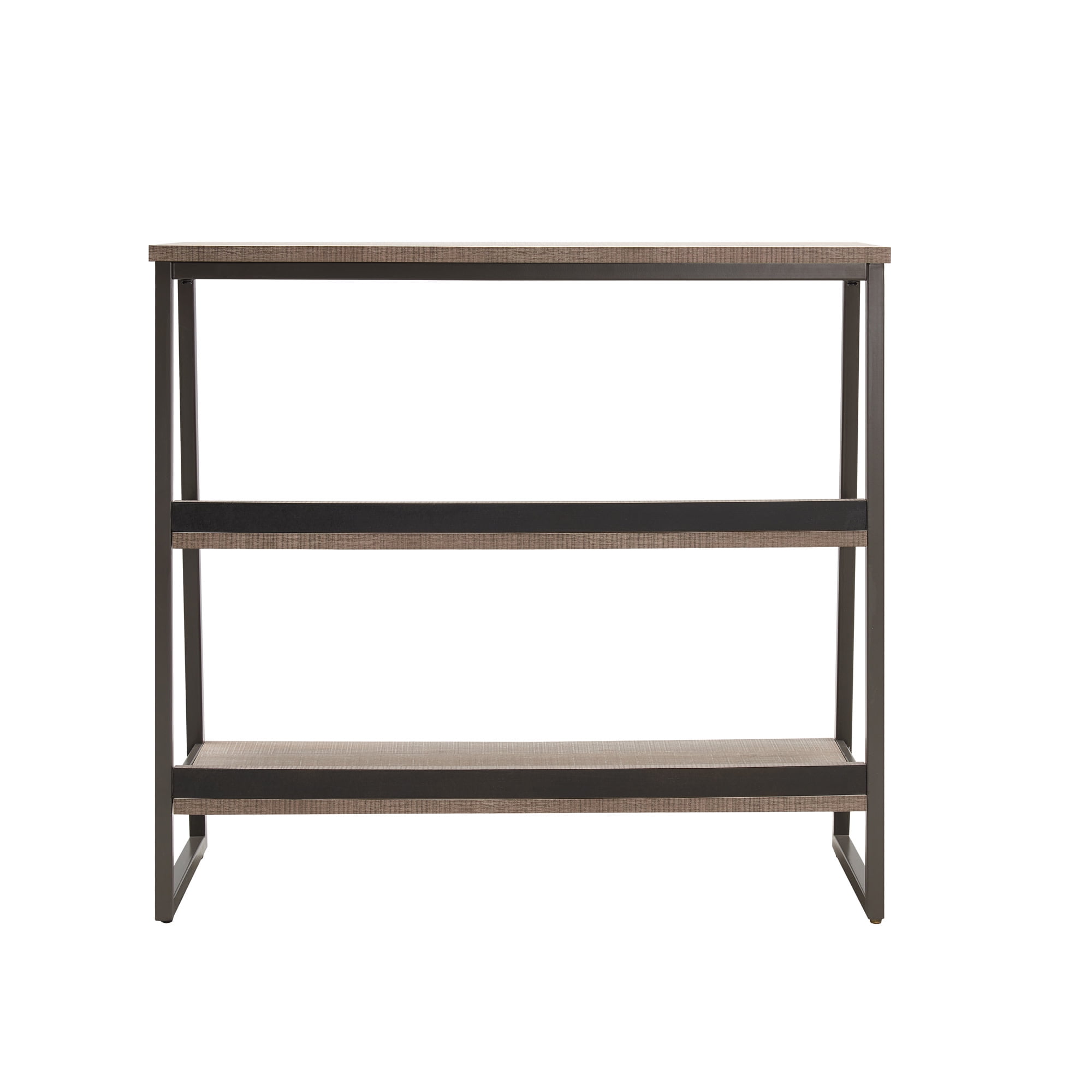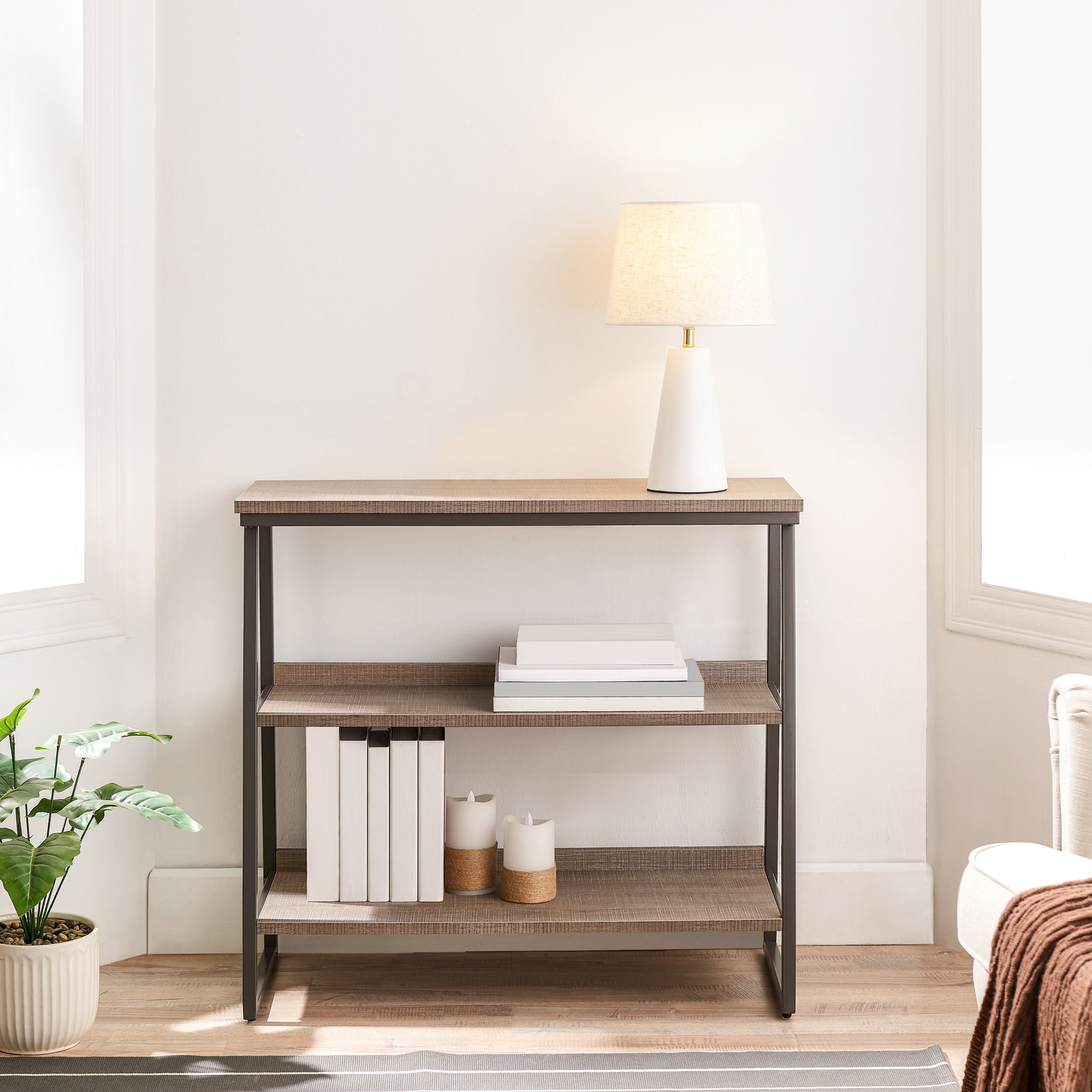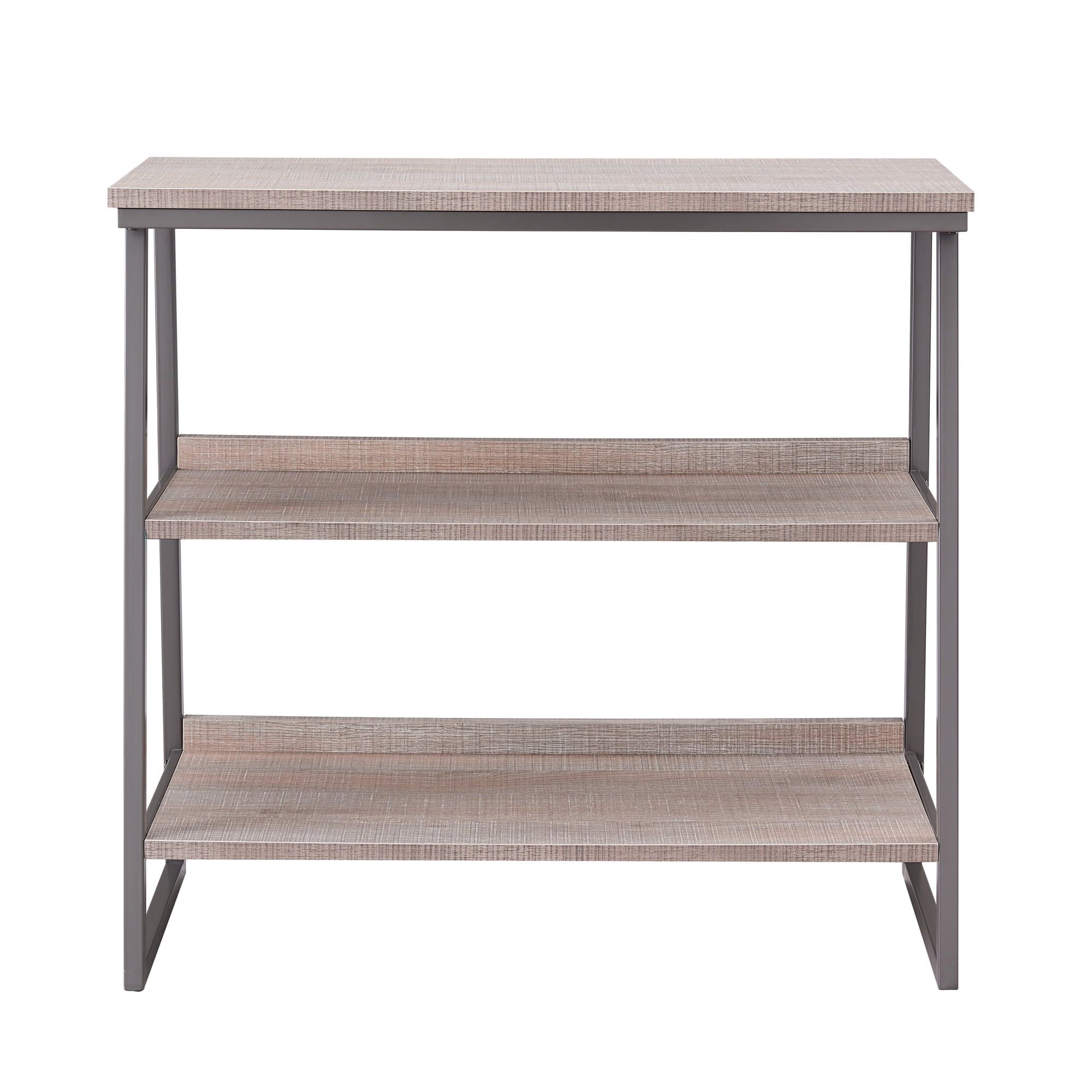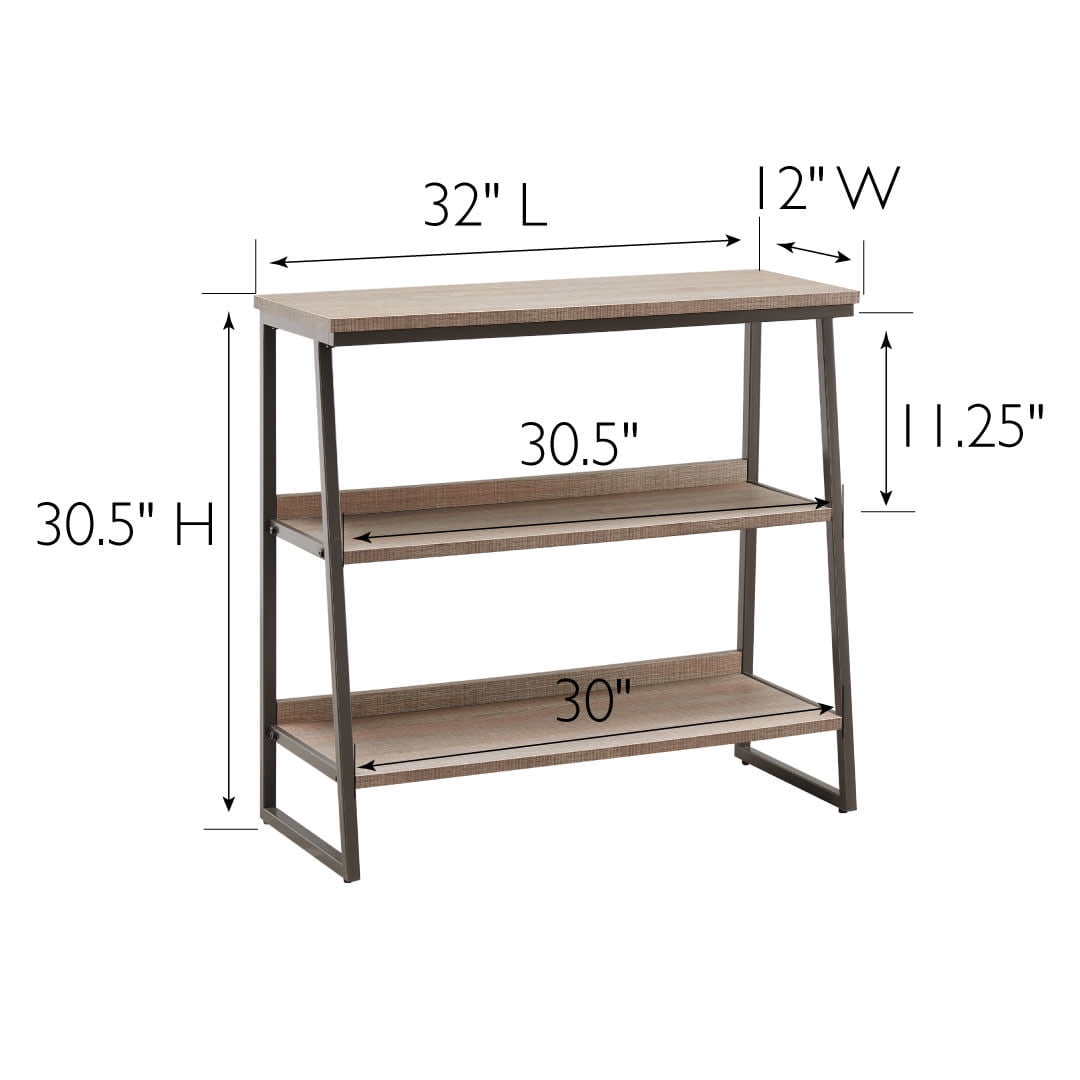 Compact Stepped Design: Measuring 32″ W x 12″ D x 30.5″ H, this space-saving bookshelf stacks three shelves in a stylish stepped layout, perfect for apartments, offices, and entryways Secure and Stable Shelving: L-shaped gallery shelves prevent items from falling off the back while enhancing structural stability, making it ideal for books, decor, and essentials Durable Mixed Materials: Sturdy gunmetal gray steel side supports contrast with roughsawn oak laminated shelves, blending rustic and industrial styles for a modern touch Quick and Easy Assembly: Designed for hassle-free setup, this bookshelf assembles in minutes with included hardware, delivering functional storage with a contemporary aesthetic Buy with Confidence: Customer satisfaction has been the priority for our Wisconsin-based company for more than 150 years; with our 1-year limited warranty, you can rest assured your purchase is risk-free