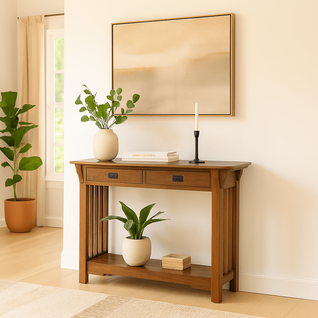 Solid Wood Construction: With sturdy North American solid hardwood construction, you will have this versatile console table for years to come Multi-Functional Entryway Table: Measuring 48 inches L x 16 inches D x 30 inches H, it is the perfect size for entryways and living rooms alike Authentic Mission Design: Classic medium oak finish console table with slatted sides and a corbel supported top for the craftsman look Match Any Style: This Mission style sofa table can work in many home design aesthetics including traditional, arts and crafts, and contemporary Easy Assembly: Pre-assembled drawer designed for a quick and seamless set-up